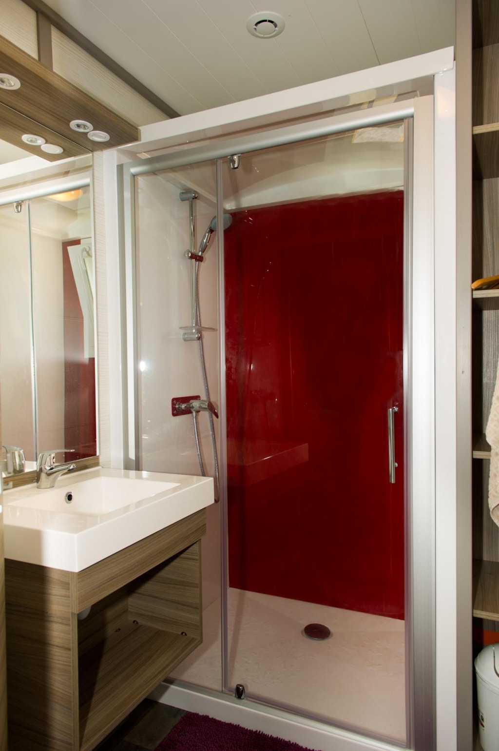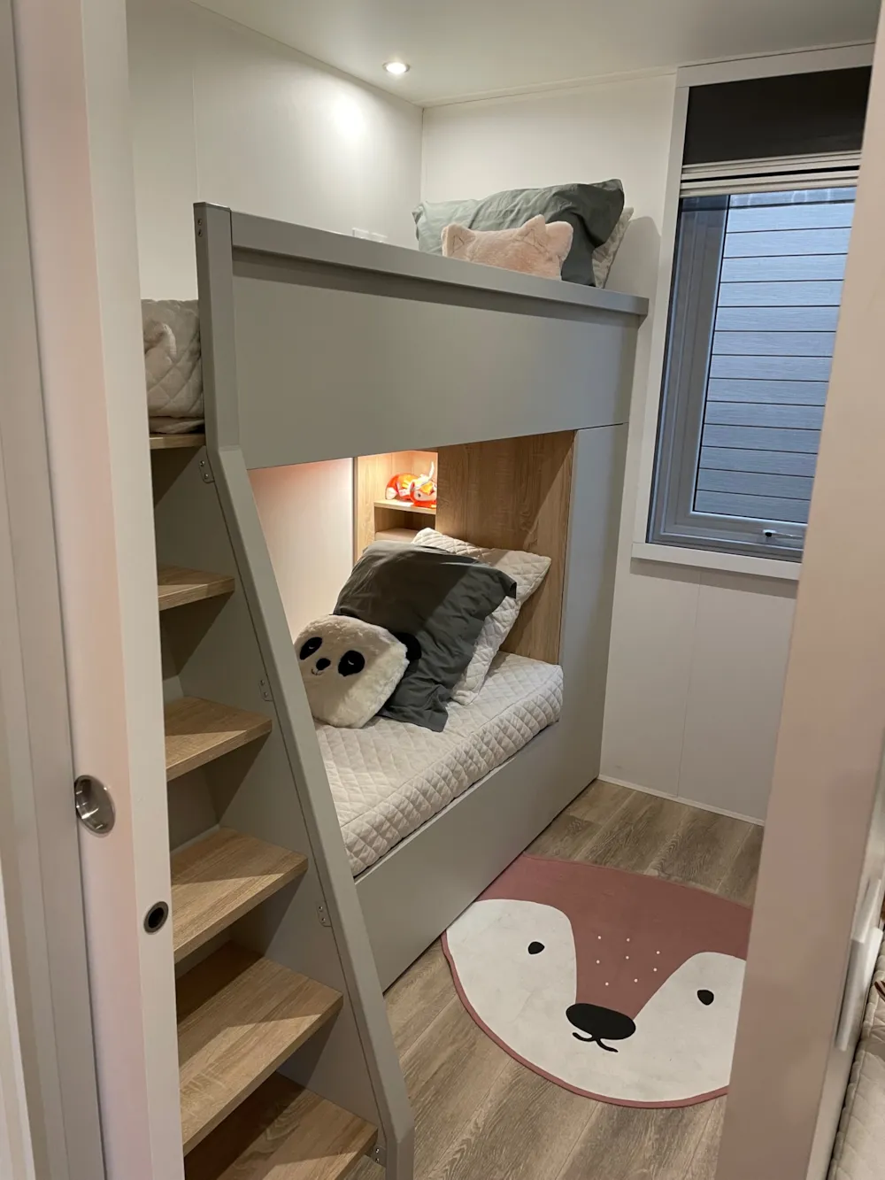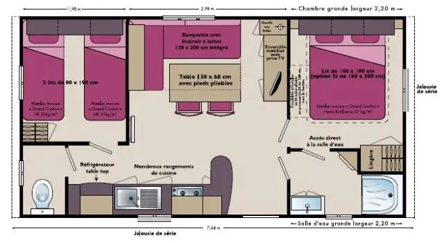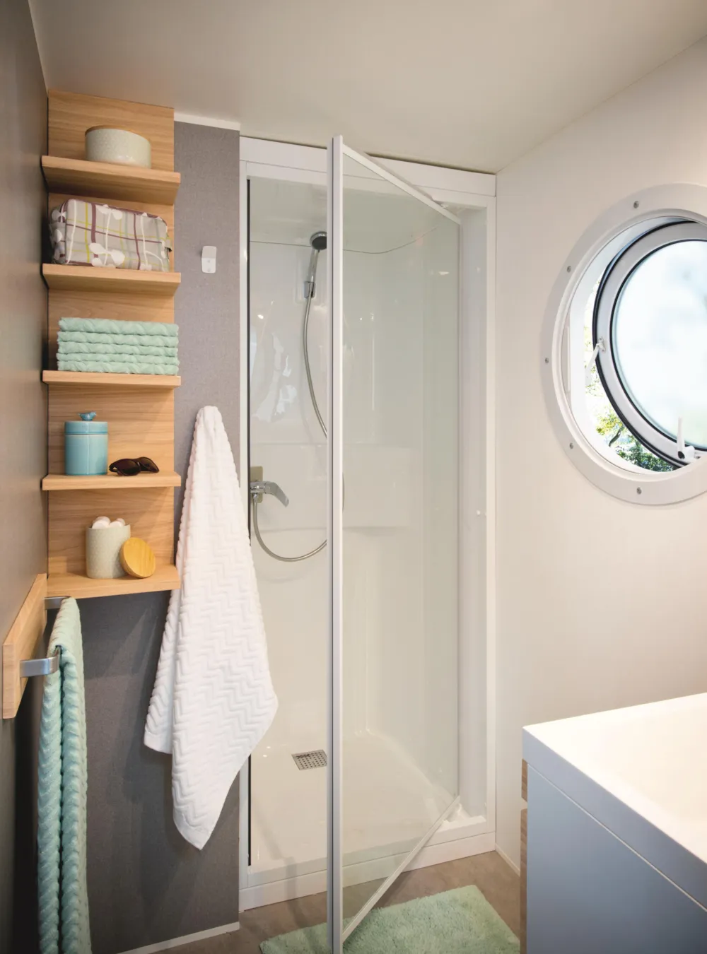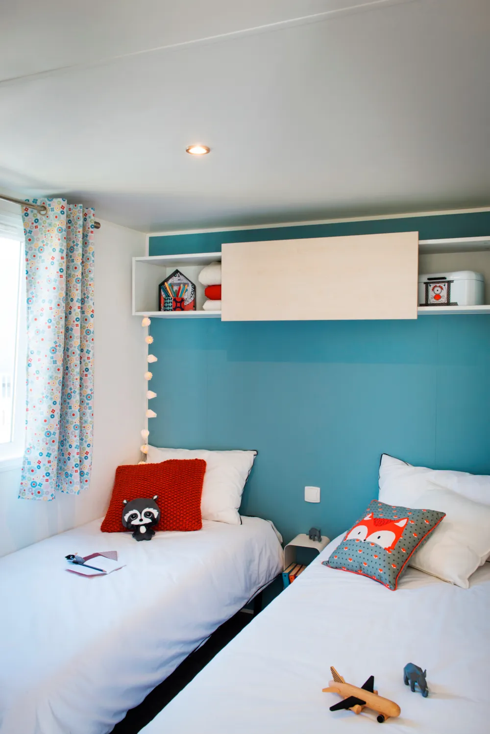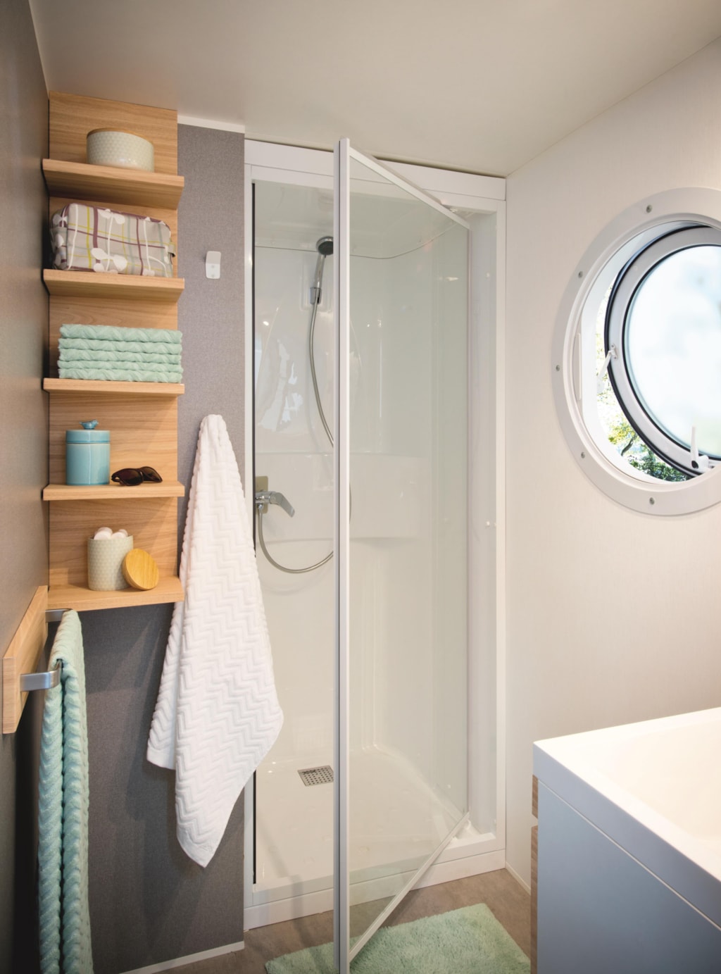 Proposé pour acceuillir les tribus, le premier mobil home d'une superficie de 40m² dispose de 3 chambres et 2 salles de bains, d'un vestiaire à l'entrée, un grand canapé et une belle chambre parentale.