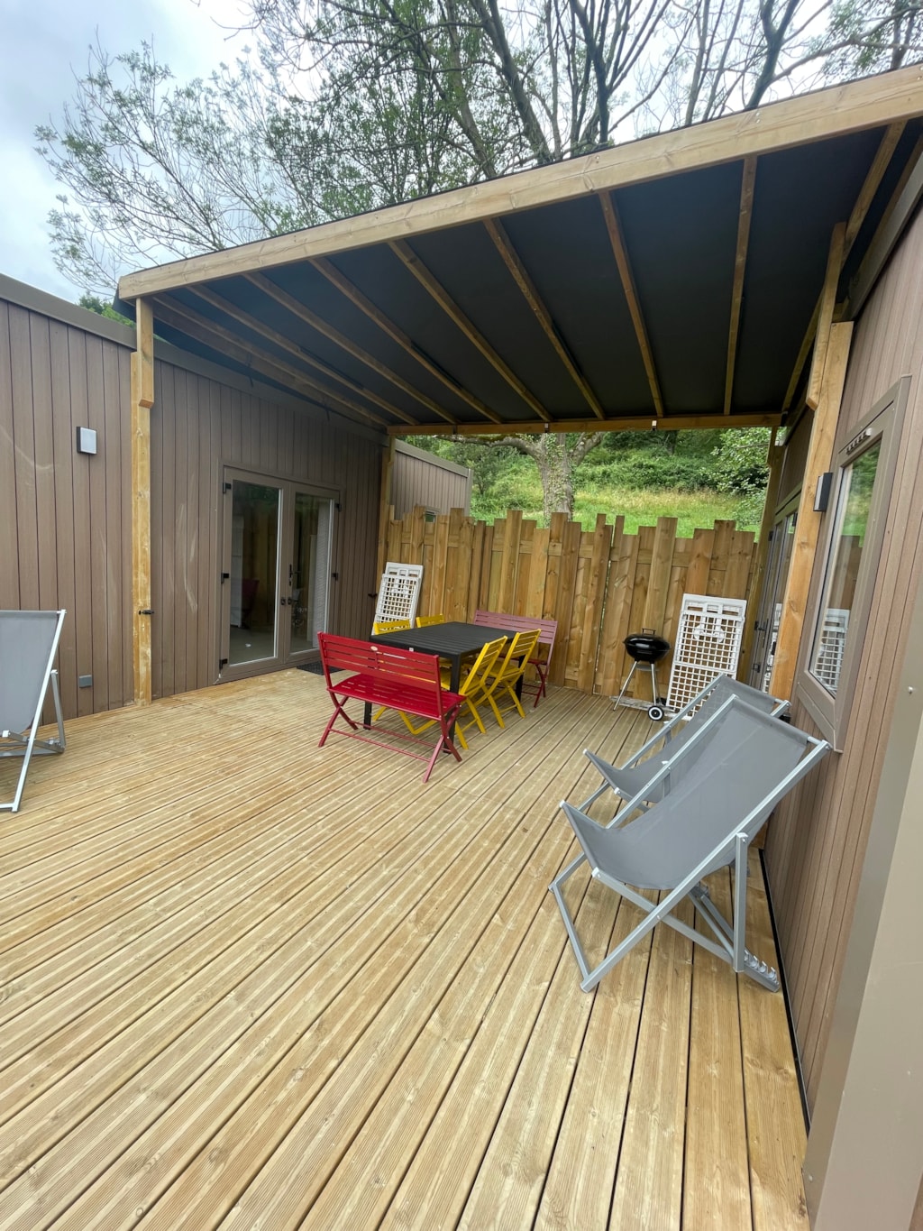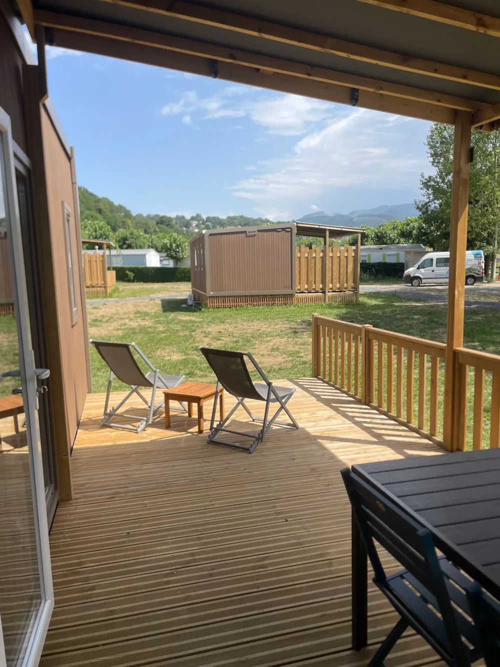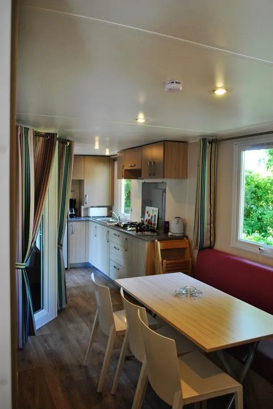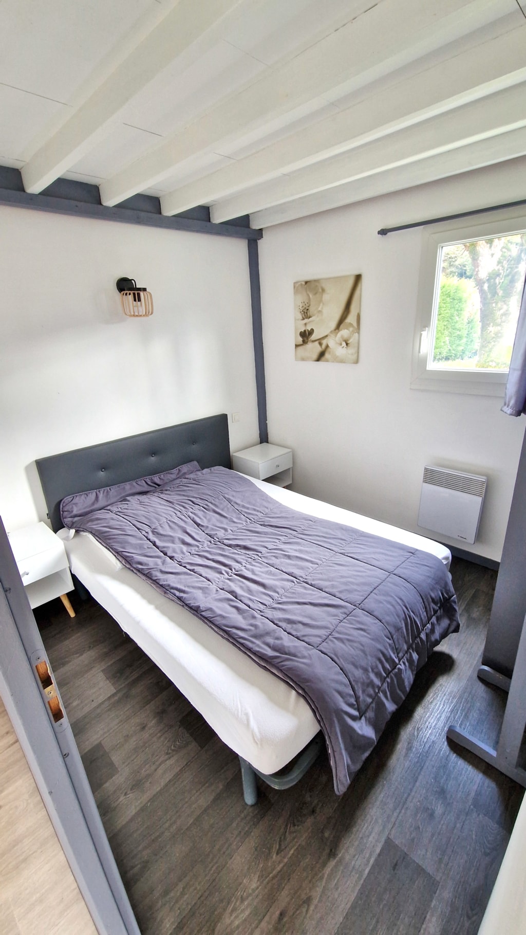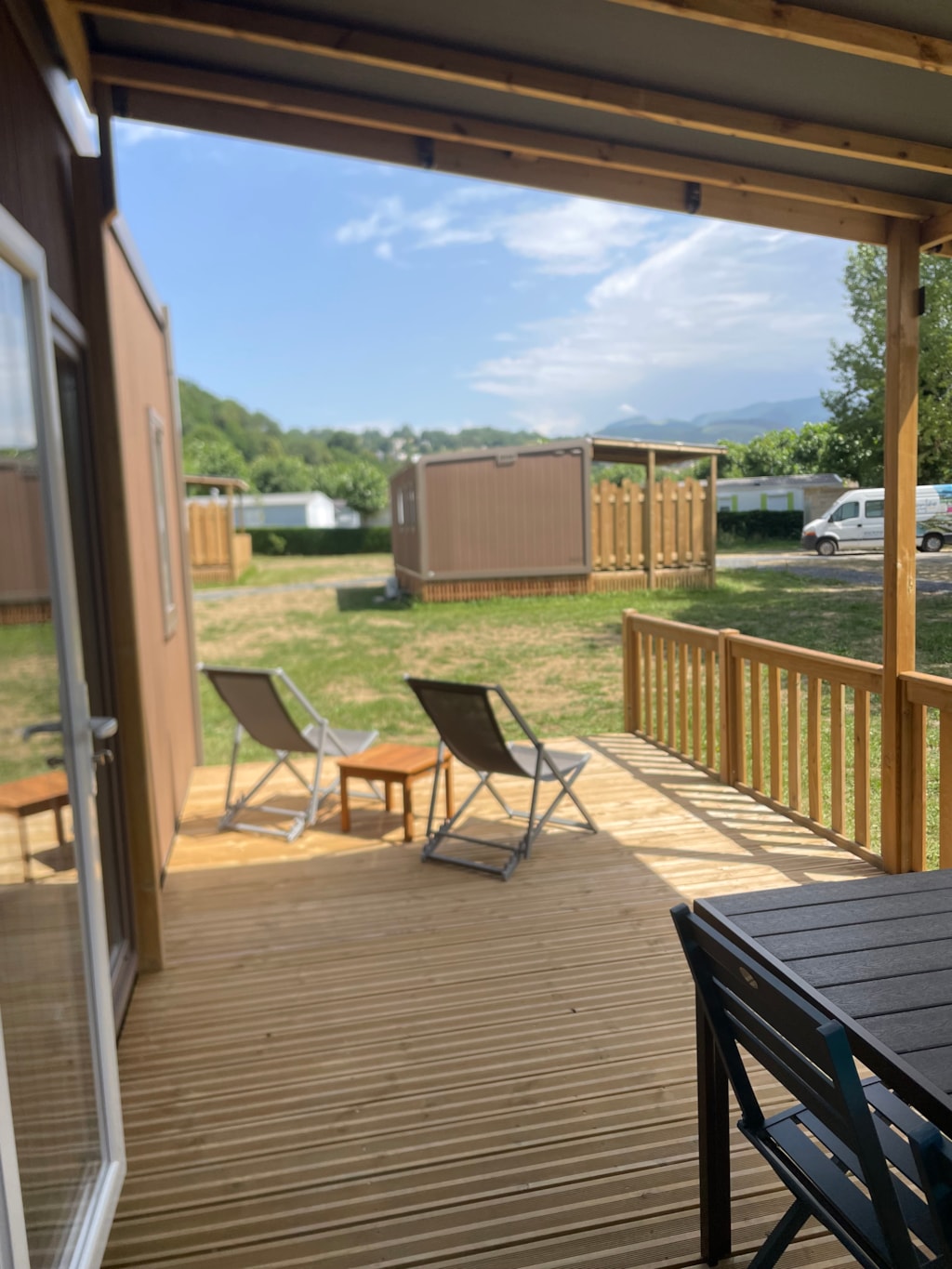 Il s'agit d'un mobil home équipé d'une chambre, salle de bain avec WC et une partie centrale avec cuisine et séjour. . Ils sont situés sur des parcelles ombragées, avec une terrasse en bois équipée de transat barbecue et d'une table et chaises