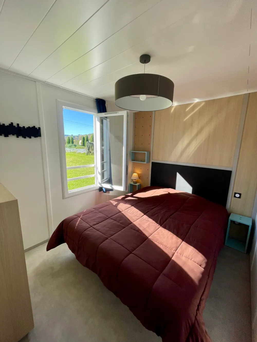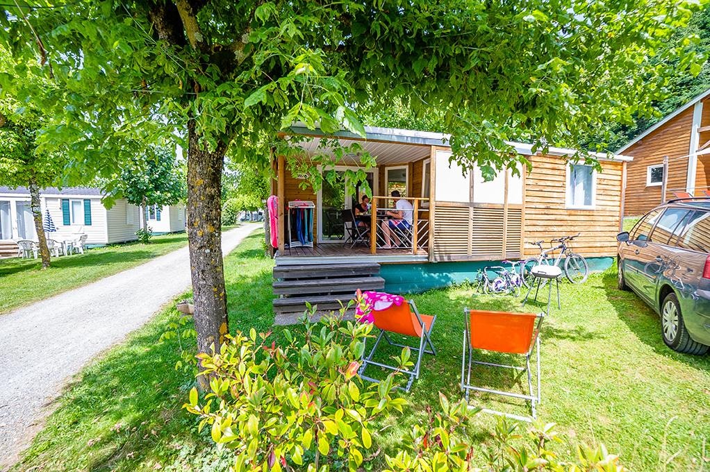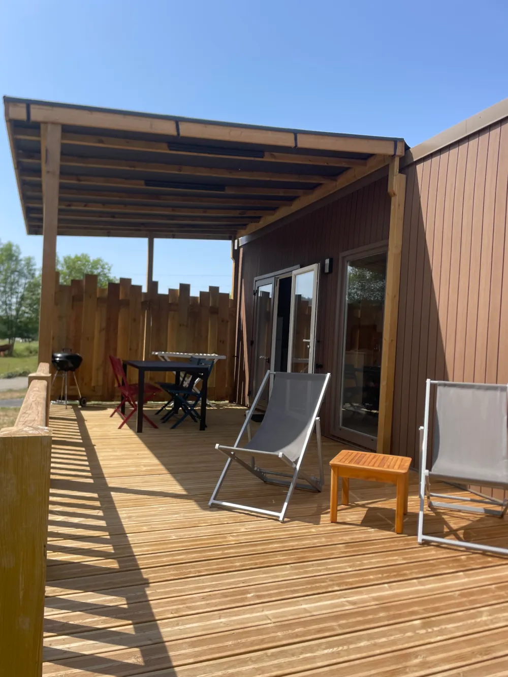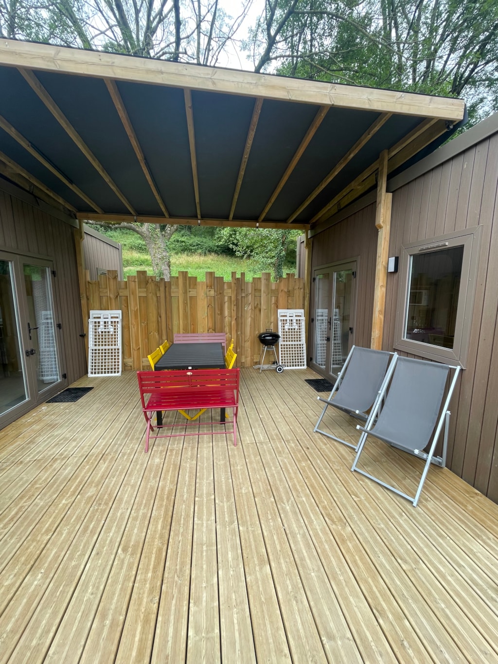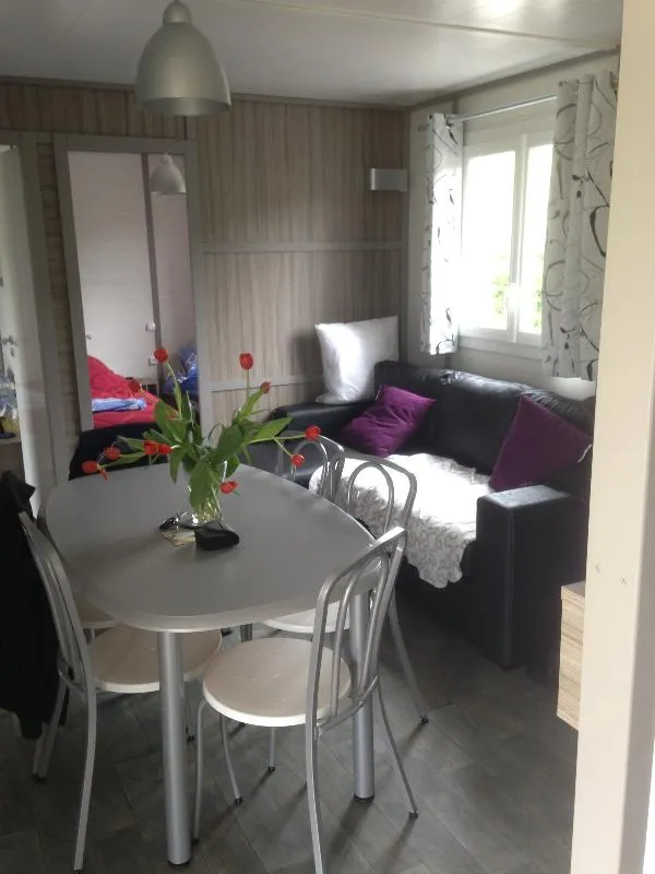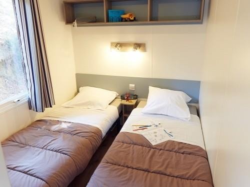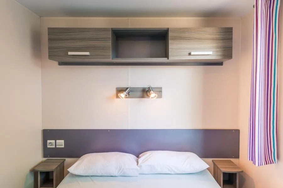 Il s'agit d'un mobil home équipé d'une chambre, salle de bain avec WC et une partie centrale avec cuisine et séjour. . Ils sont situés sur des parcelles ombragées, avec une terrasse en bois équipée de transat barbecue et d'une table et chaises