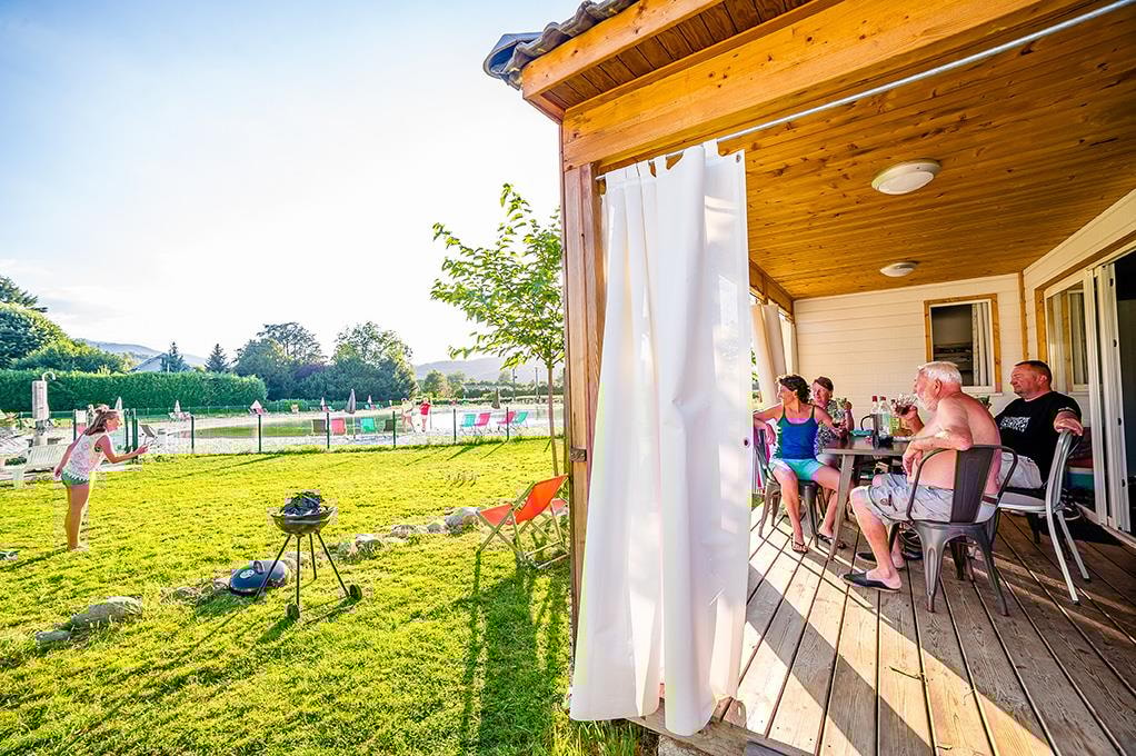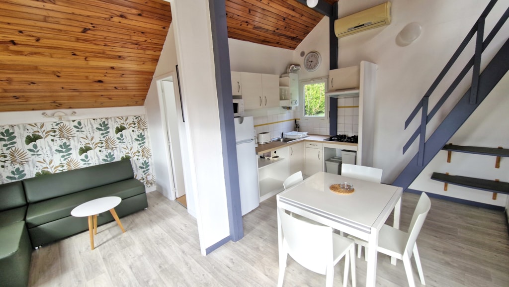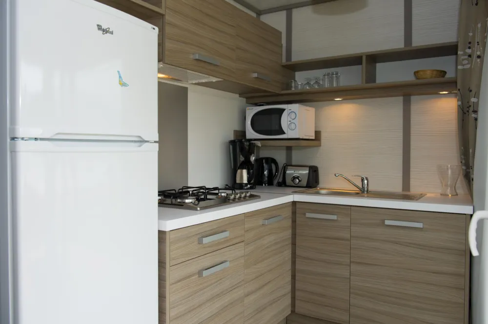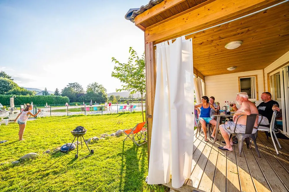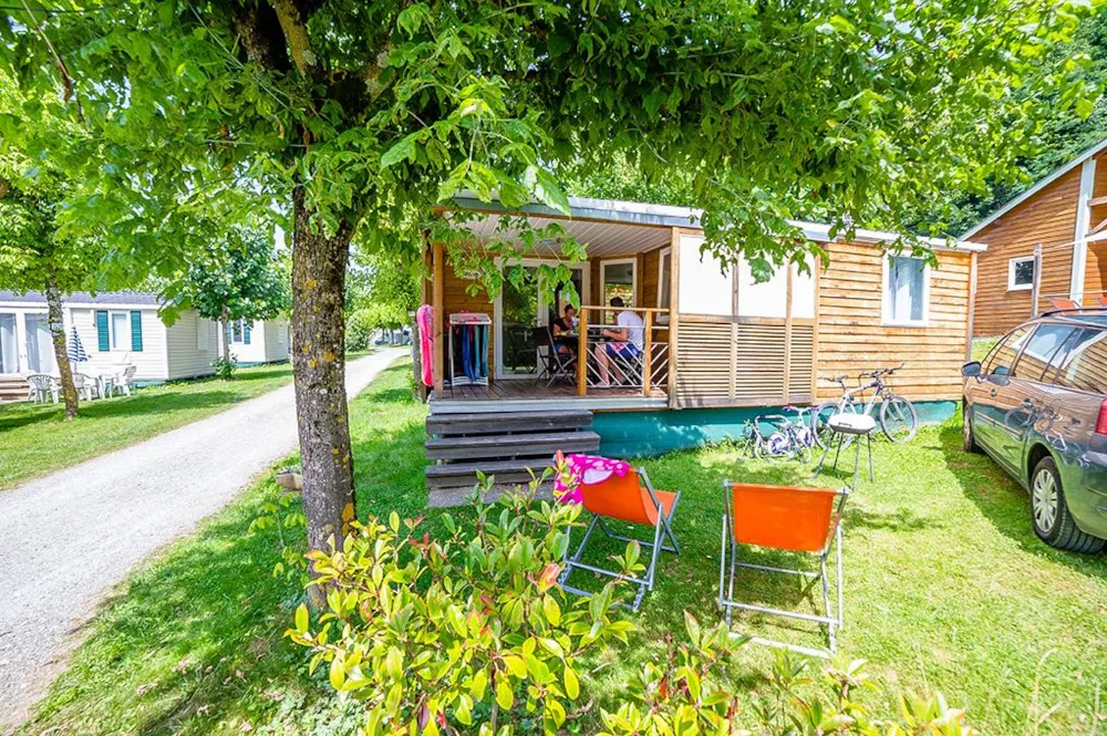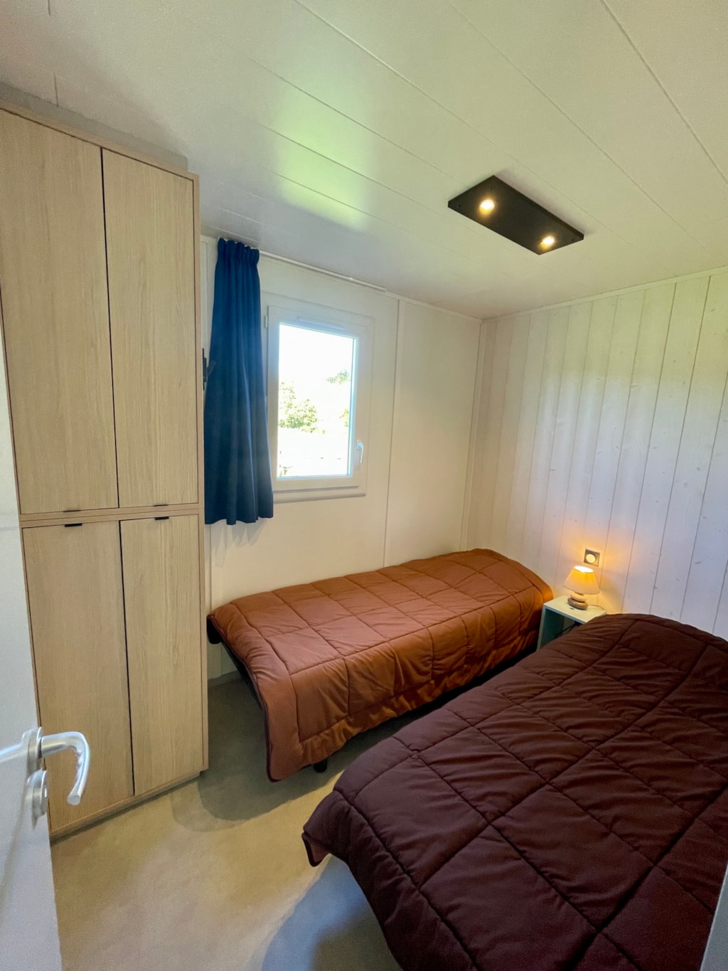 Il s'agit d'un mobil home équipé d'une chambre, salle de bain avec WC et une partie centrale avec cuisine et séjour. . Ils sont situés sur des parcelles ombragées, avec une terrasse en bois équipée de transat barbecue et d'une table et chaises
