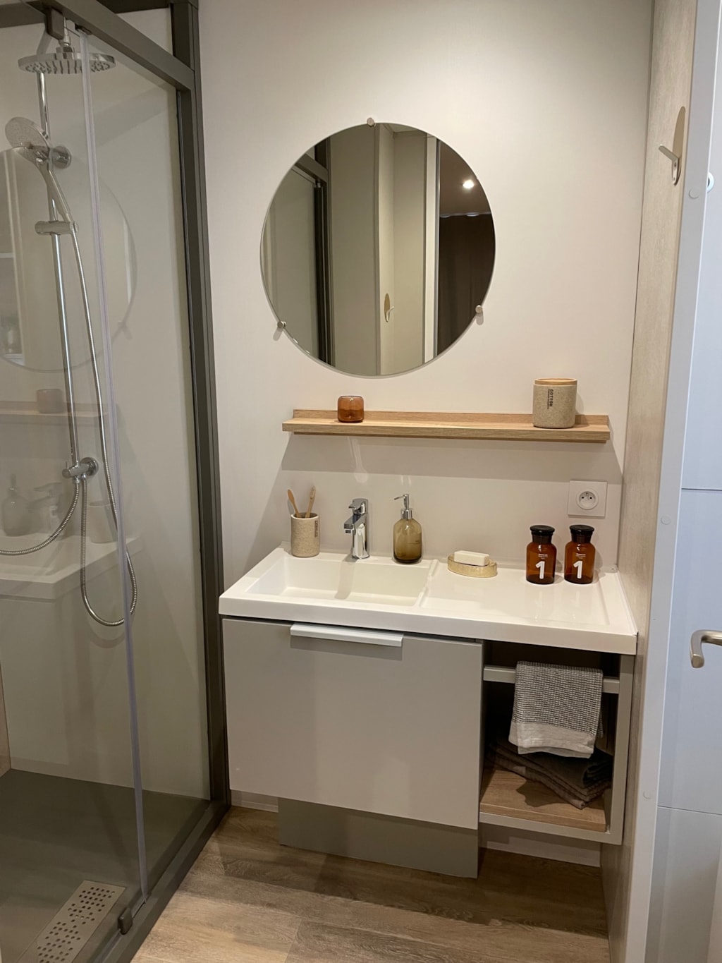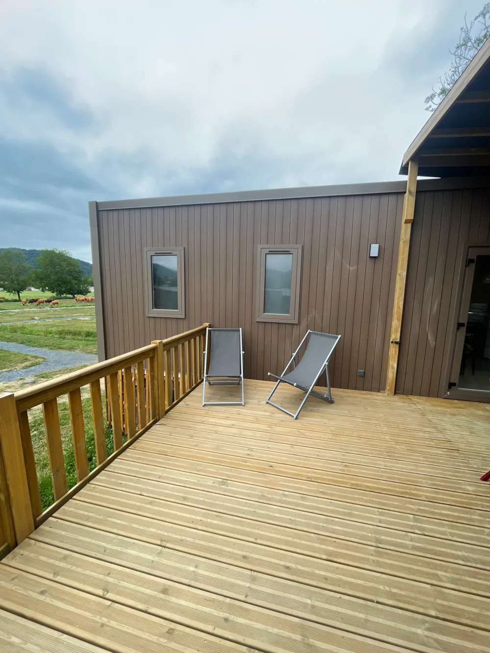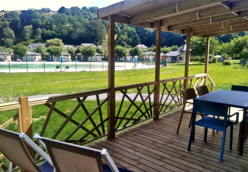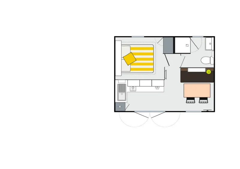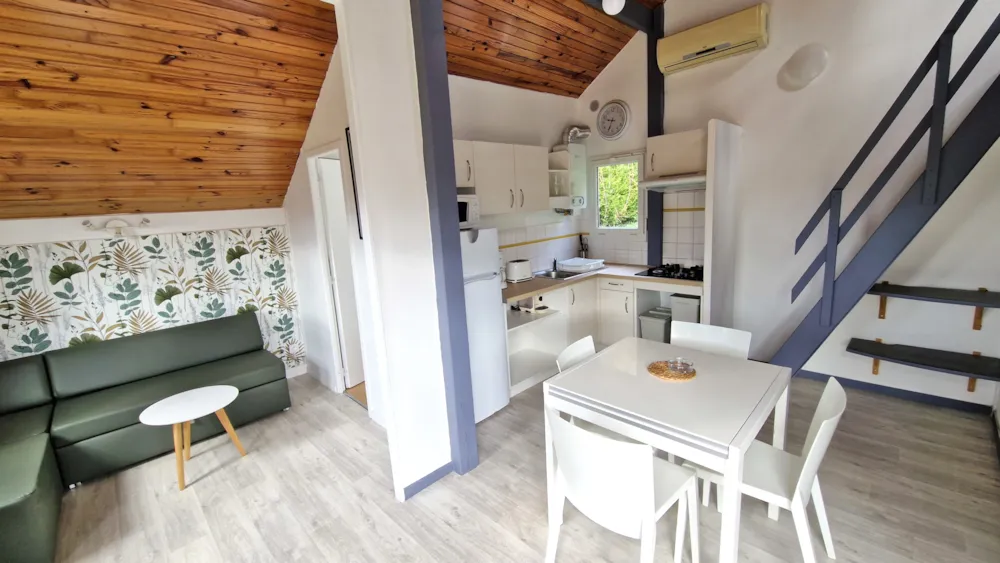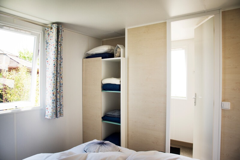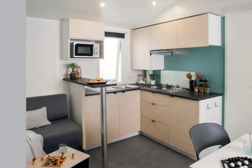 Il s'agit d'un mobil home équipé d'une chambre, salle de bain avec WC et une partie centrale avec cuisine et séjour. . Ils sont situés sur des parcelles ombragées, avec une terrasse en bois équipée de transat barbecue et d'une table et chaises