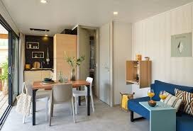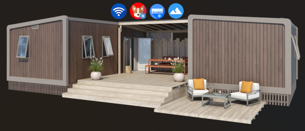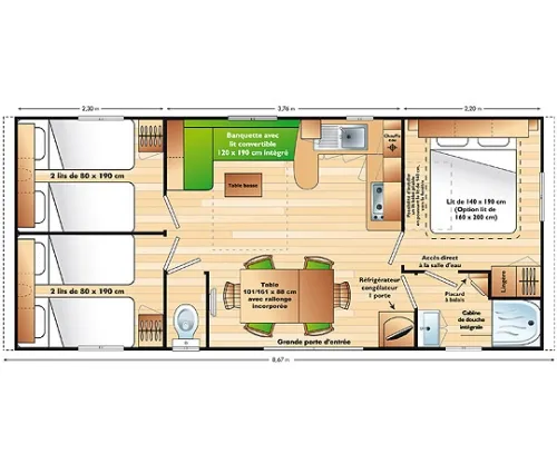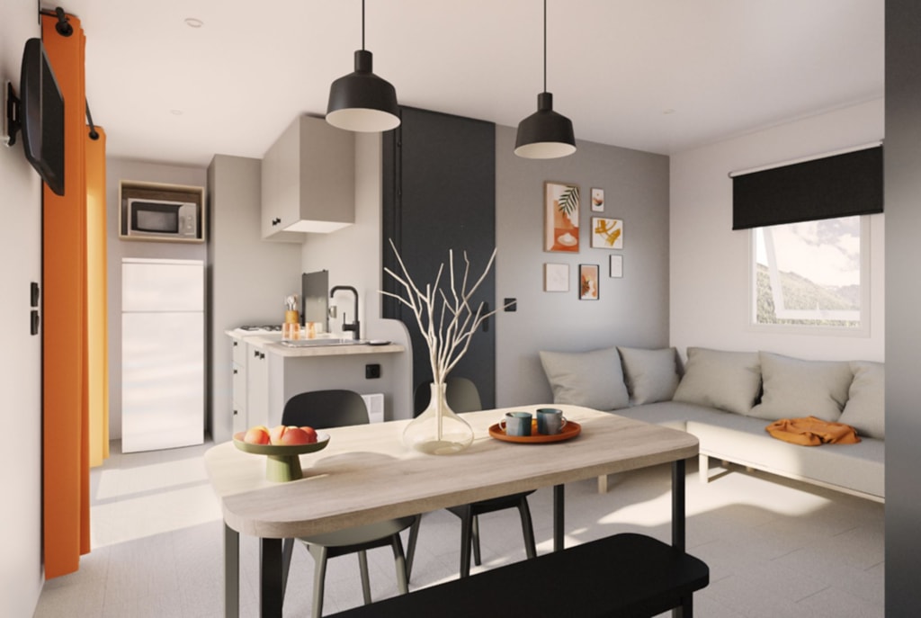 Il s'agit des mobil homes du nouveau quartier piéton pré long. Ces hébergements d'une superficie de 29m² diposent des points forts suivants: