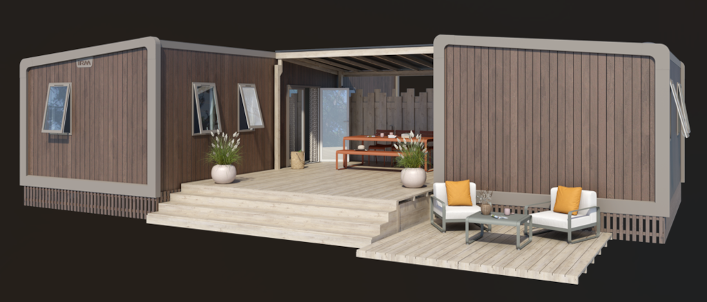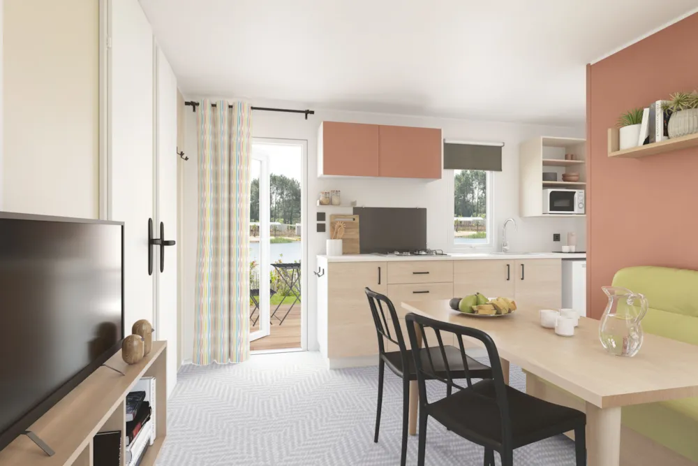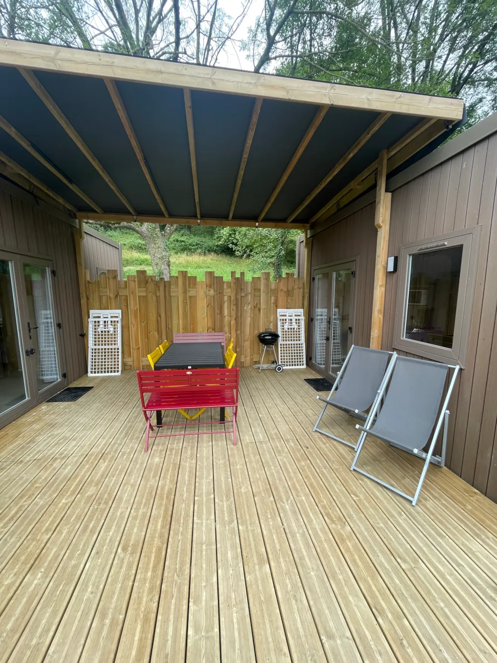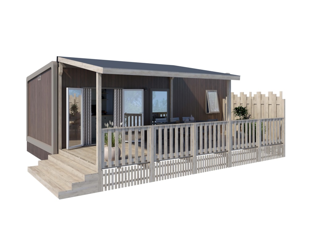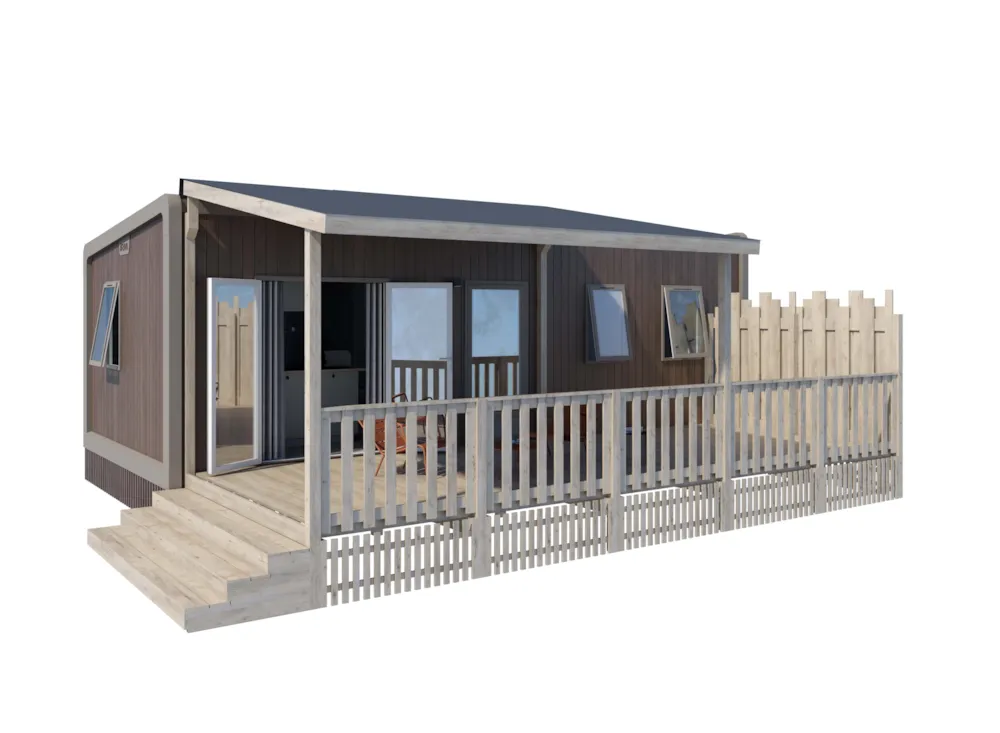 Il s'agit de mobil home en bois . Cette nouvelle conception intègre parfaitement une terrasse couverte équipée qui peut être ouverte ou pas avec des panneaux coulissants. Mobil home avec cuisine équipée, 2 chambres, salle de bain et WC.