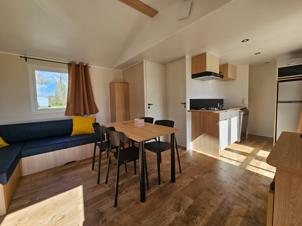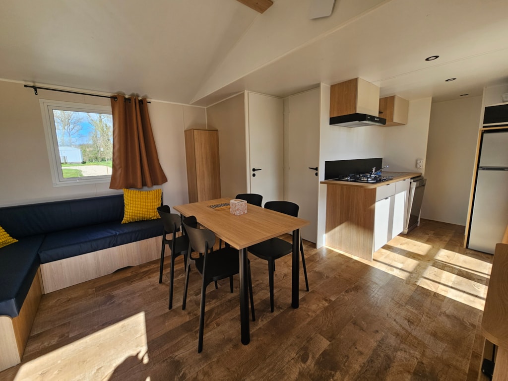 Ausgestattetes Mobilheim 32 m2 - 4/6 Schlafplätze Küche: ausgestattet mit Kochplatten, Mikrowellenofen und einem Kühlschrank/Gefrierfach Wohn- und Esszimmer mit einer Schlafcouch Badezimmer mit Dusche, separates WC Zimmer 1 : 1 Bett für 2 Personen (140x190) Zimmer 2 : 2 Betten für 1 Person (80x190) Bettdecken zur Verfügung gestellt Reinigungsutensilien vorhanden Holzterrasse und Gartenmöbel.