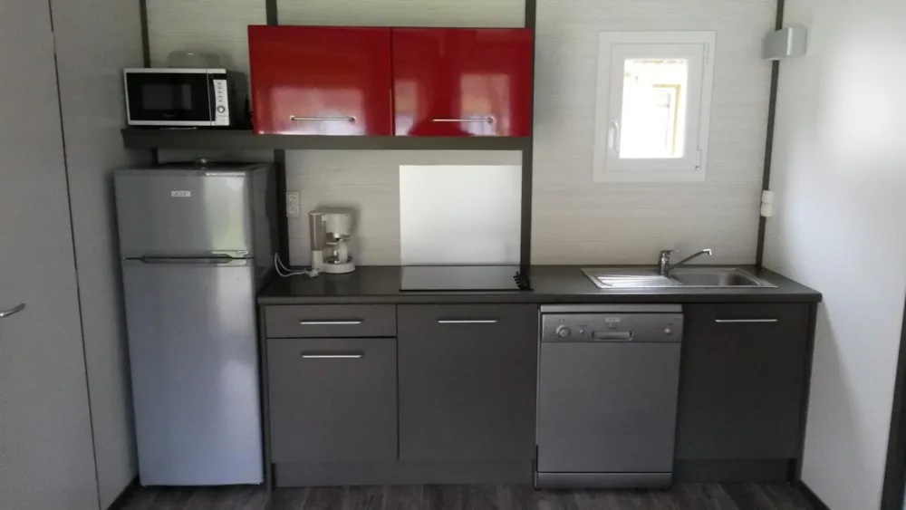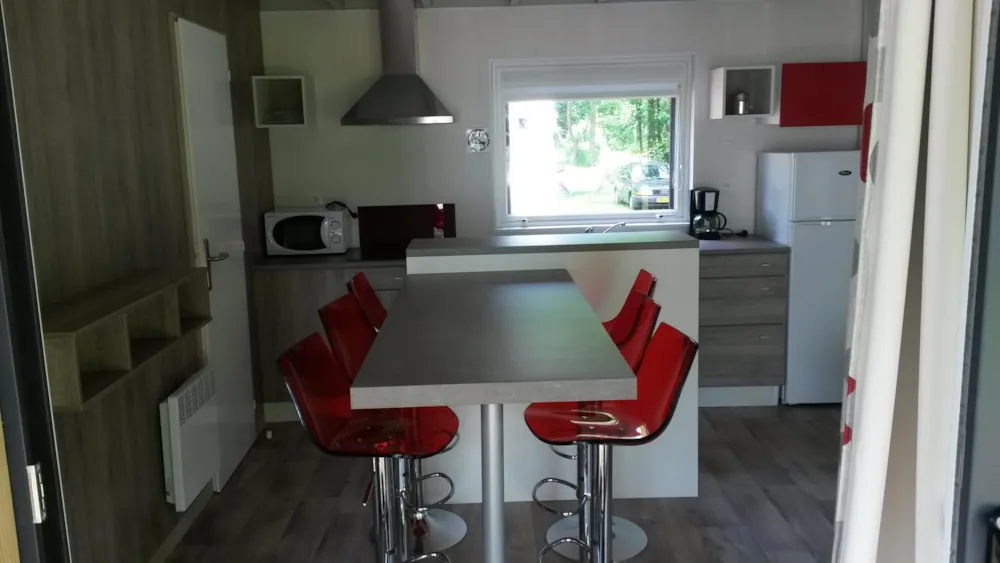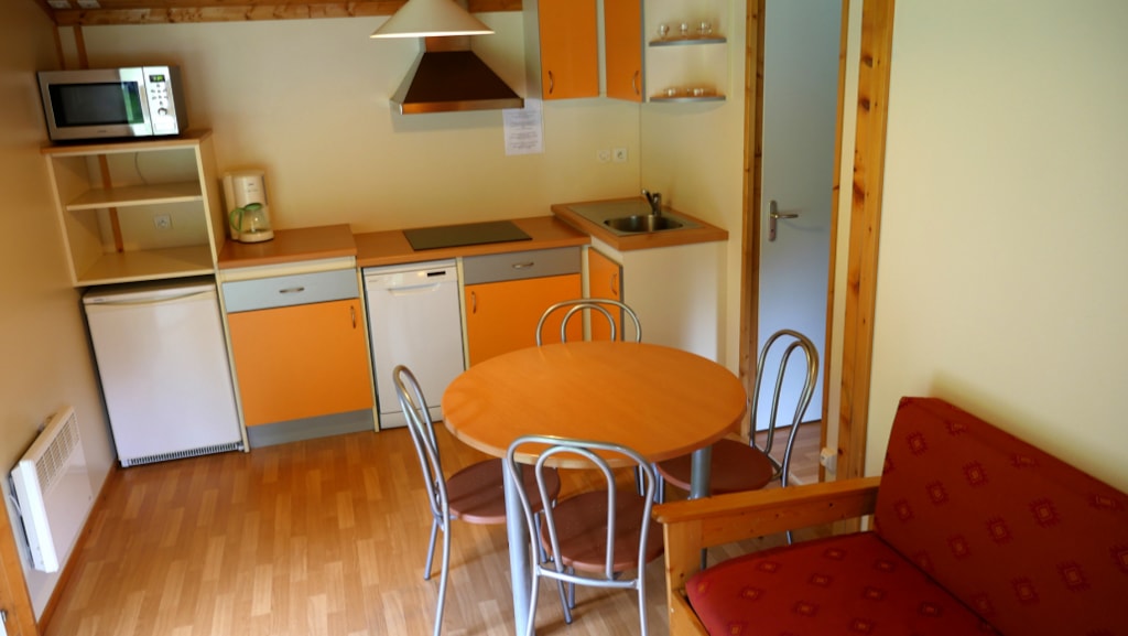 Chalet mit überdachter Terasse und zweckmäßig ausgestatteter Küche.