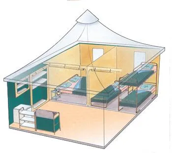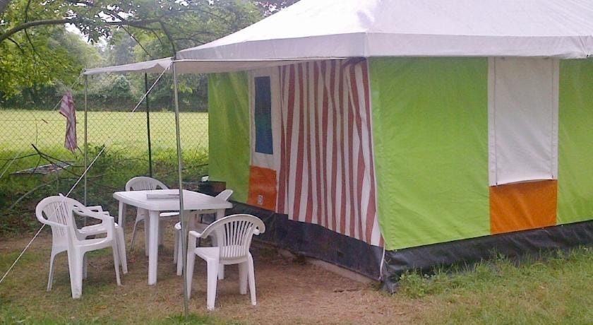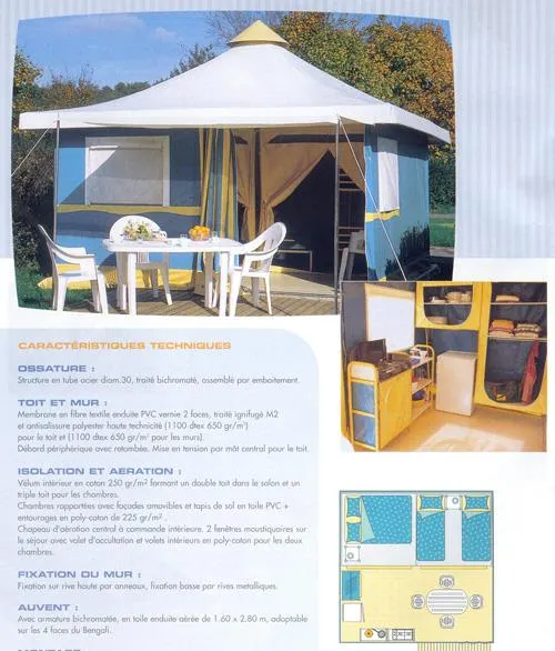 Bungalow-toile de 4*4 mètres, 2 chambres avec lit et sommier à lattes, sans eau courante, équipé de frigo, plaque de gaz, vaisselle fournie.