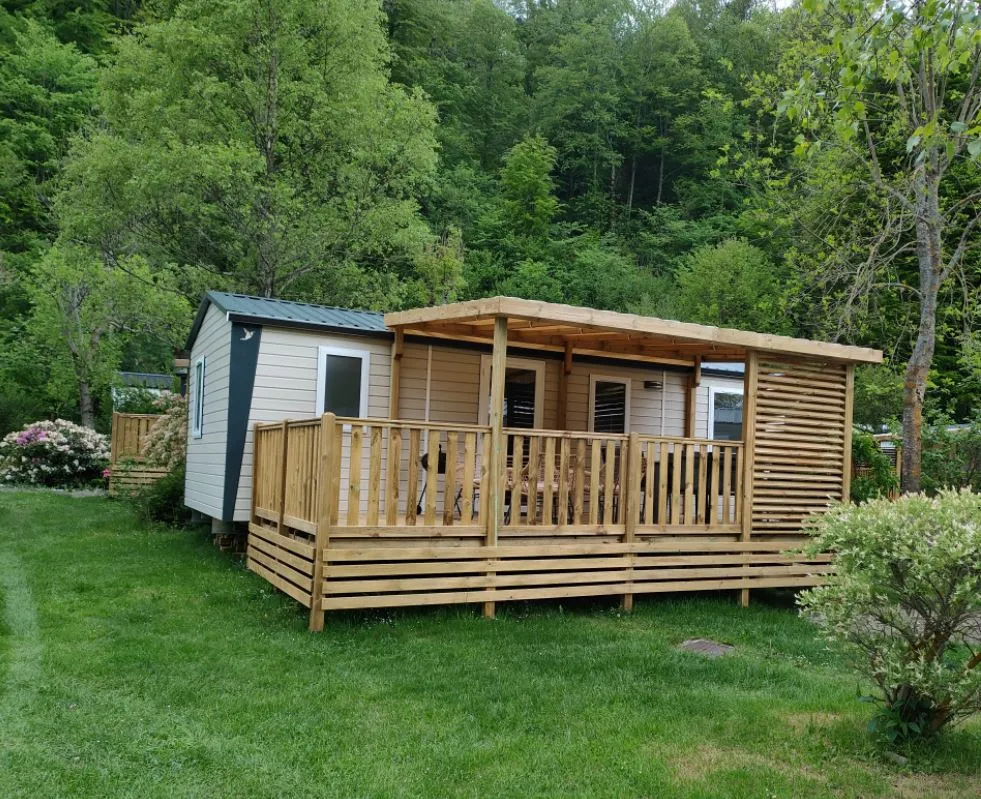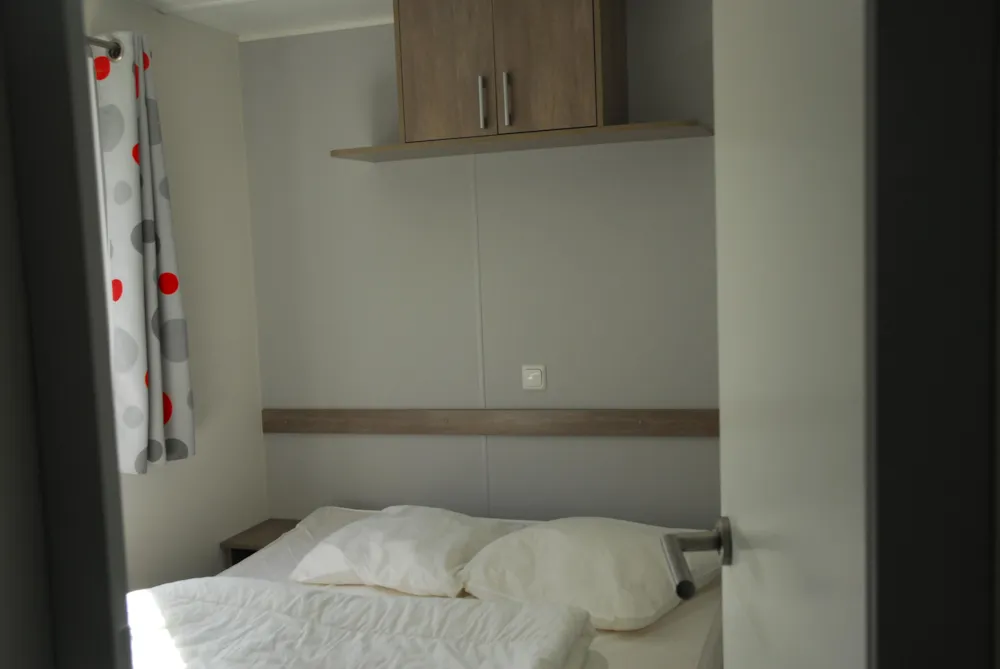 Einige unserer 2 Schlafzimmer haben 1 Schlafzimmer (1 Doppelbett) + 1 Schlafzimmer (3 Einzelbetten), für diese Art von Mobilheim kontaktieren Sie uns bitte unter info@camping-pyrenees-natura.com