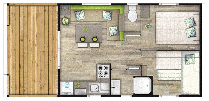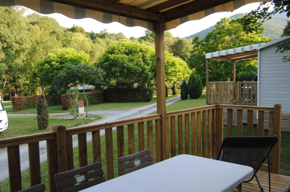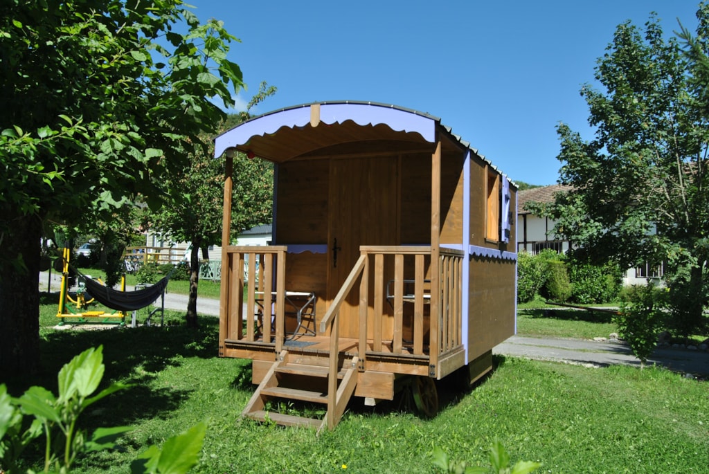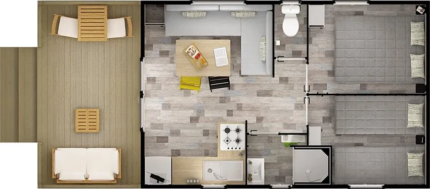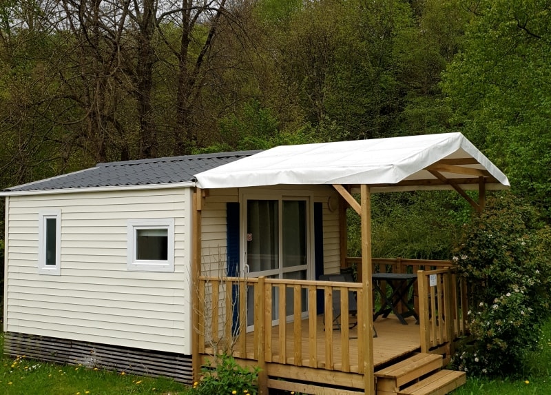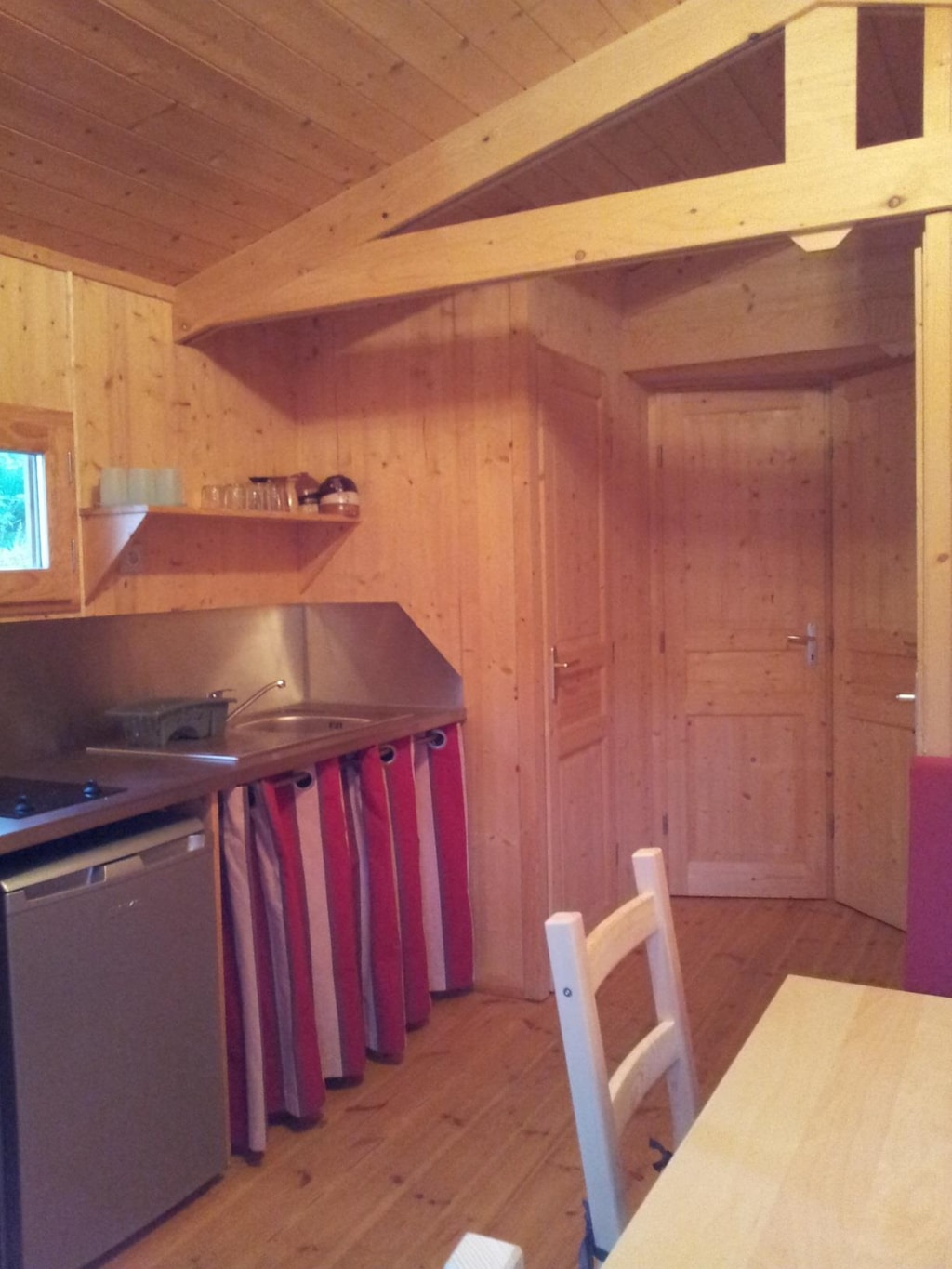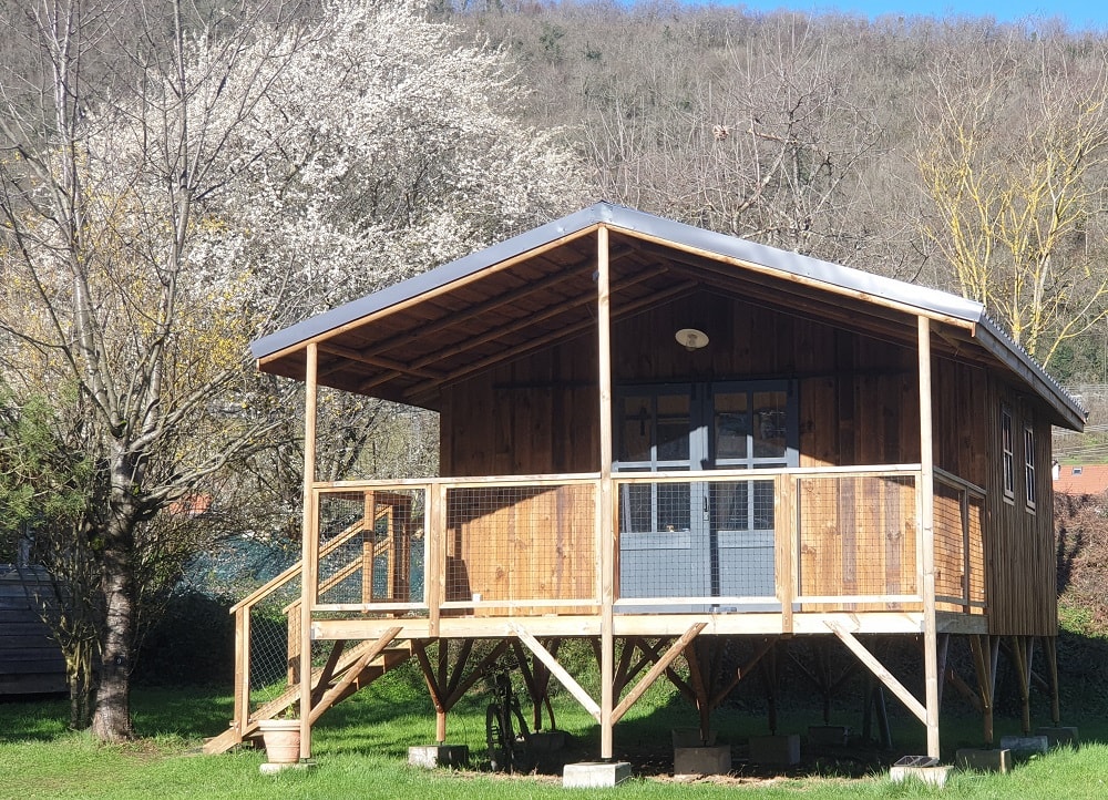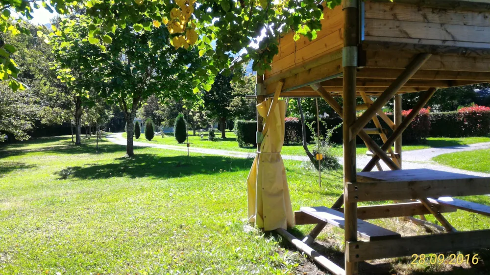 Auf einem Holzboden, Zugang über eine Leiter, darunter ein Picknicktisch für Ihre Mahlzeiten und Entspannungspausen und ein verschiebbarer Sichtschutz, mit dem Sie Ihren eigenen Privatsphärebereich schaffen können.