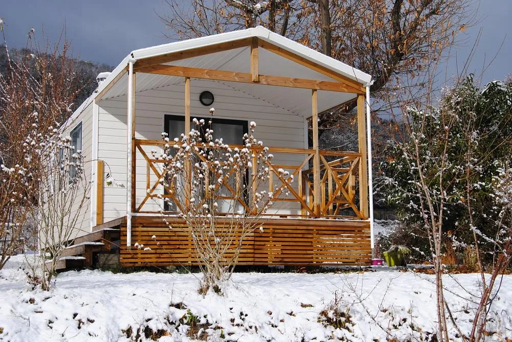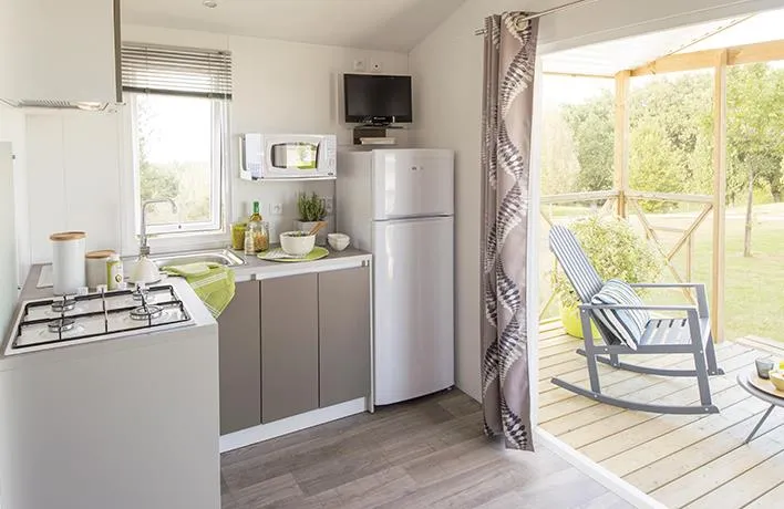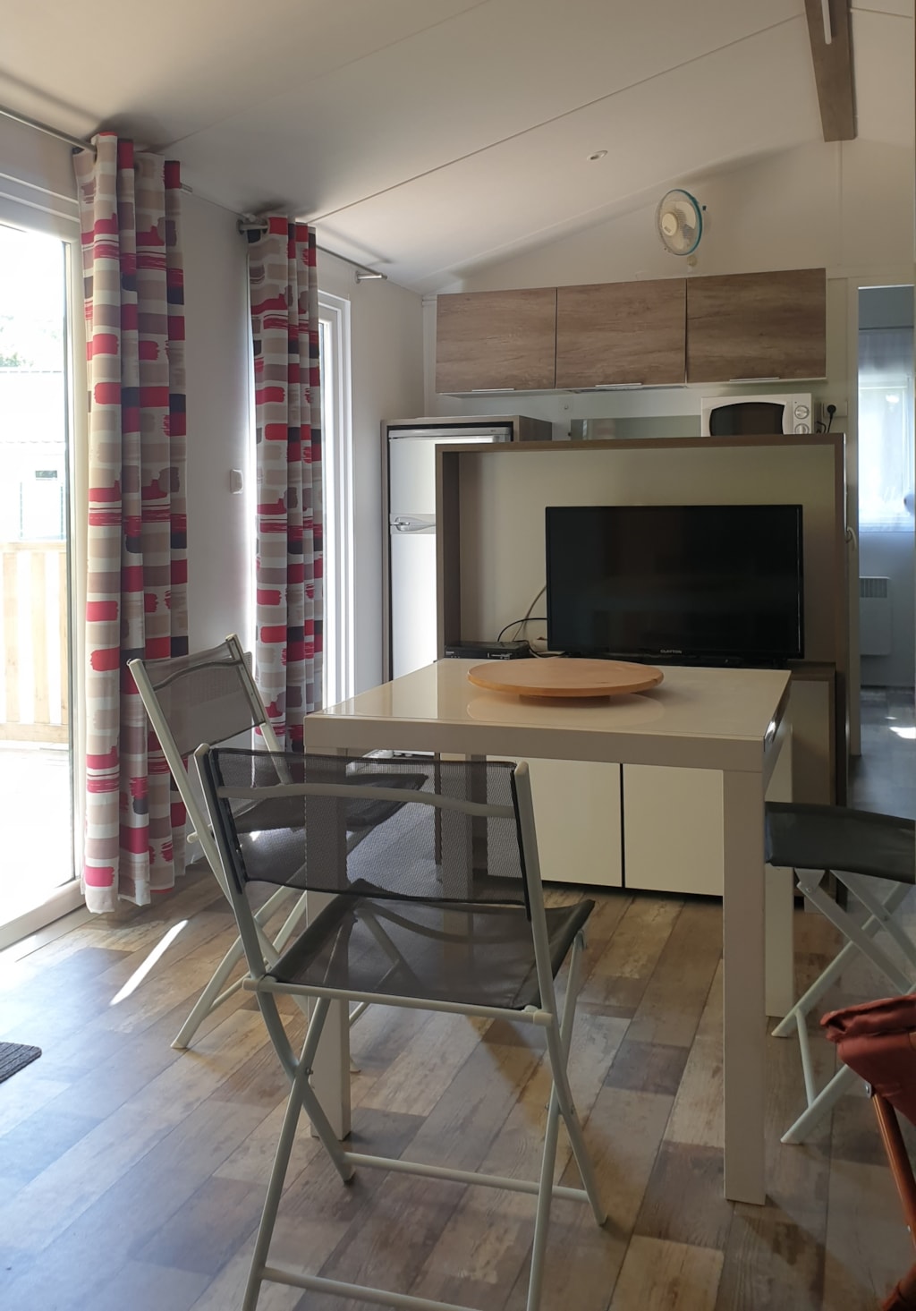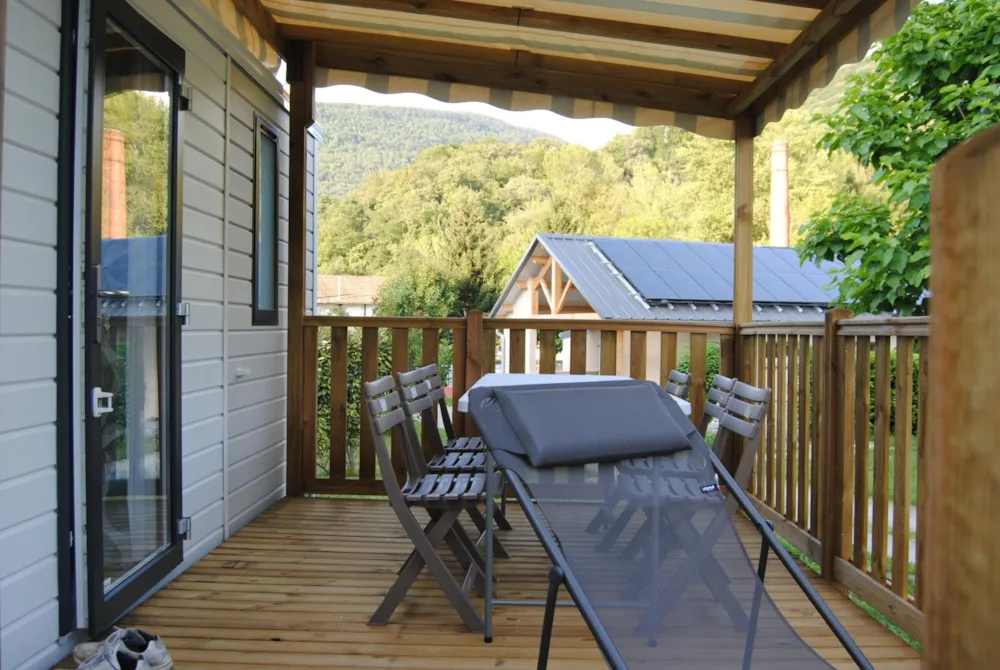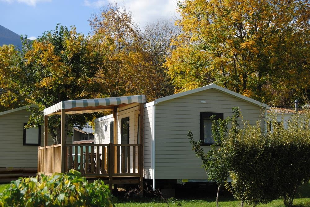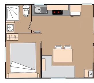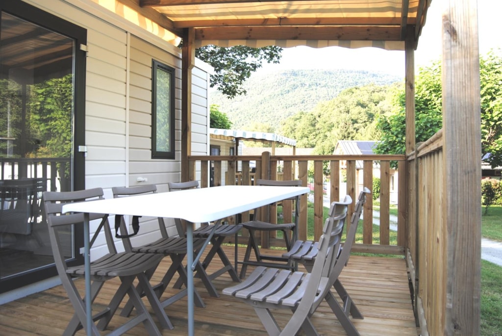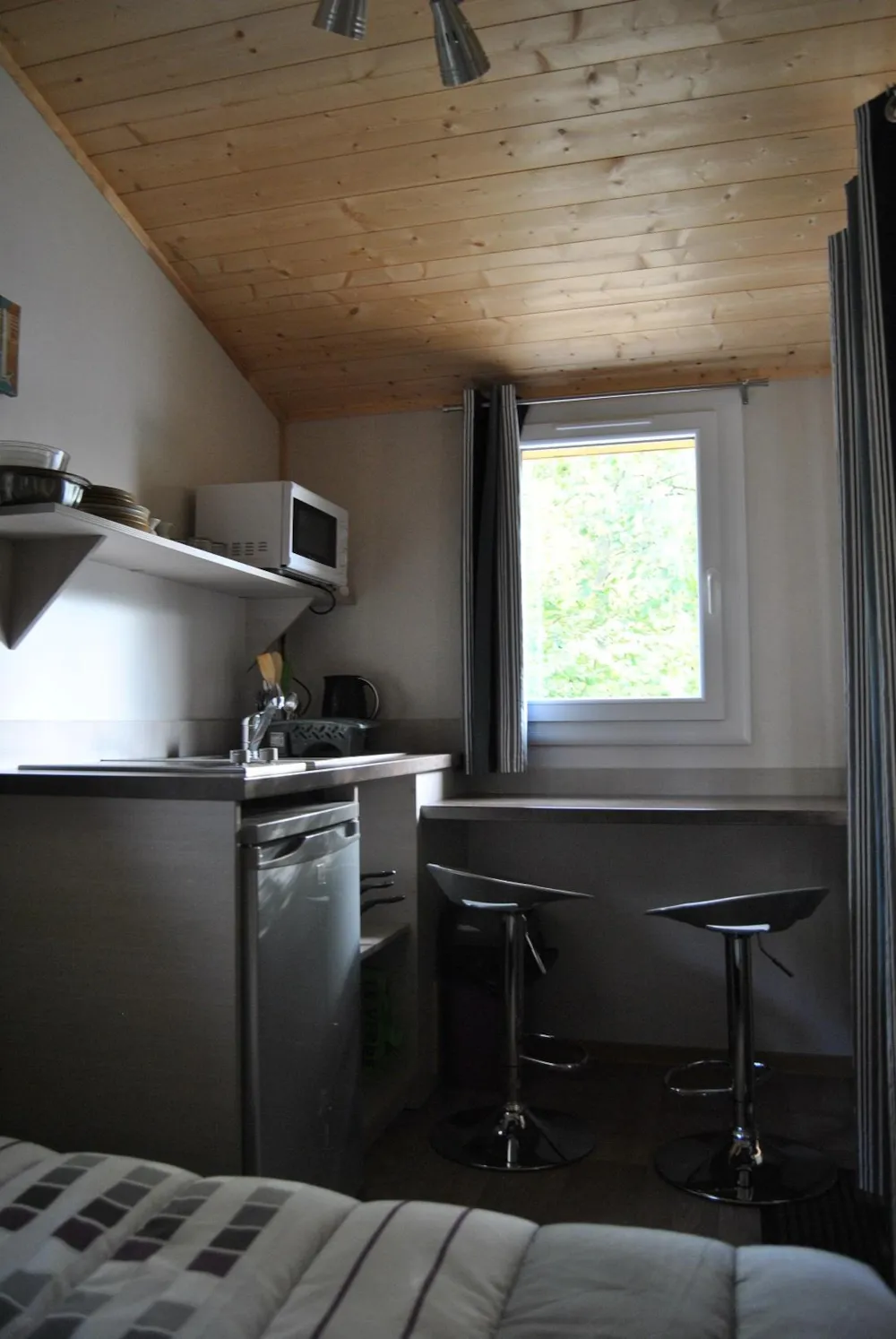 Auf einem Holzboden, Zugang über eine Leiter, darunter ein Picknicktisch für Ihre Mahlzeiten und Entspannungspausen und ein verschiebbarer Sichtschutz, mit dem Sie Ihren eigenen Privatsphärebereich schaffen können.