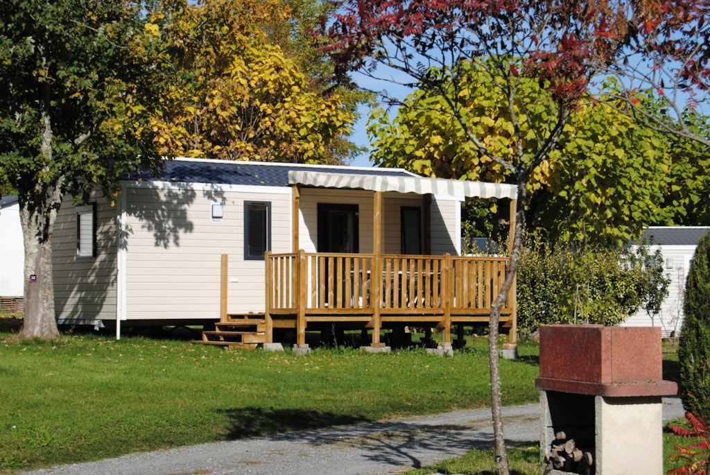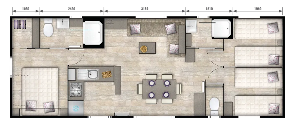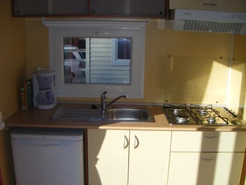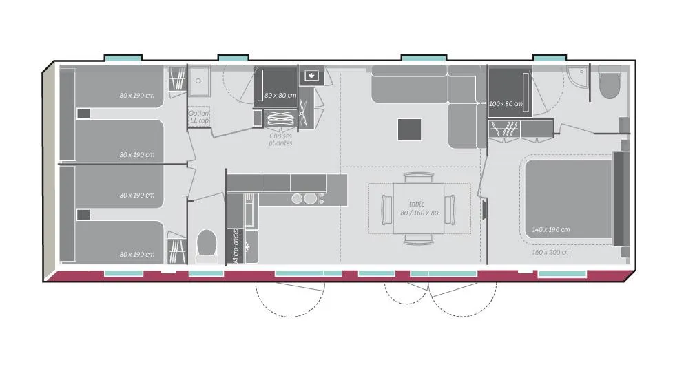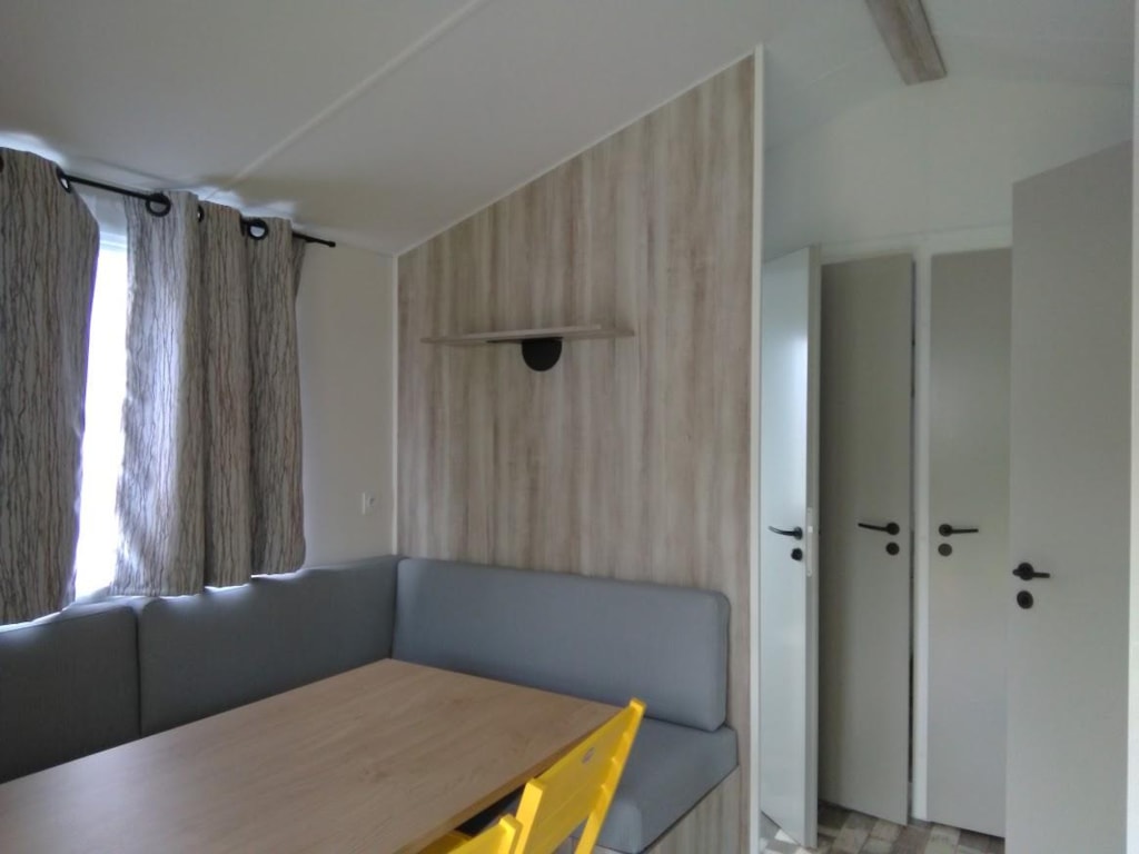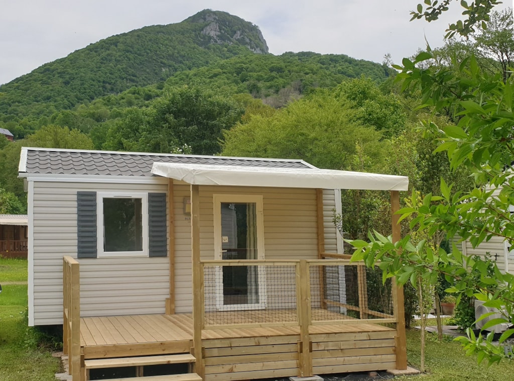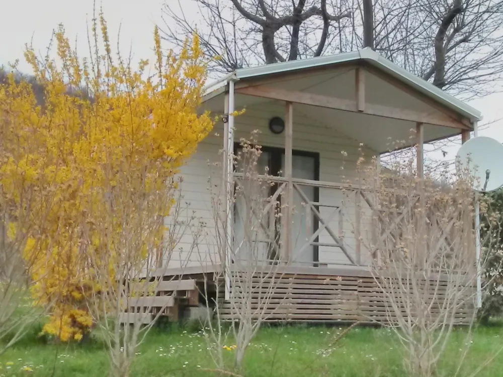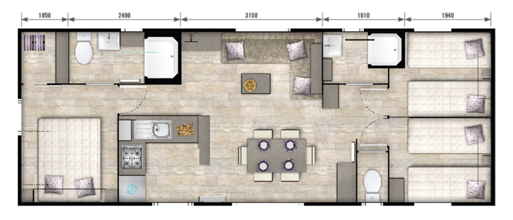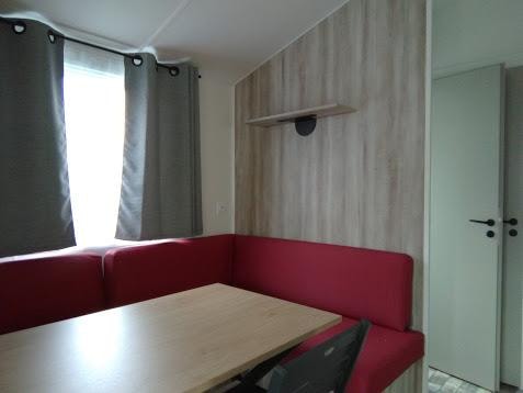 Auf einem Holzboden, Zugang über eine Leiter, darunter ein Picknicktisch für Ihre Mahlzeiten und Entspannungspausen und ein verschiebbarer Sichtschutz, mit dem Sie Ihren eigenen Privatsphärebereich schaffen können.