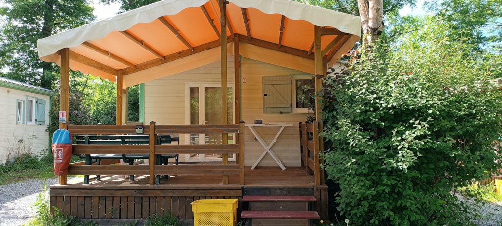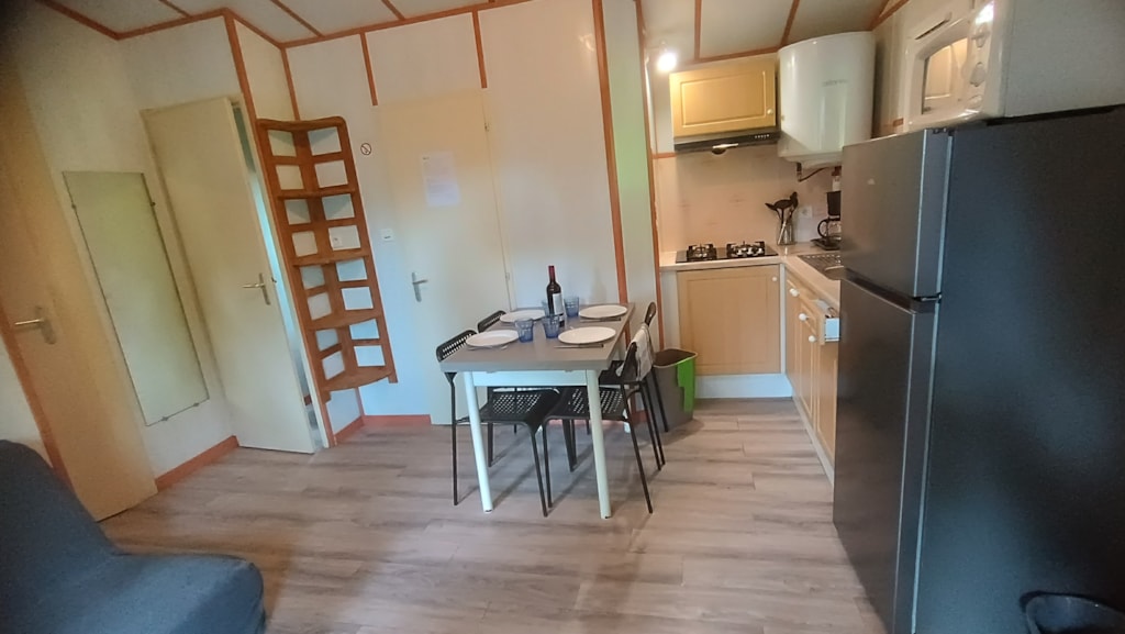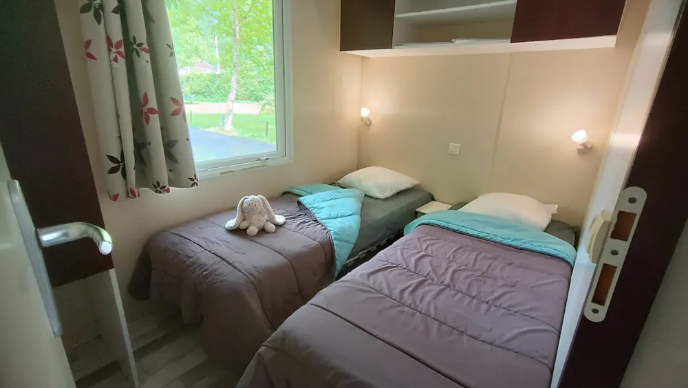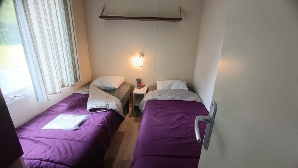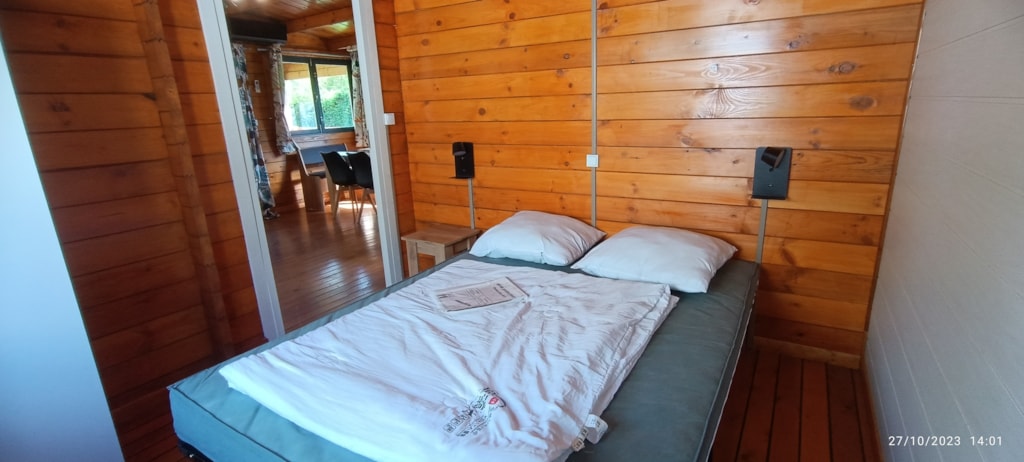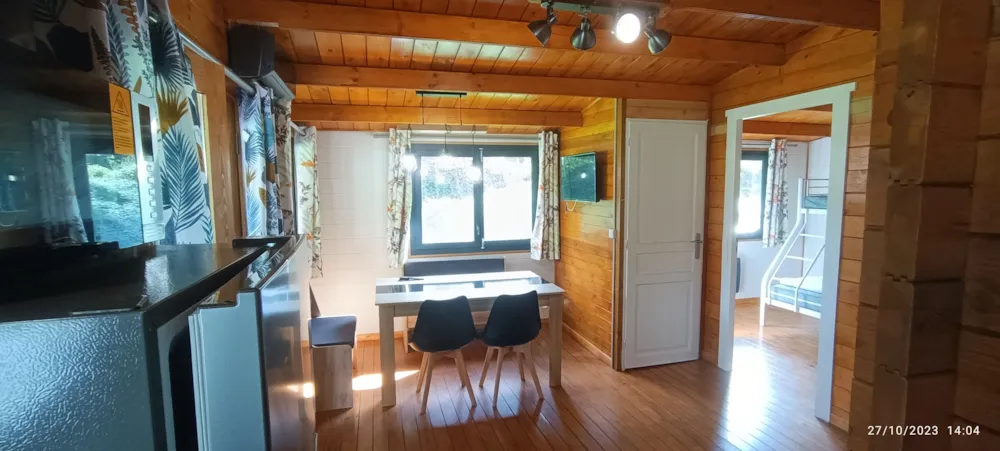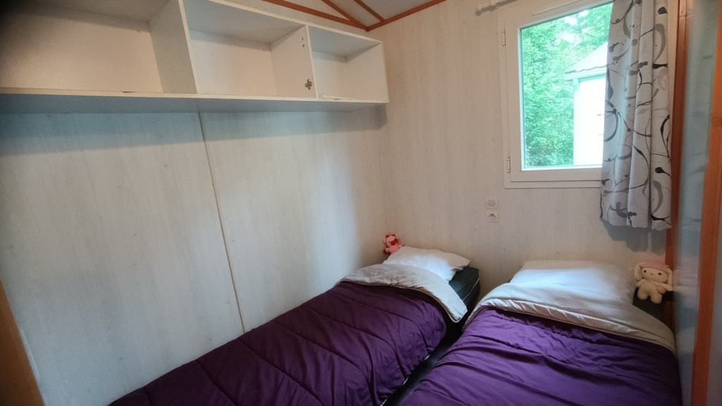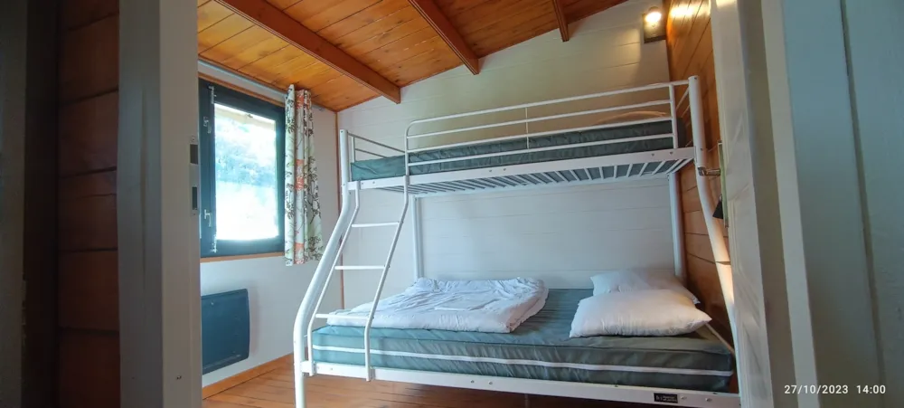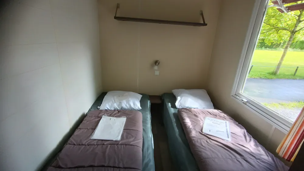 Holzchalet mit 2 Einzelbetten, einem kleinen Tisch und 2 Stühlen. Zugang zu den Sanitäranlagen und Duschen des Campingplatzes