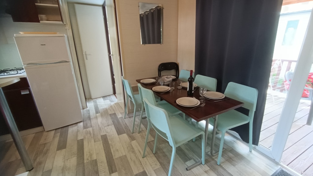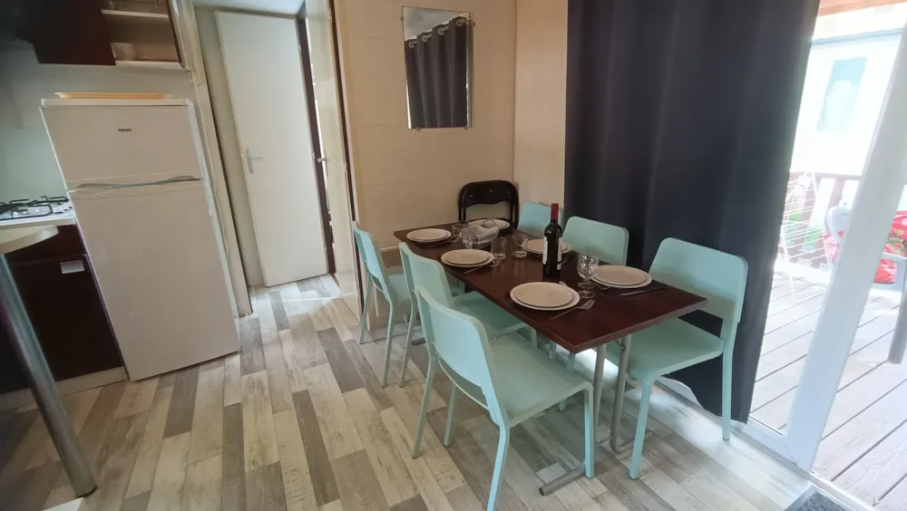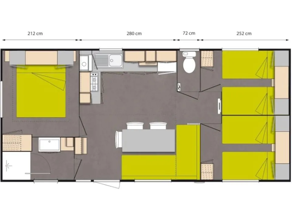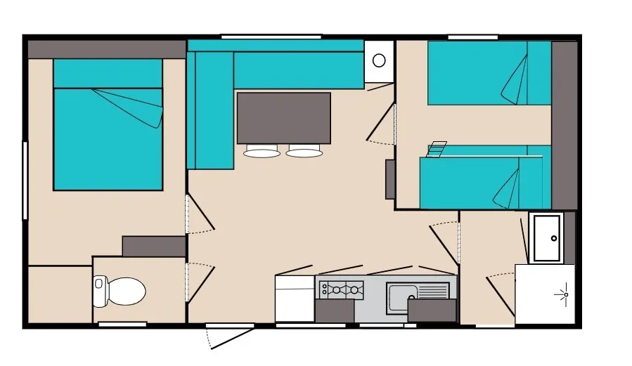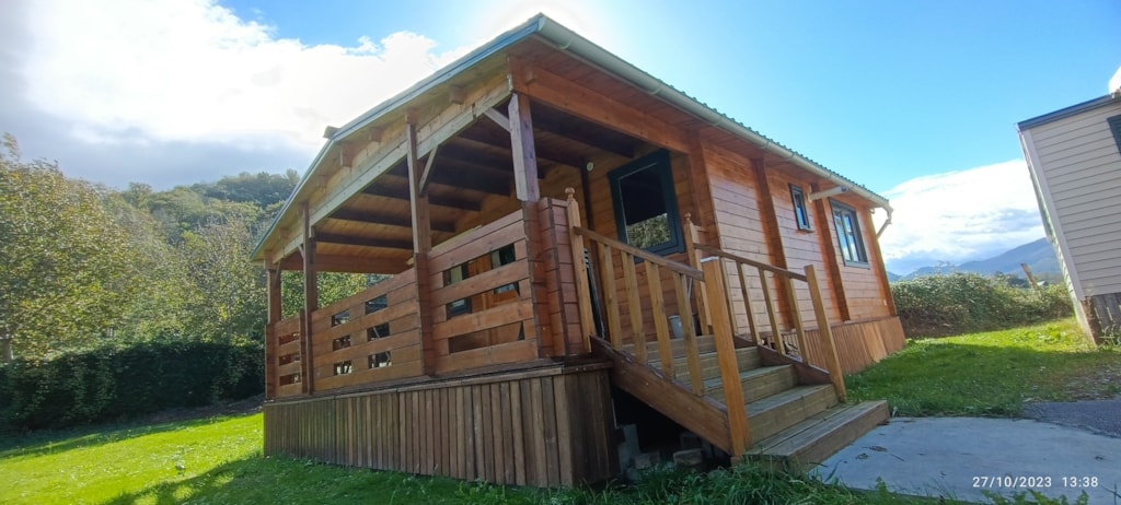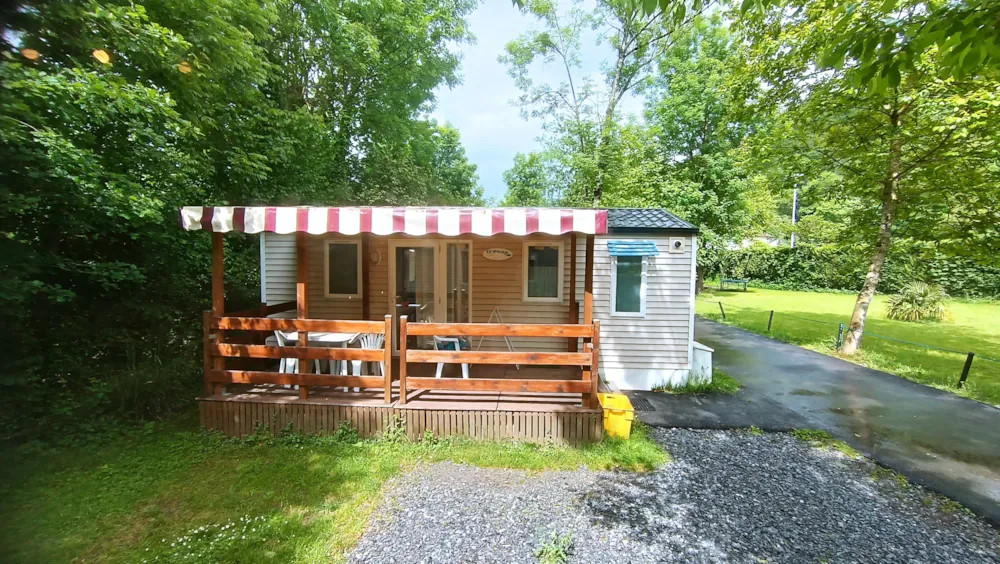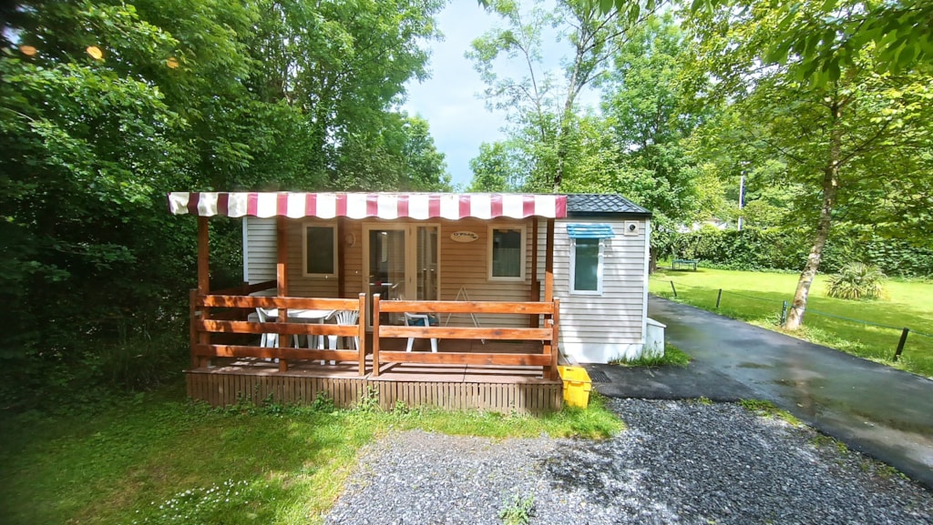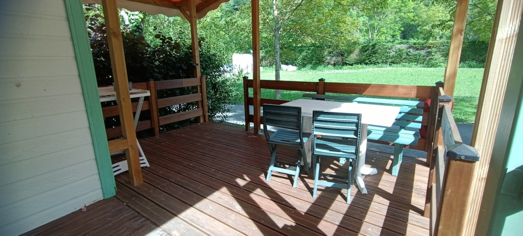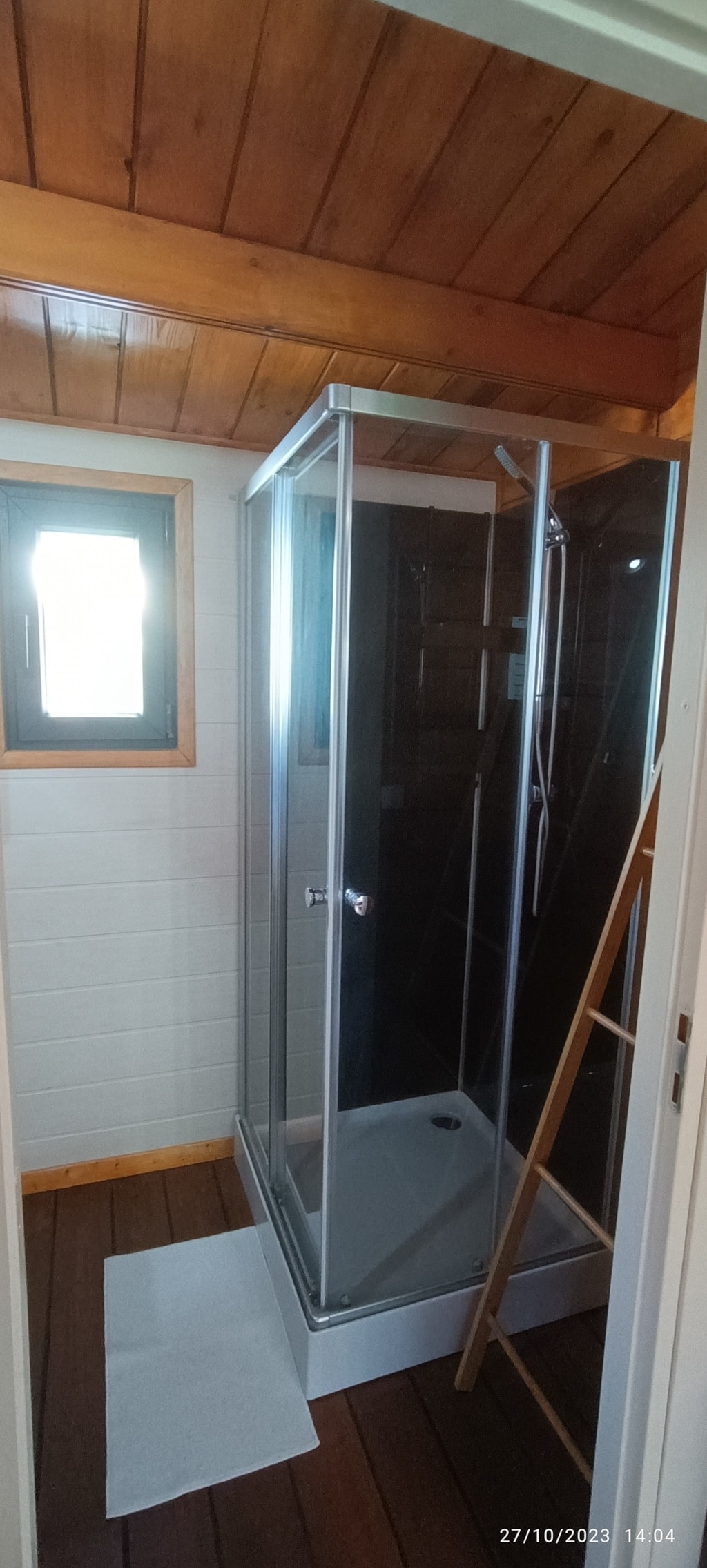 Holzchalet mit 2 Einzelbetten, einem kleinen Tisch und 2 Stühlen. Zugang zu den Sanitäranlagen und Duschen des Campingplatzes