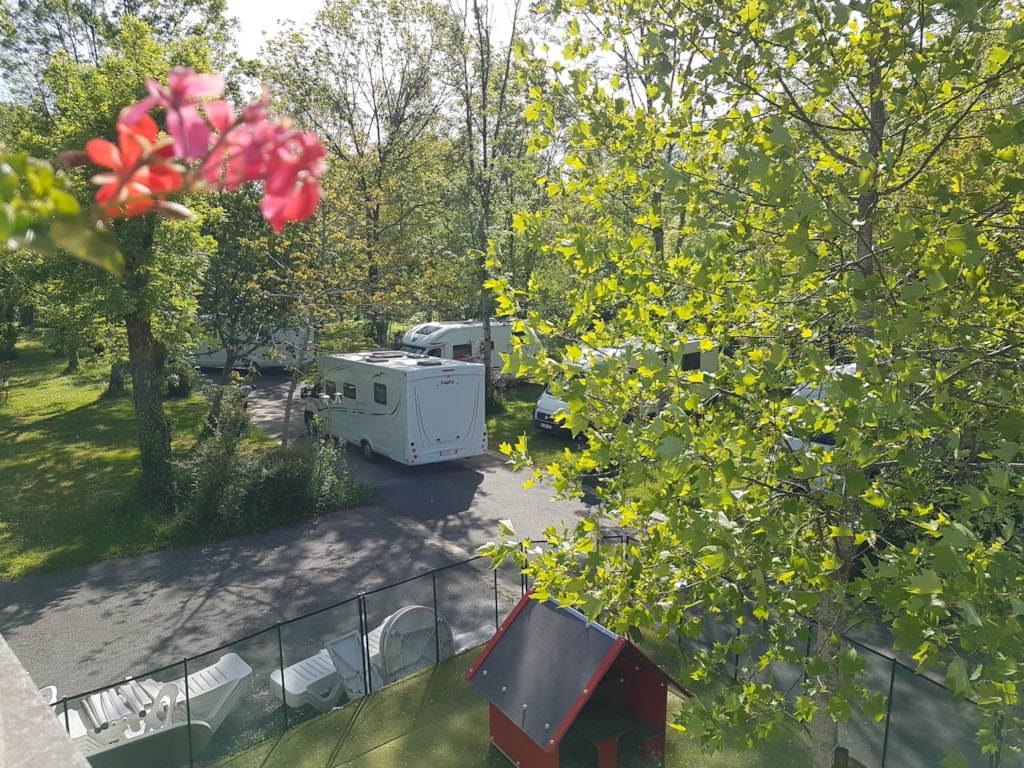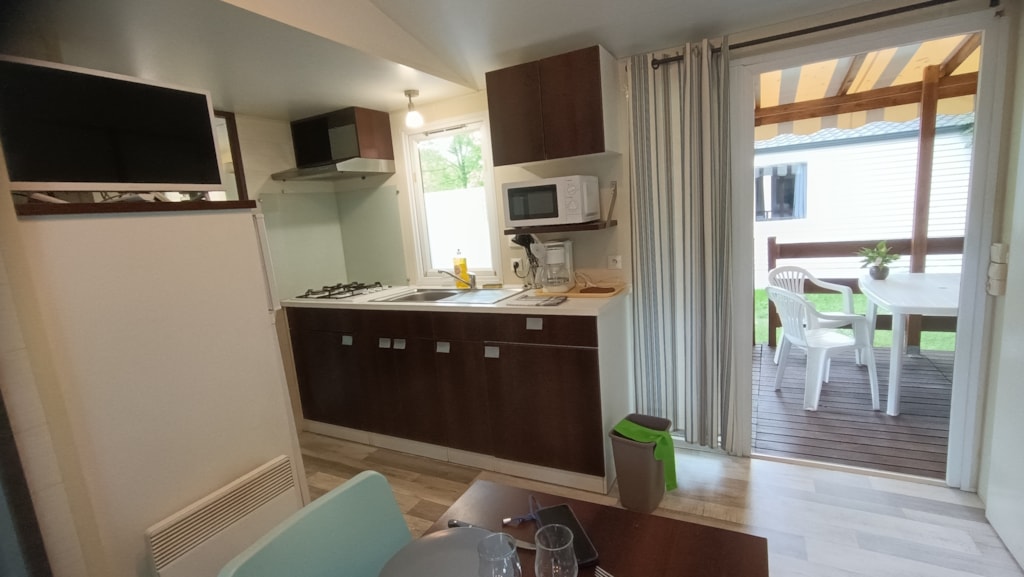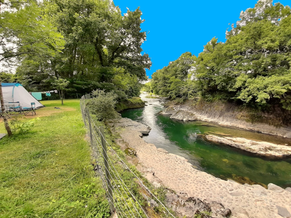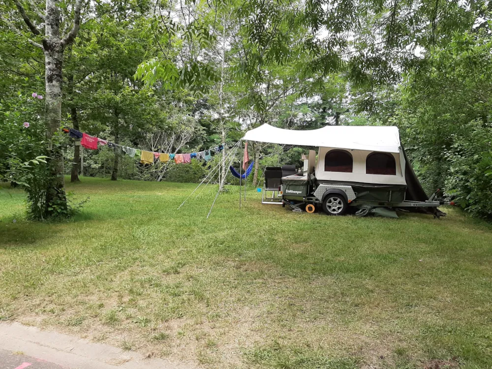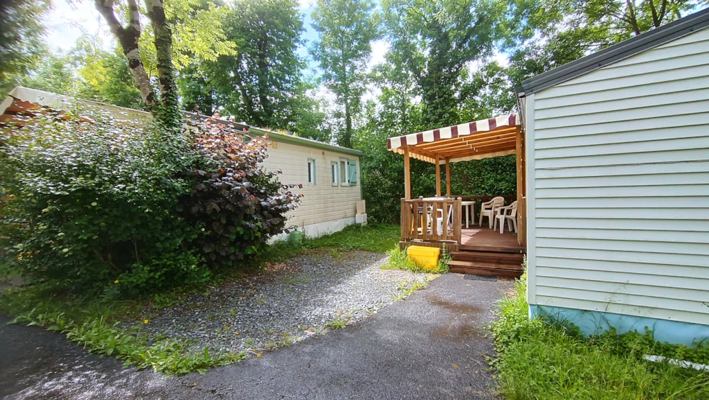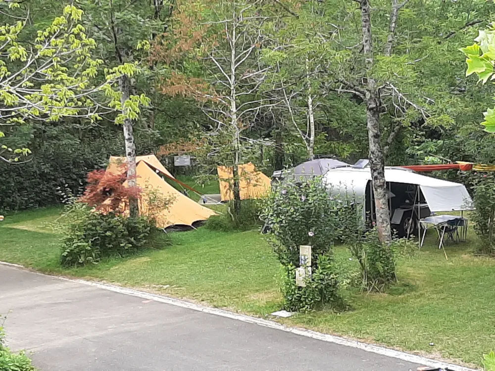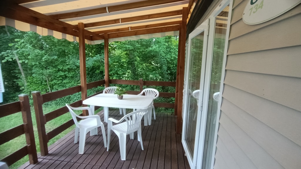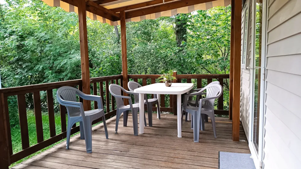 Holzchalet mit 2 Einzelbetten, einem kleinen Tisch und 2 Stühlen. Zugang zu den Sanitäranlagen und Duschen des Campingplatzes