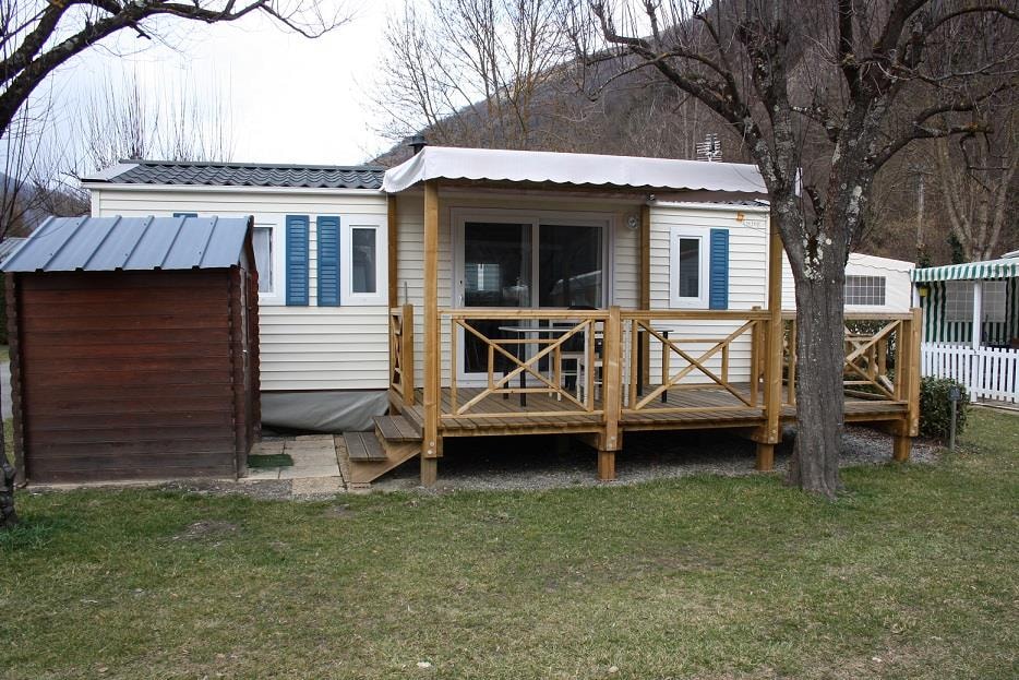Composition : une chambre avec un lit de 140 ainsi qu'une seconde chambre avec deux lits jumeaux et volets roulants dans les chambres. WC séparé, douche lavabo. Coin repas, cuisine, télévision, coin salon avec canapé convertible et terrasse couverte avec salon de jardin. Vaisselle fournie ainsi qu'une couverture ou couette par lit.