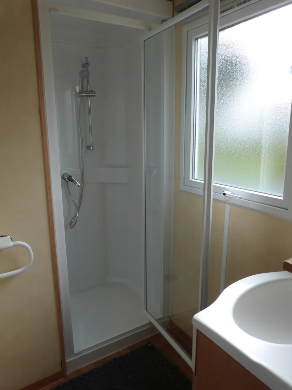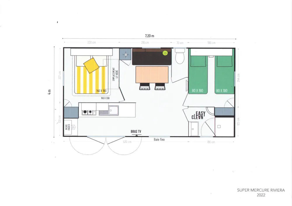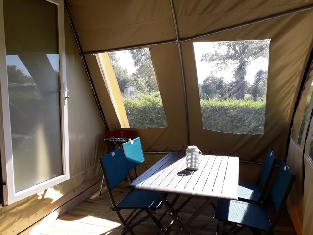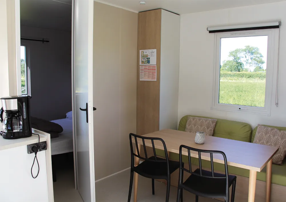 Machen Sie es sich im Wohnbereich mit Ecksofa und Couchtisch gemütlich und genießen Sie unsere „Premium“-Ausstattung: Kaffeemaschine mit Kapseln, Haartrockner, überdachte Terrasse mit Gartenmöbeln und 2 Liegestühlen.