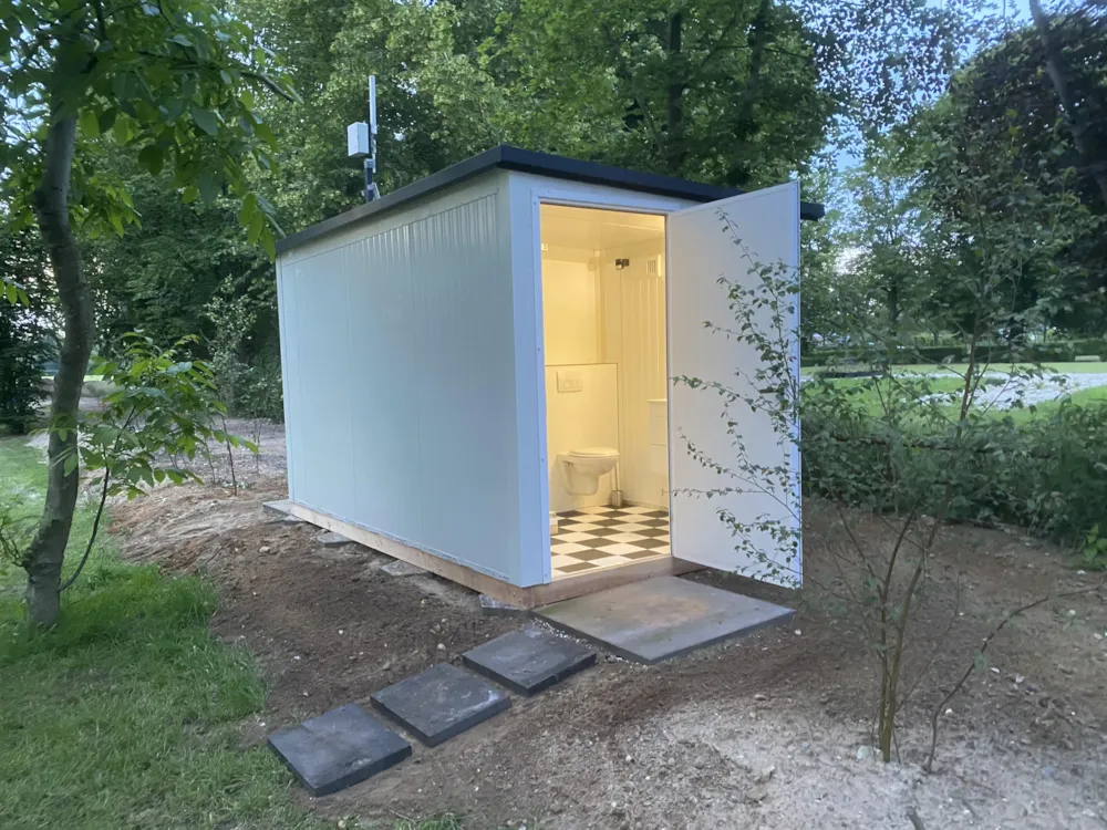 Großzügiger Stellplatz mit privaten Sanitäranlagen, Toilette, Dusche und Waschbecken.