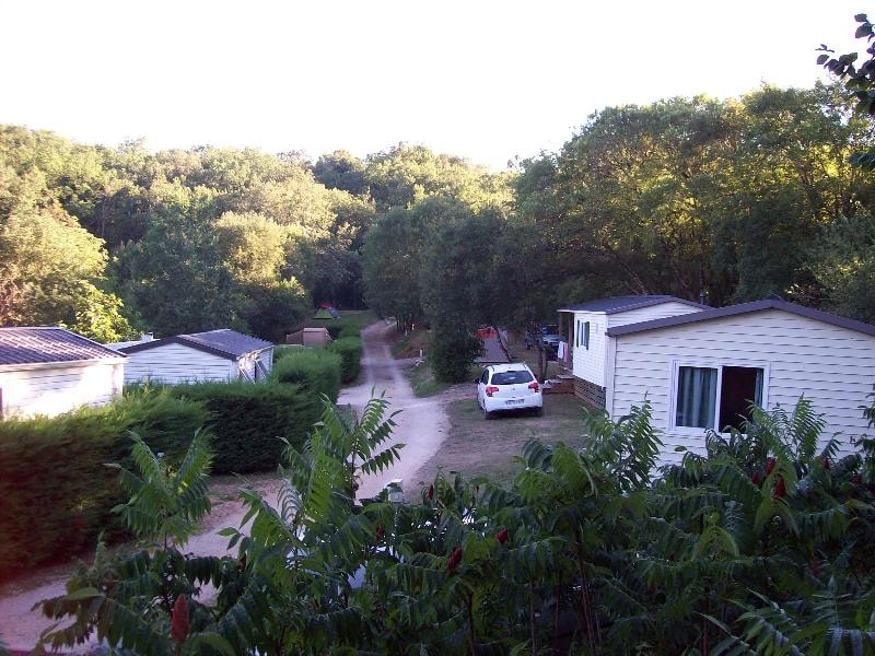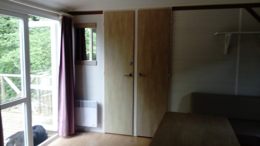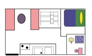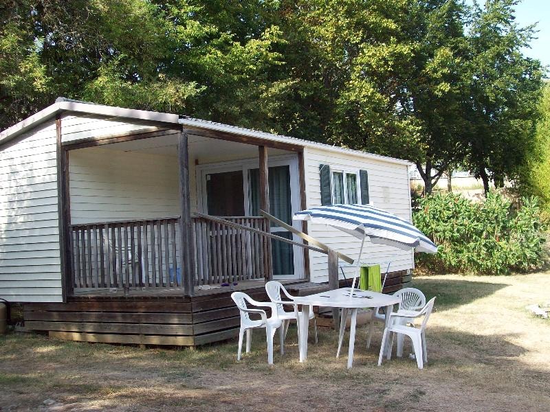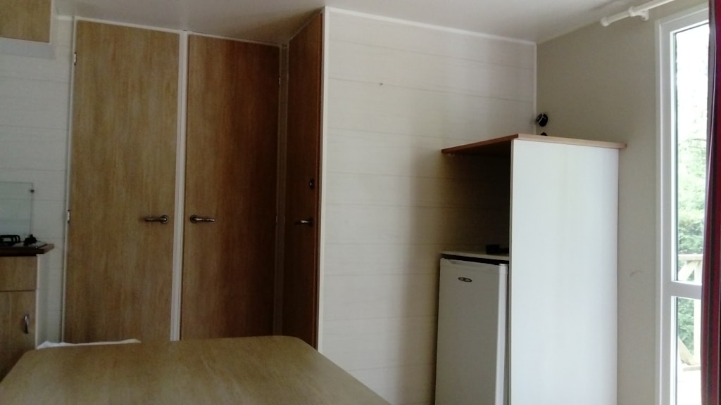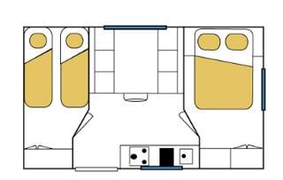 sans sanitaire équipé d'une cuisine et deux chambres, l'une avec un grand lit 120cm x 190cm et l'autre avec deux petits lits superposés ( pour des personnes de moins d'1m60).M-Home ombragé et équipé d'une terrasse couverte.