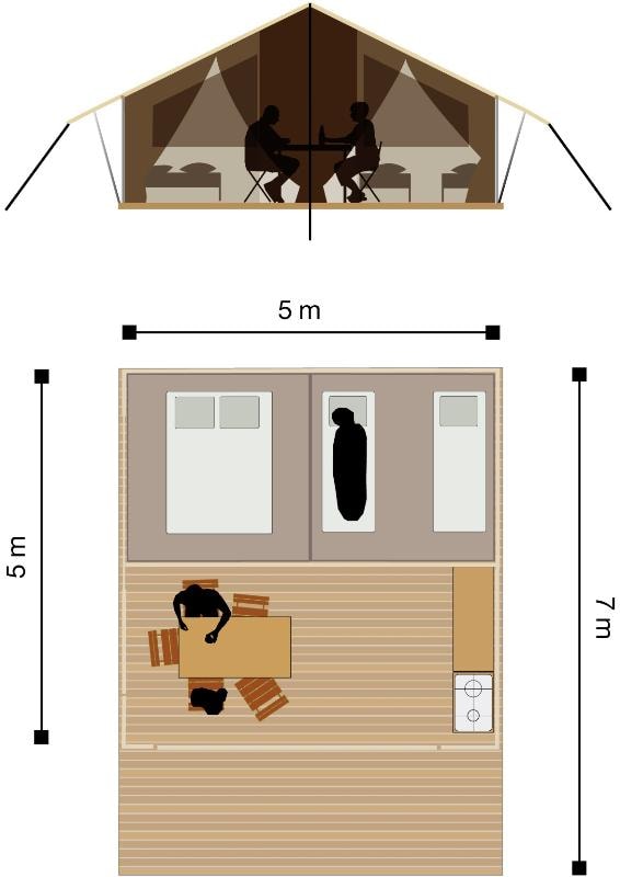 Lodge tent - 2 bedrooms - covered terrace. If you're looking for adventure, discovery and a change from your everyday life... but still want to make sure you have a cosy nest, then try our ready-to-camp accommodation and enjoy the pleasures of camping without the inconvenience. Original and warm, our lodge tent will appeal to young and old alike.