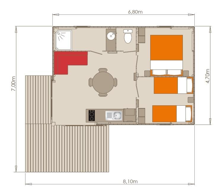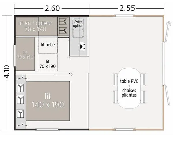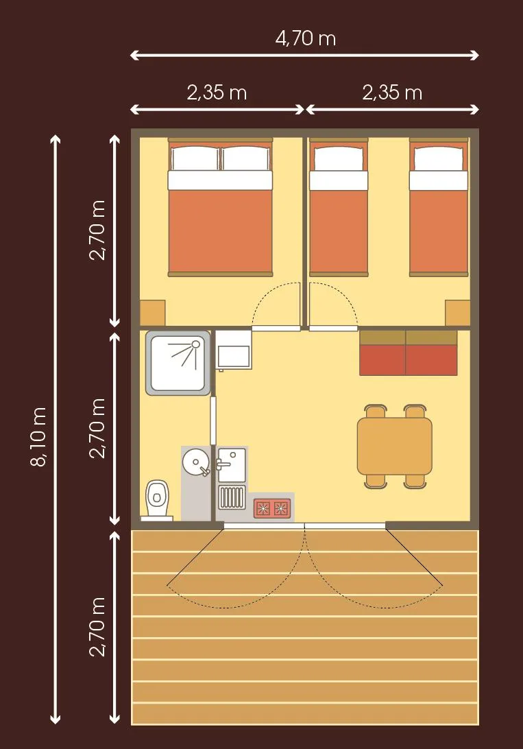 Cottage Martel - 16m², without water or sanitary facilities. Water point and use of campsite sanitary facilities nearby. Ideal for families who want to keep the camping spirit with the comfort of a cottage. Uncovered terrace with parasol.