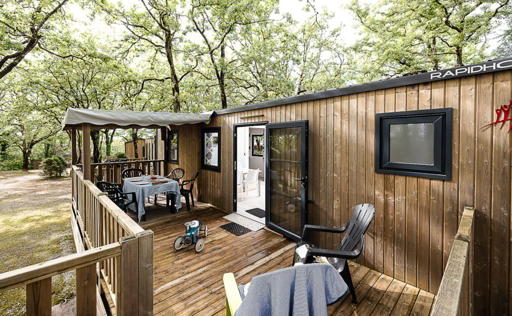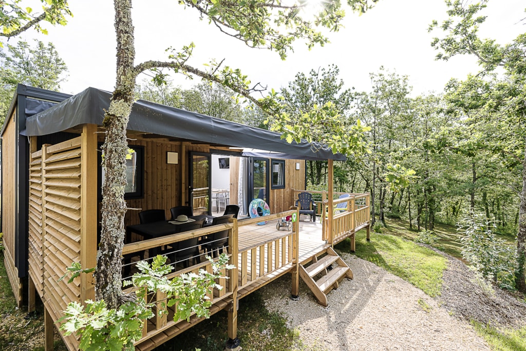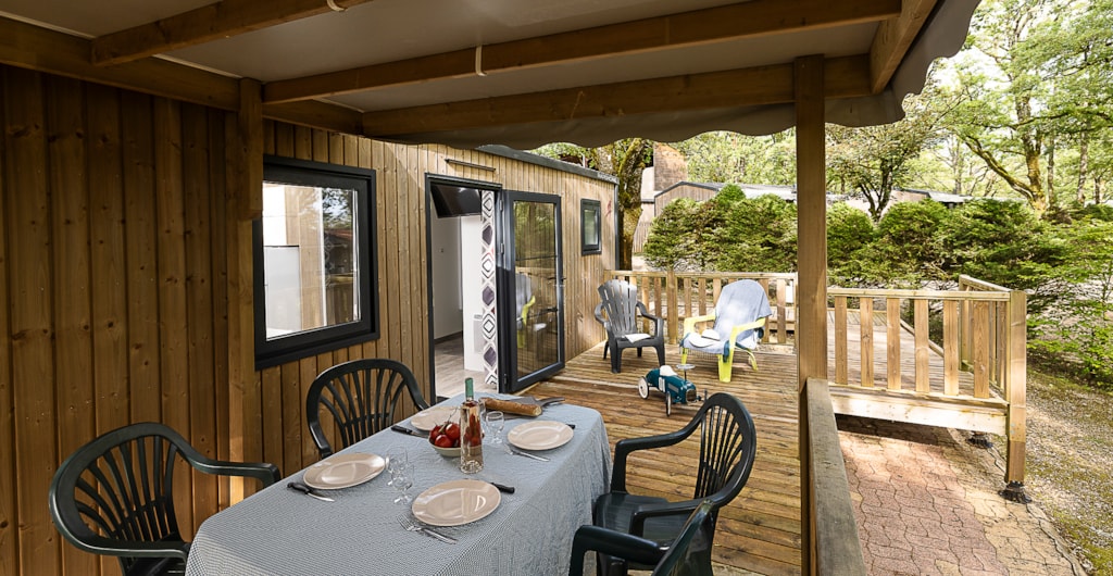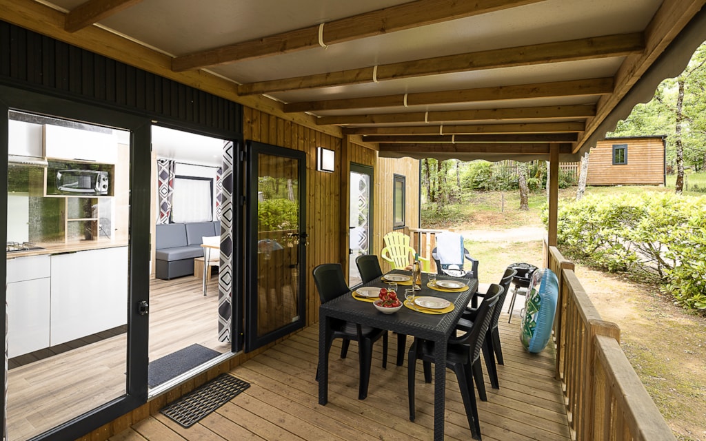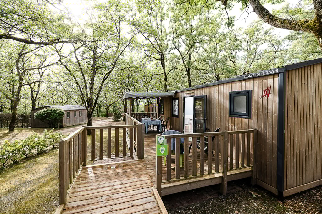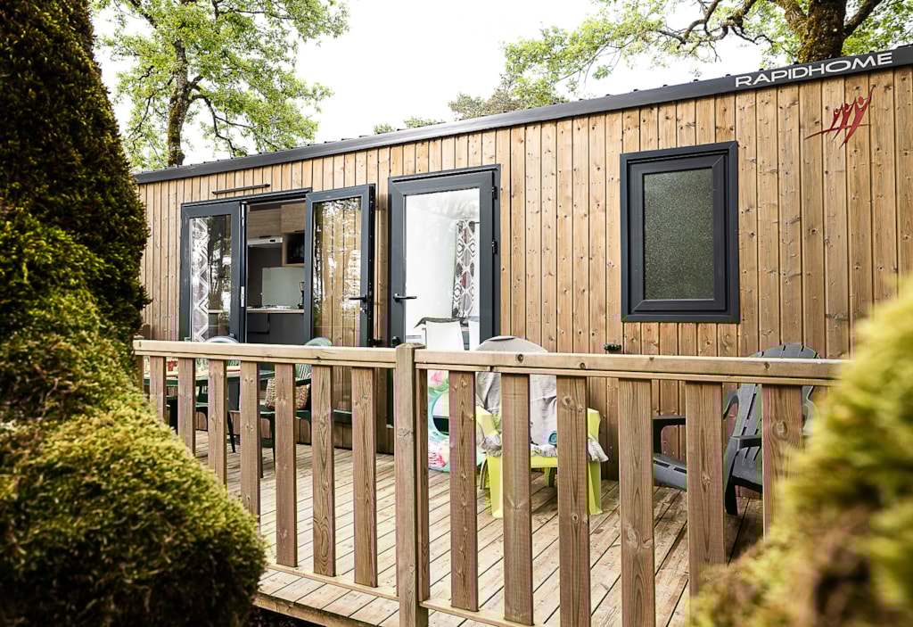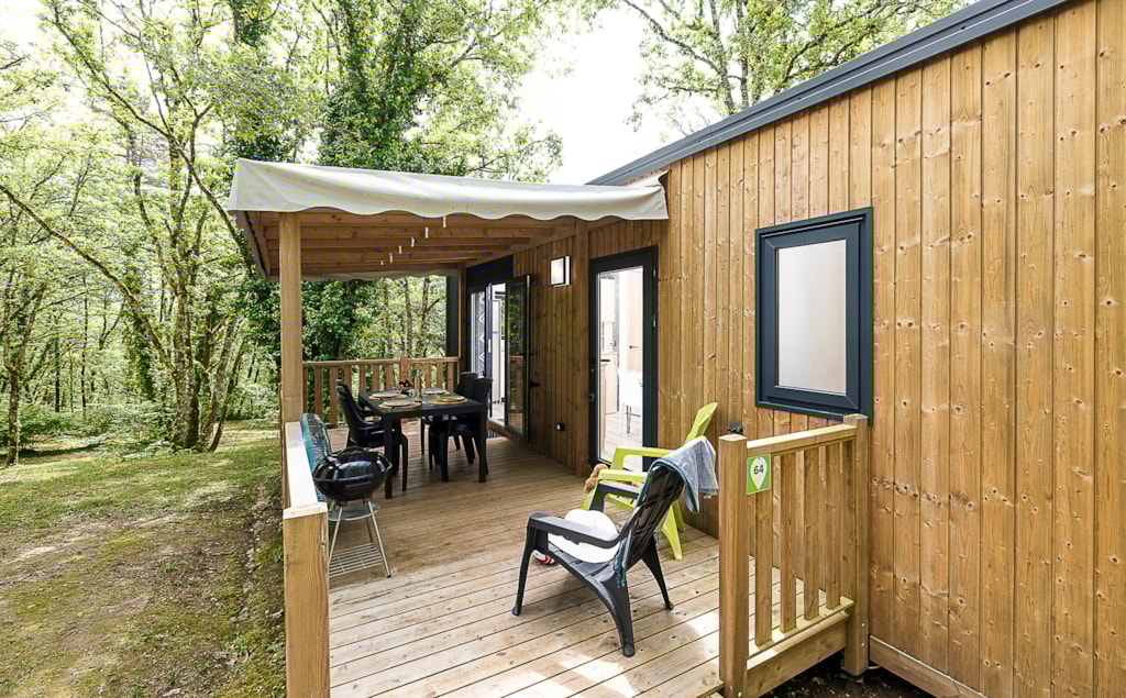 Mobile home Padirac - Surface area 25.50 m² + 7.6 m² semi-covered terrace. Wood cladding in harmony with nature.