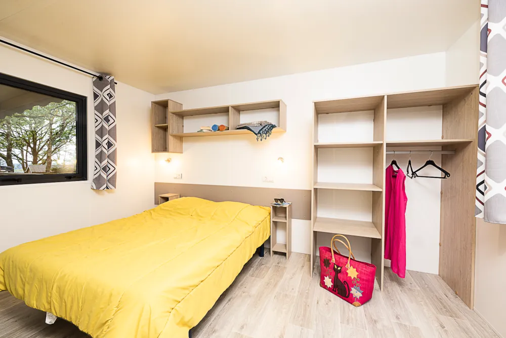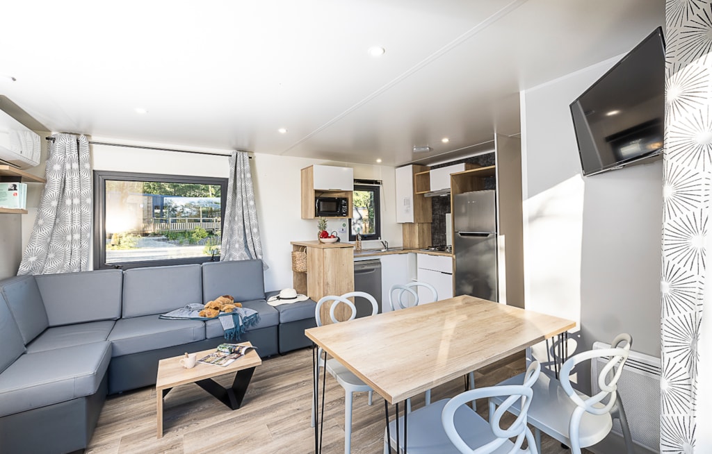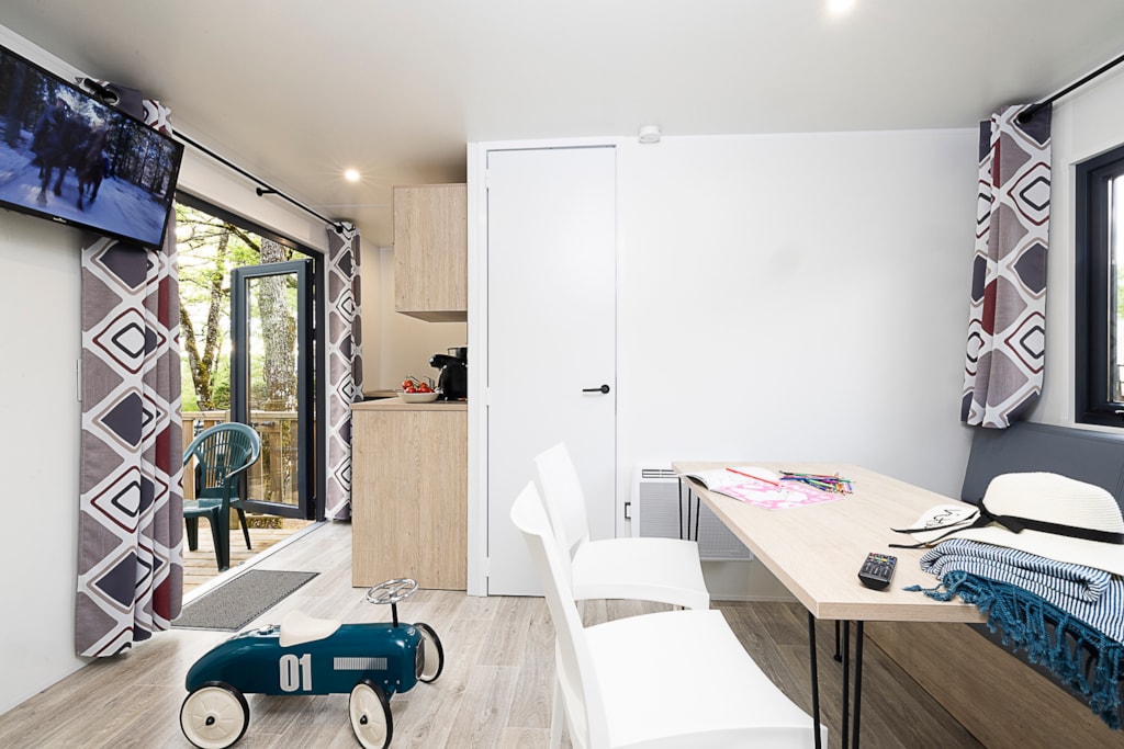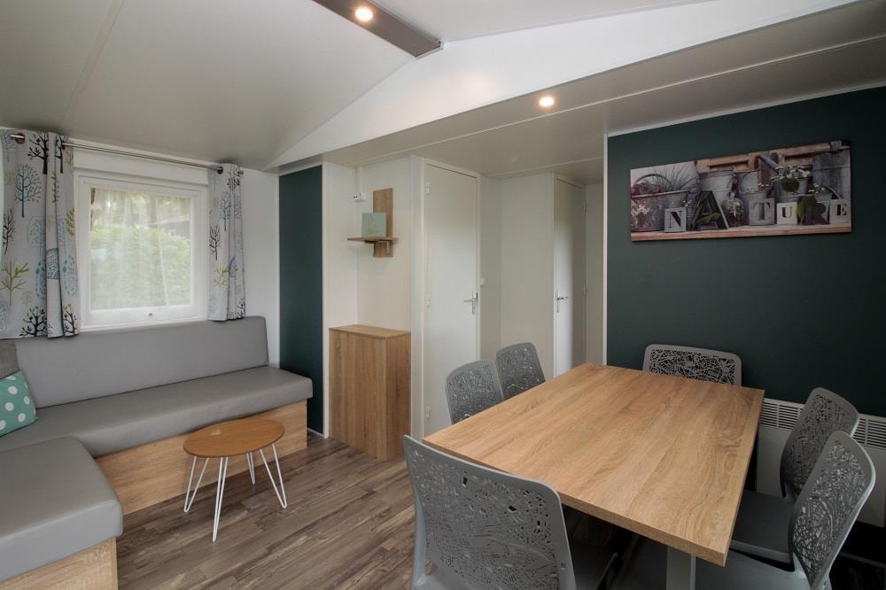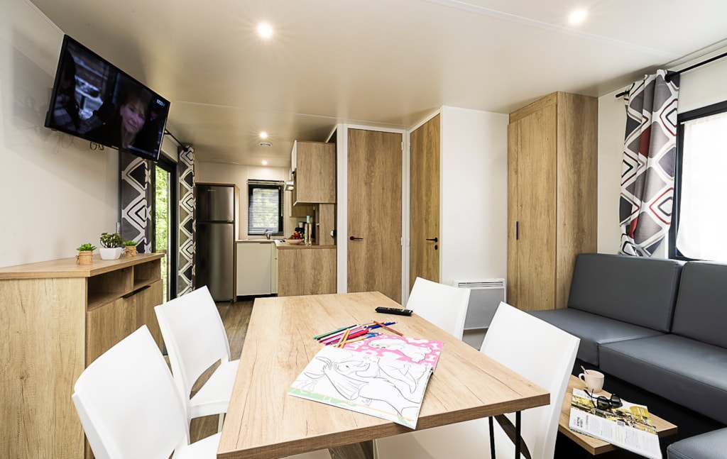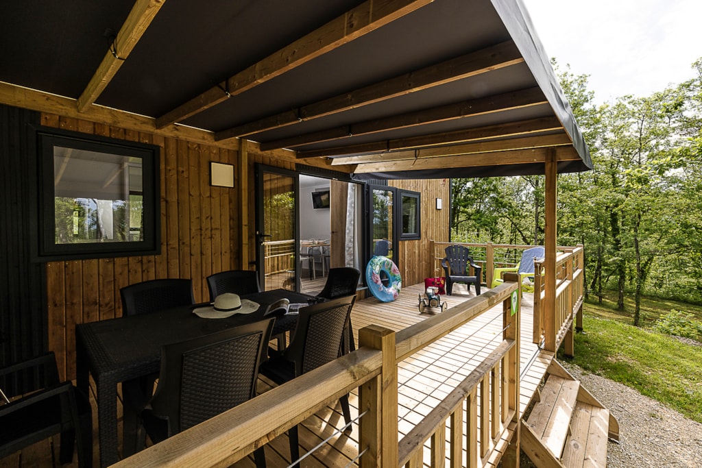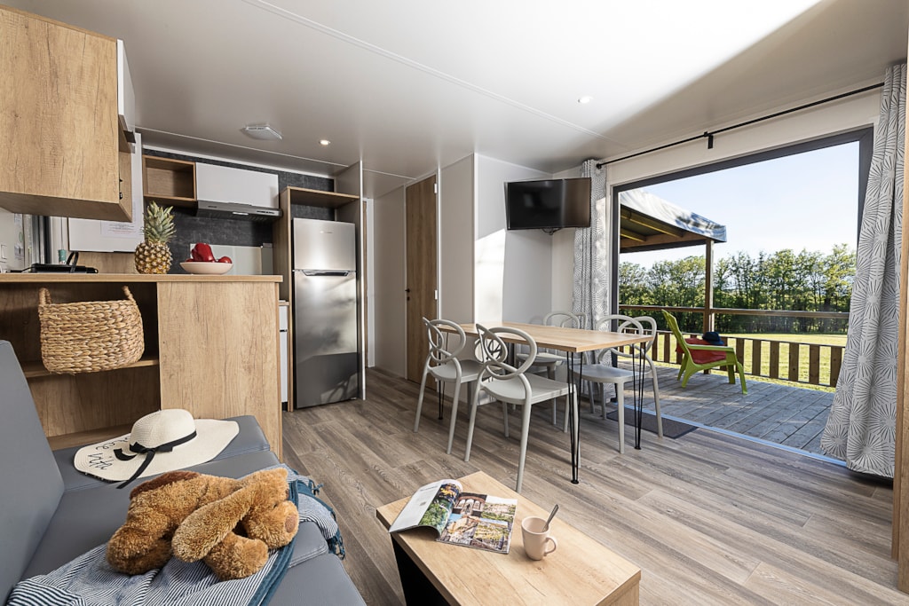 Mobile home Padirac - Surface area 25.50 m² + 7.6 m² semi-covered terrace. Wood cladding in harmony with nature.