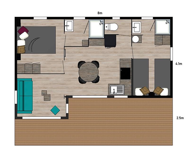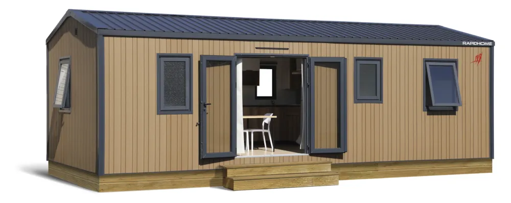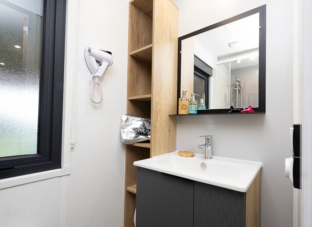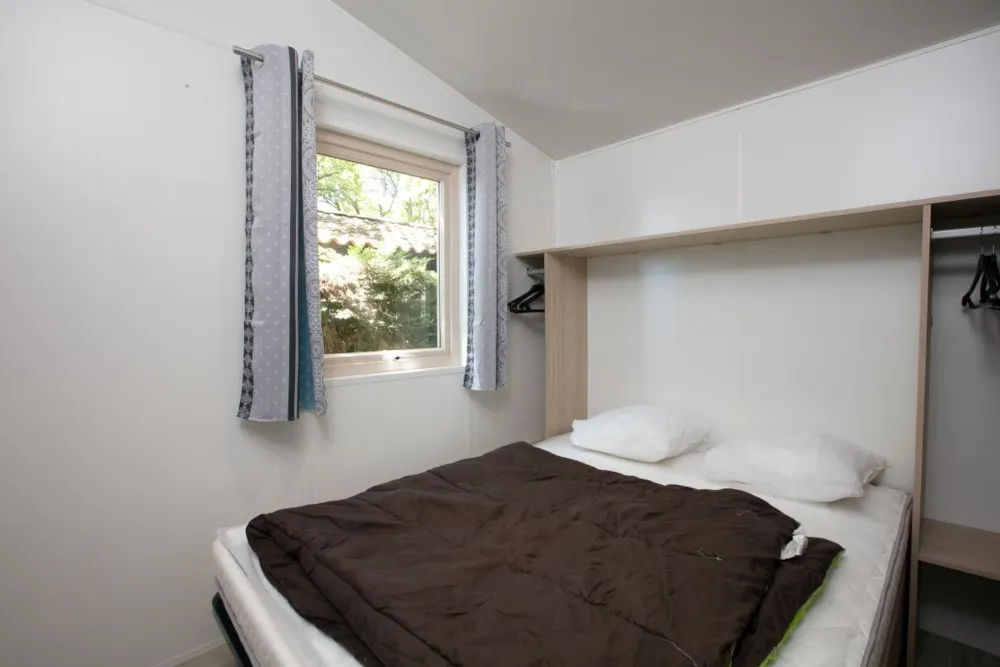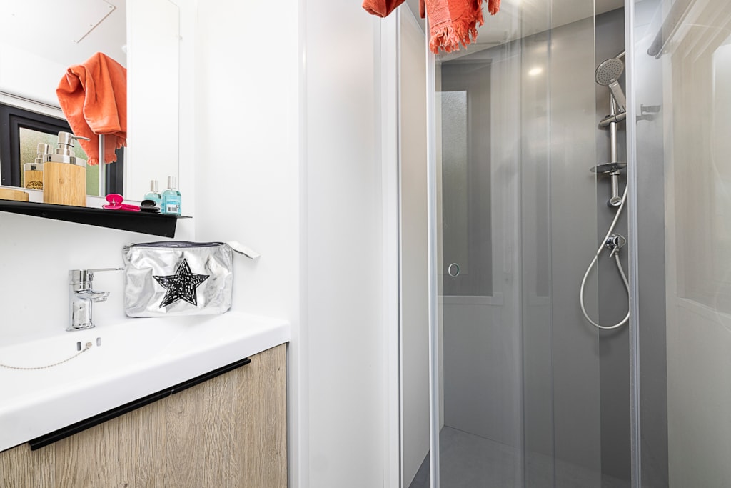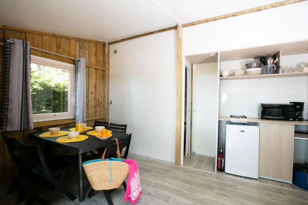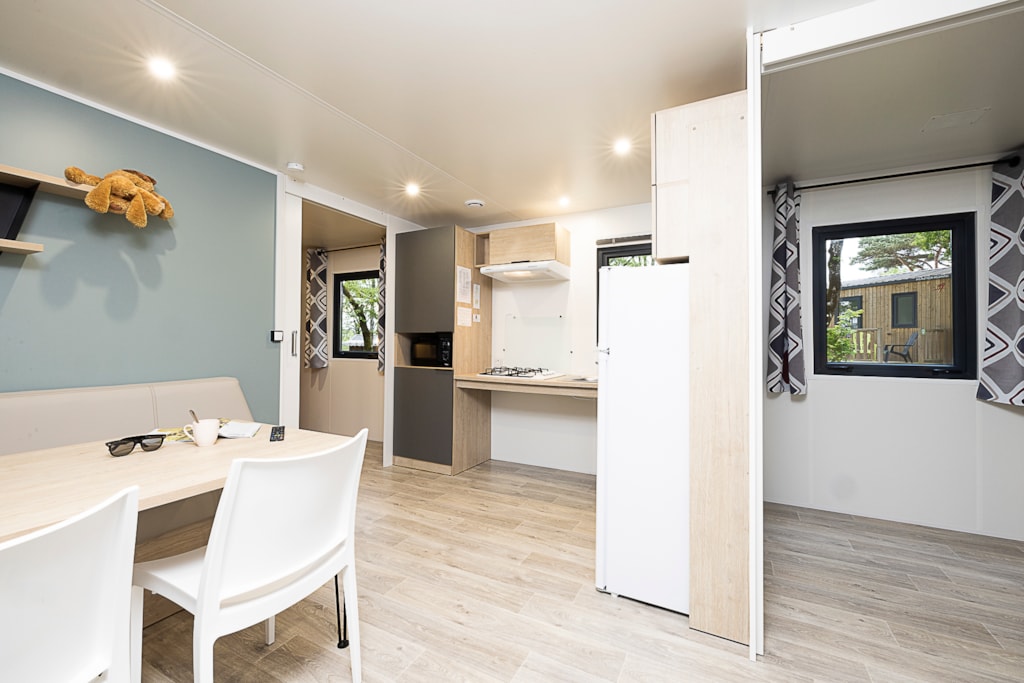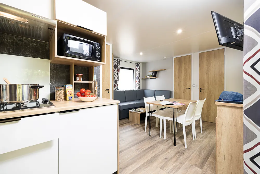 Mobile home Padirac - Surface area 25.50 m² + 7.6 m² semi-covered terrace. Wood cladding in harmony with nature.