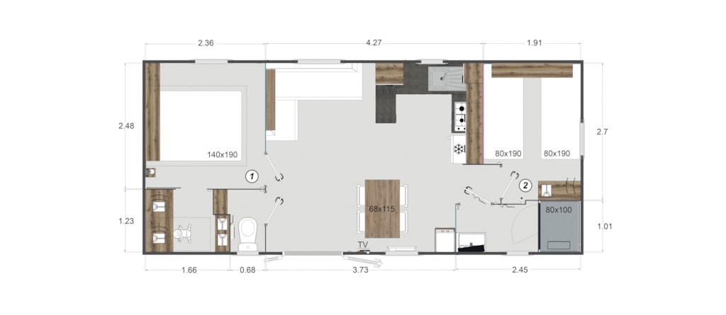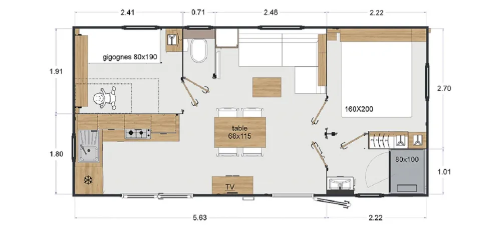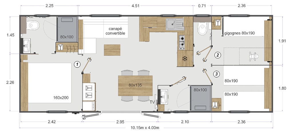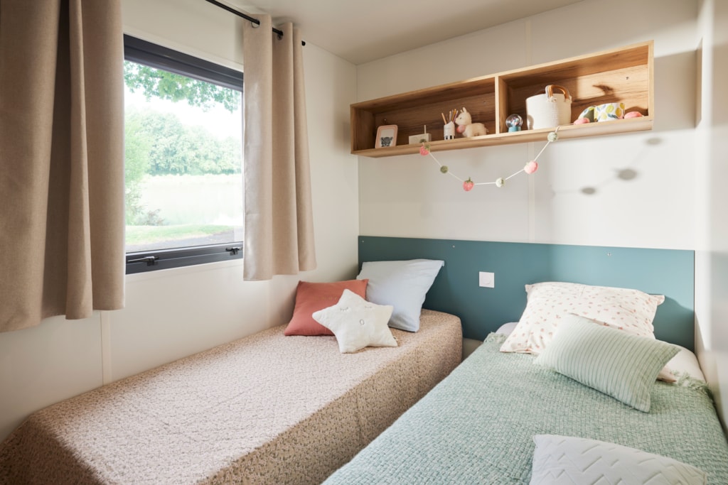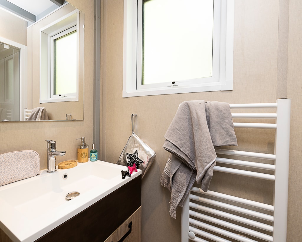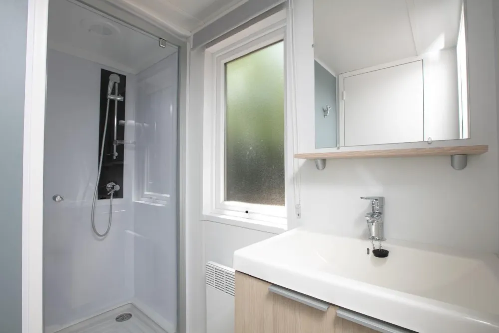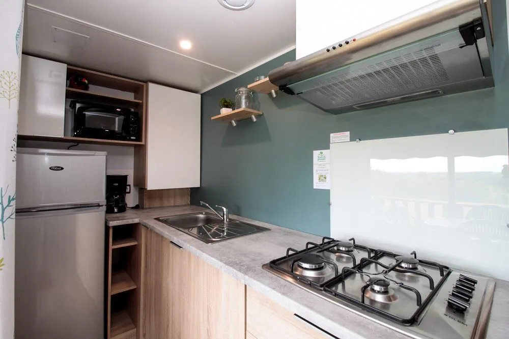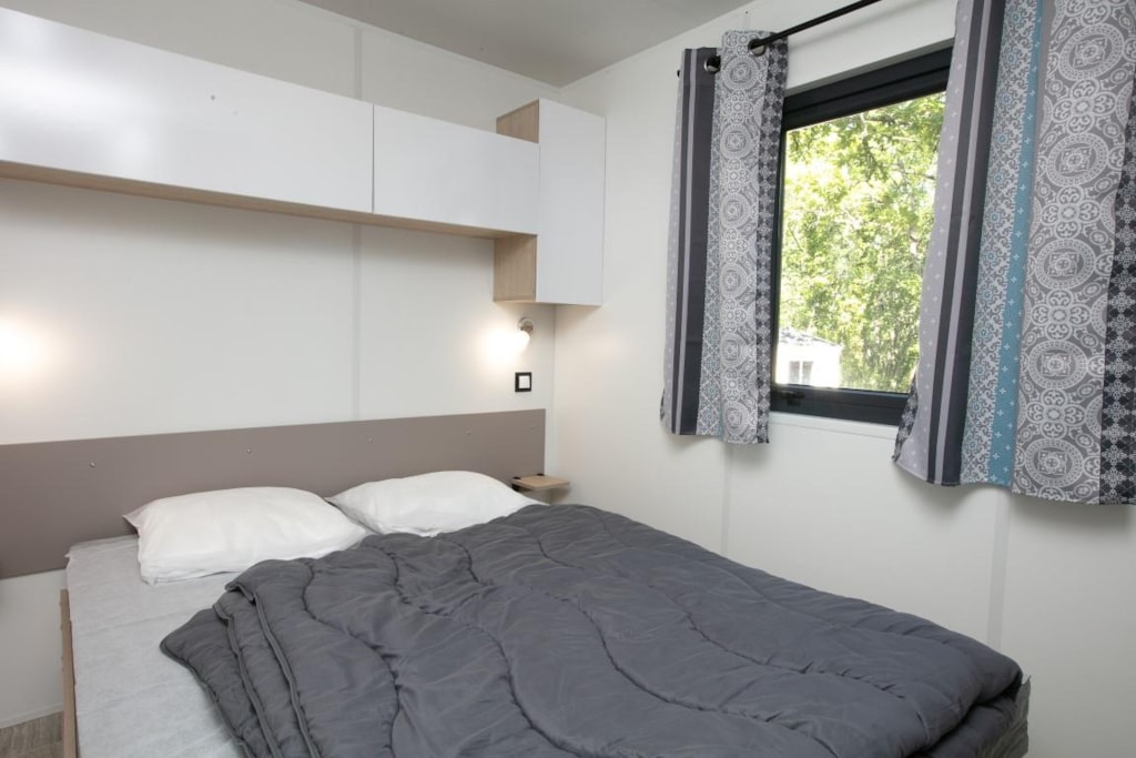 Mobile home Padirac - Surface area 25.50 m² + 7.6 m² semi-covered terrace. Wood cladding in harmony with nature.