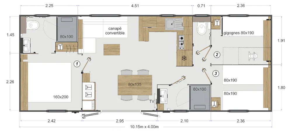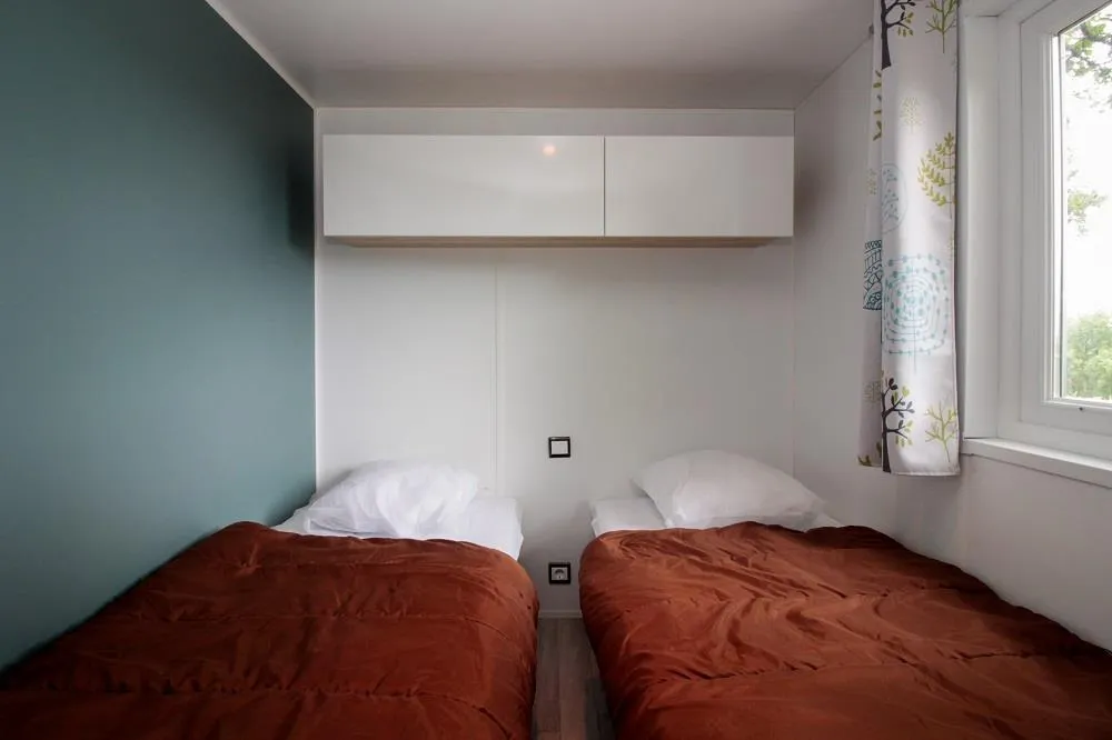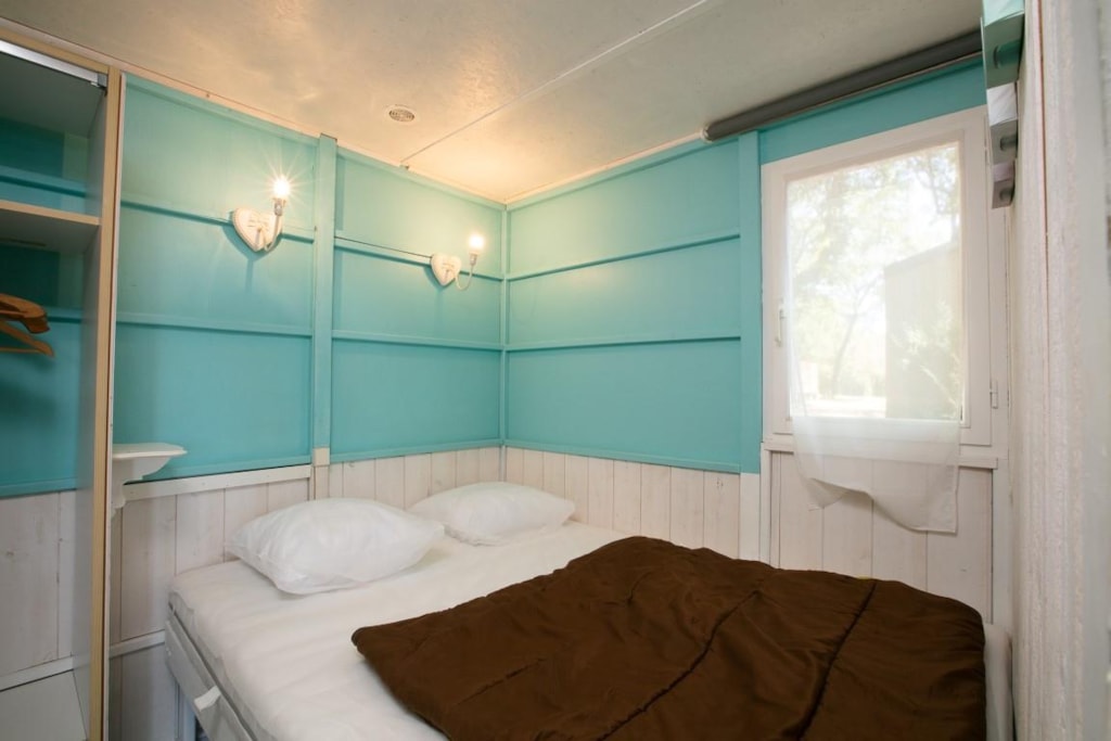 2 bedrooms: 1 bedroom with 1 double bed 140x190cm and 1 bedroom with 2 bunk beds 80x190cm, 1 bed 80x190cm (in a cabin, the 2nd is for 4 people), duvets, pillows.