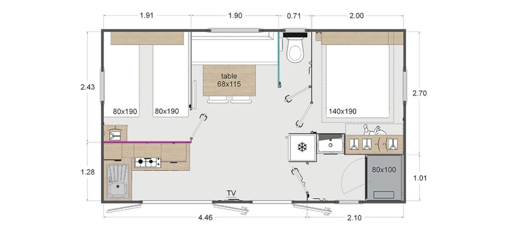 1 bedroom with double alcove bed 140x190cm (pillows and duvets), ideal for 2 people, but can sleep up to 4 people in the living room, which can be converted into a bedroom with 2 single beds 70x190cm.