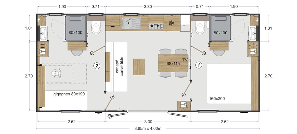 Equipped with : 2 bedrooms: 1 master bedroom with 1 double bed 140X190 and 1 children's bedroom with 2 twin beds 70X190 and 1 high bed 70X190 (duvets, pillows).