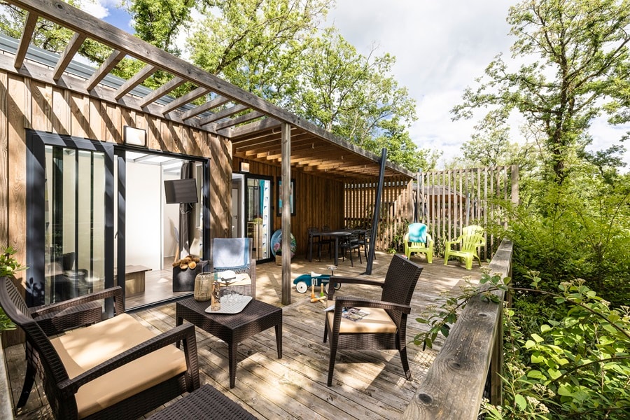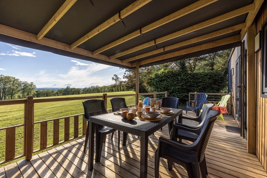 On holiday in the Lot, come and discover the charm of our PREMIUM chalet for a comfortable stay. Surface area 35m² + covered terrace of 17m² and terrace extension of 20m², giving a furnished terrace of 37m² for enjoying the great outdoors and the Lot countryside.