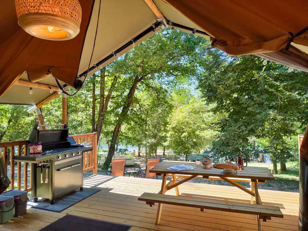 Hundefreuntlich, der Hund konnte überall mit hin, außer an den Pool. Der Fluss ist durch Steine geprägt und der Einstieg etwas rutschig. Er lädt aber zum Baden mit seinem Hund ein, Kanu und SUP sind auch möglich. Die Strömung ist sehr gering.