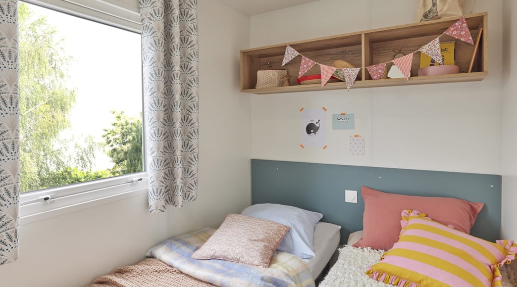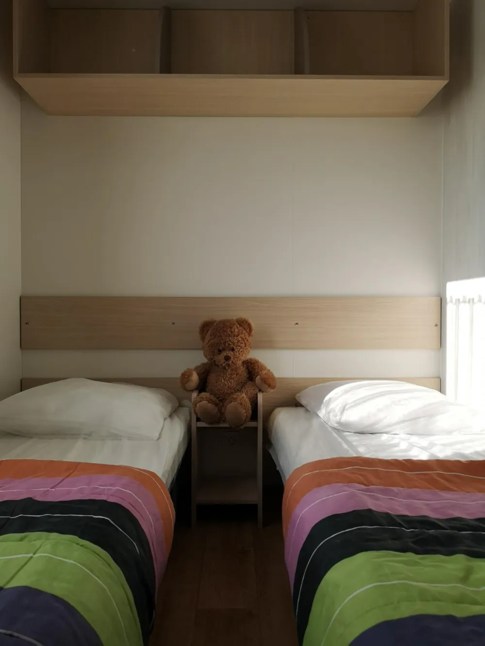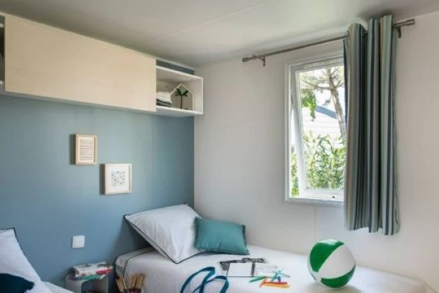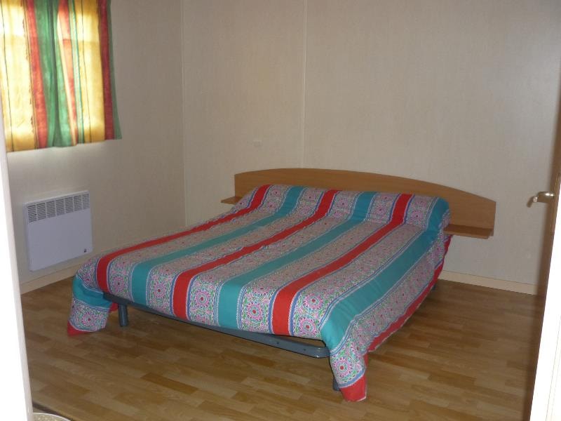 Mobile home, less than 7 years old, installed on a 150 to 180 sqm pitch, including 2 bedrooms with a 140 cm width double bed - 2 twin bedroom with 2 x 80 cm width single beds, blackout and mosquito net blinds on bedrooms window- equipped kitchen (cooking plate with ewtractor hood, fridge-freezer, sink, microwave, coffee maker...) – table and chairs – tv – 2 bathrooms (washbasin, shower) – toilets – large wooden covered terrace of 18 sqm with garden furniture and deck chairs.