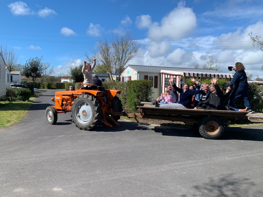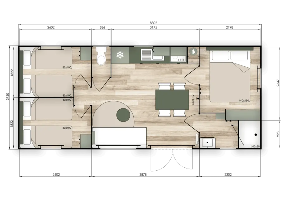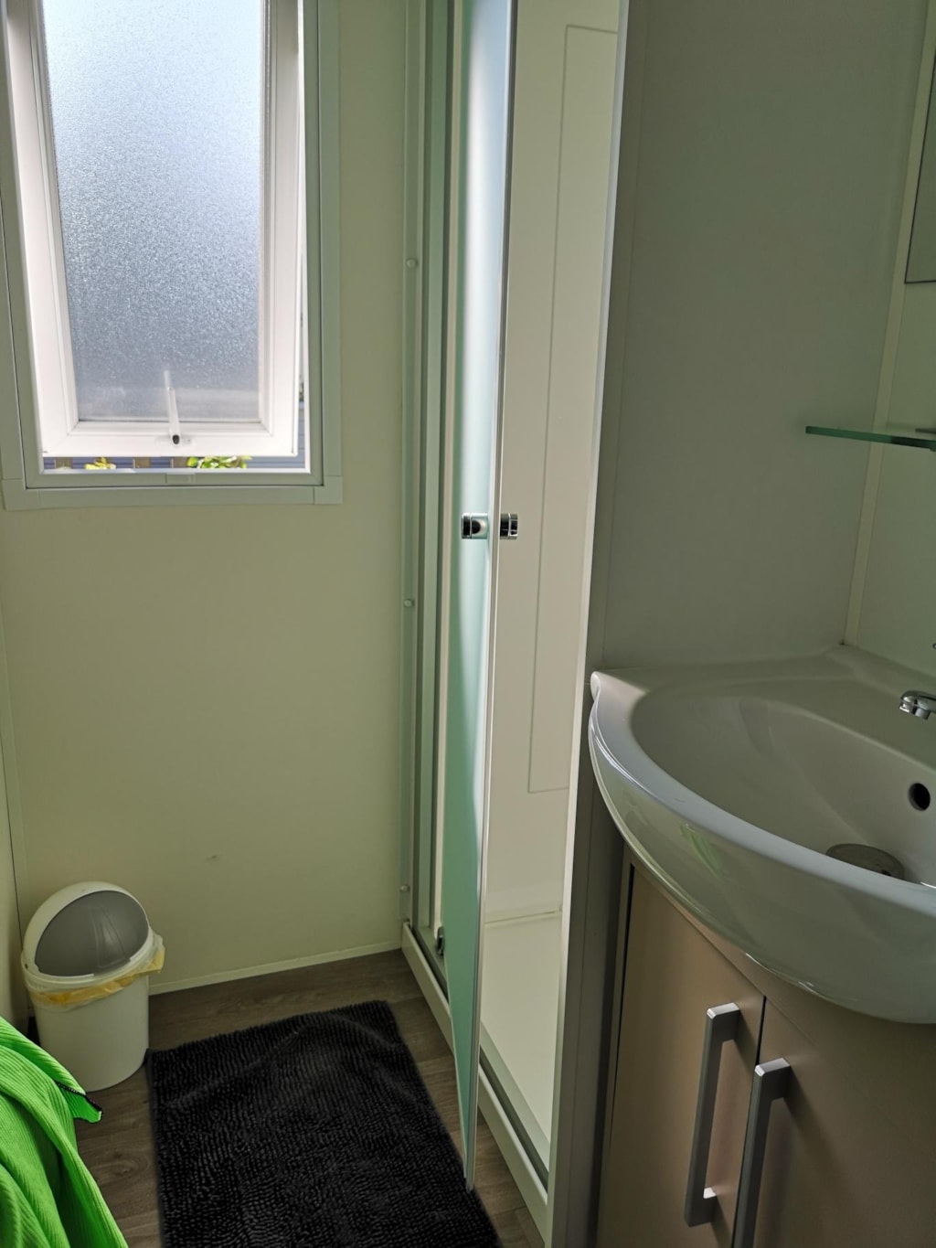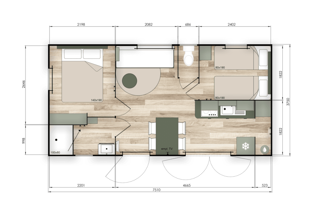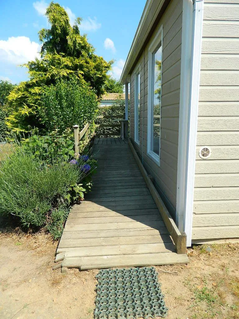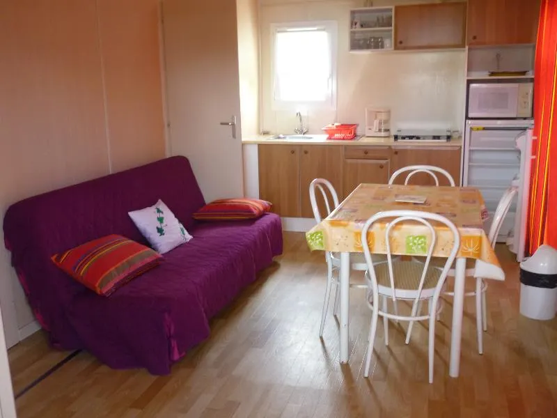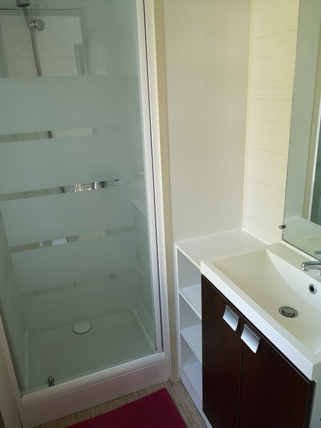 Mobile home, less than 7 years old, installed on a 130 to 150 sqm pitch, including 1 bedroom with a 140 cm width double bed - 2 twin bedrooms with 2 x 80 cm width single beds, blackout and mosquito net blinds on bedrooms window- equipped kitchen (cooking plate with ewtractor hood, fridge-freezer, sink, microwave, coffee maker...) – table and chairs – tv – bathroom (washbasin, shower) – toilets – large wooden covered terrace of 18 sqm with garden furniture and deck chairs.