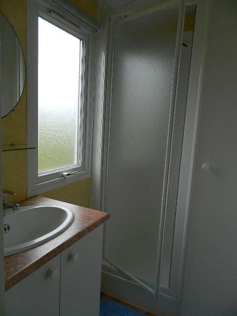 Mobile home, over 10 years old, installed on a 180 sqm pitch, including 1 bedroom with a 140 cm width double bed, private bathroom (washbasin, shower) - 2 twin bedrooms with 80 cm width single beds- equipped kitchen (cooking plate, fridge-freezer, sink, microwave, coffee maker...) – table and chairs – tv – bathroom (washbasin, shower) – toilets – wooden half covered terrace, with garden furniture and deck chairs