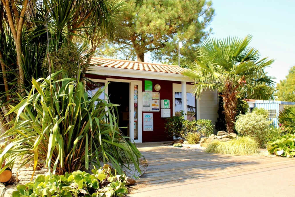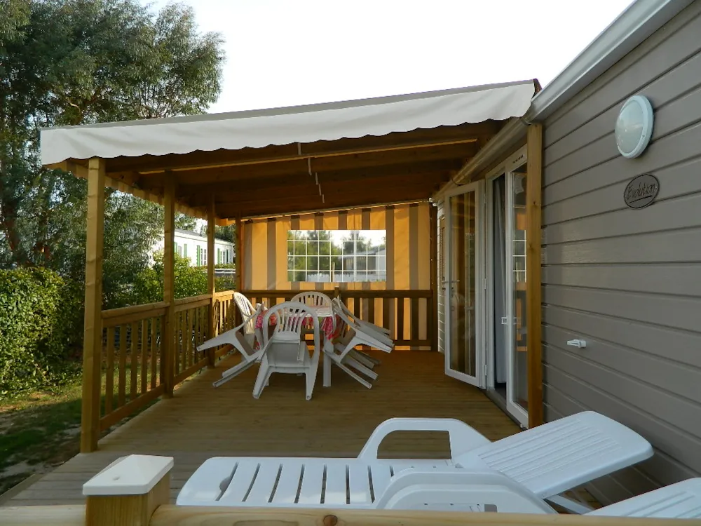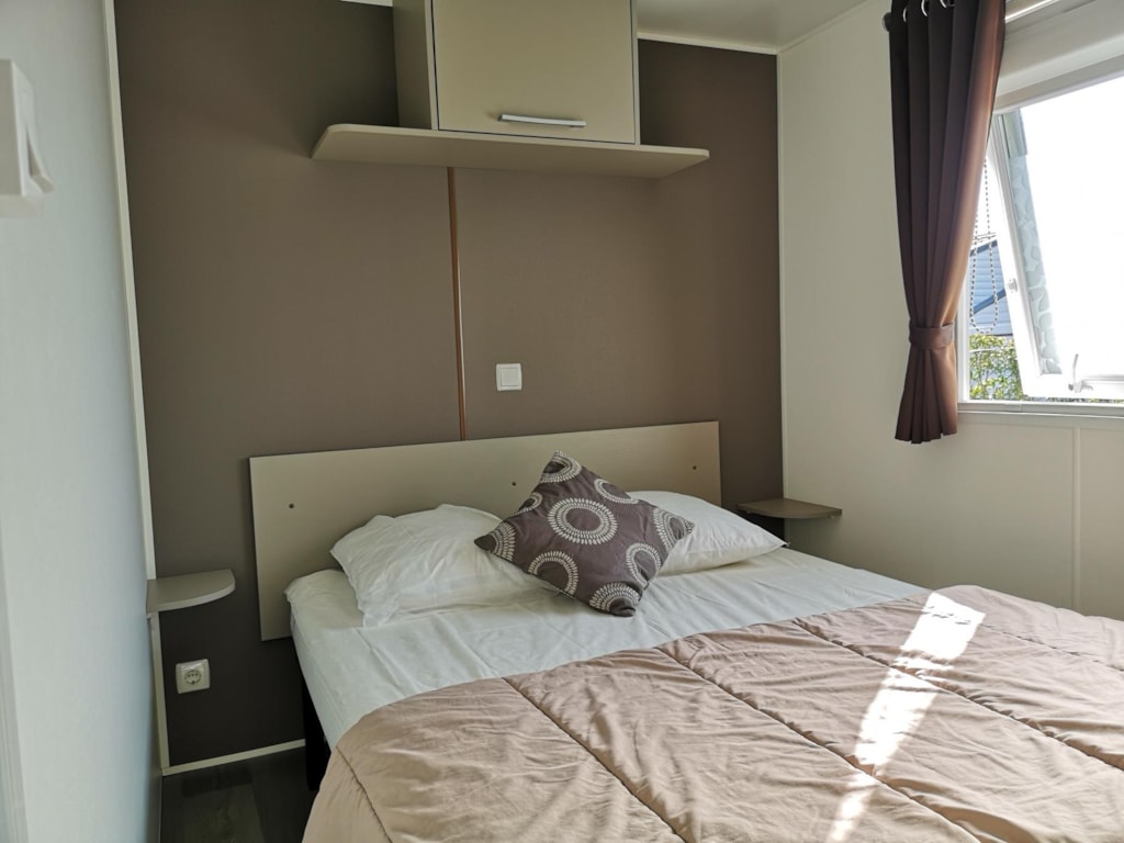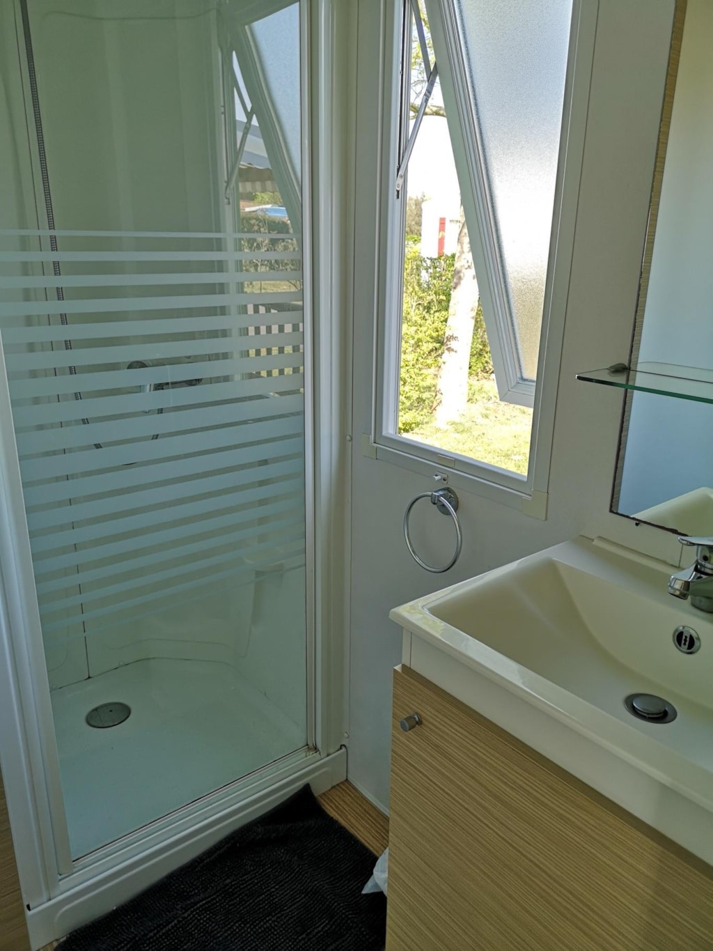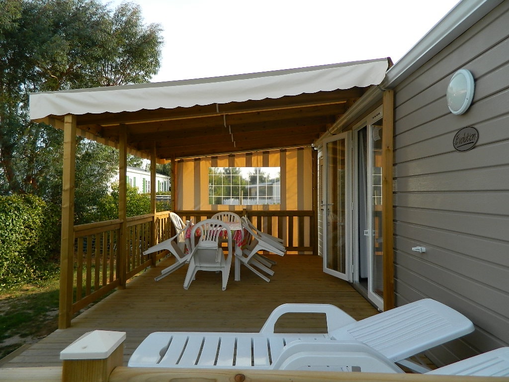 Mobile home, less than 7 years old, installed on a 130 to 150 sqm pitch, including 1 bedroom with a 140 cm width double bed - 1 bedroom with 2 x 80 cm width single beds, blackout and mosquito net blinds on bedrooms window- equipped kitchen (cooking plate with ewtractor hood, fridge-freezer, sink, dish-washer, microwave, coffee maker, air conditioning...) – table and chairs – tv – bathroom (washbasin, shower) – toilets – large wooden covered terrace of 18sqm with garden furniture and deck chairs, plancha.