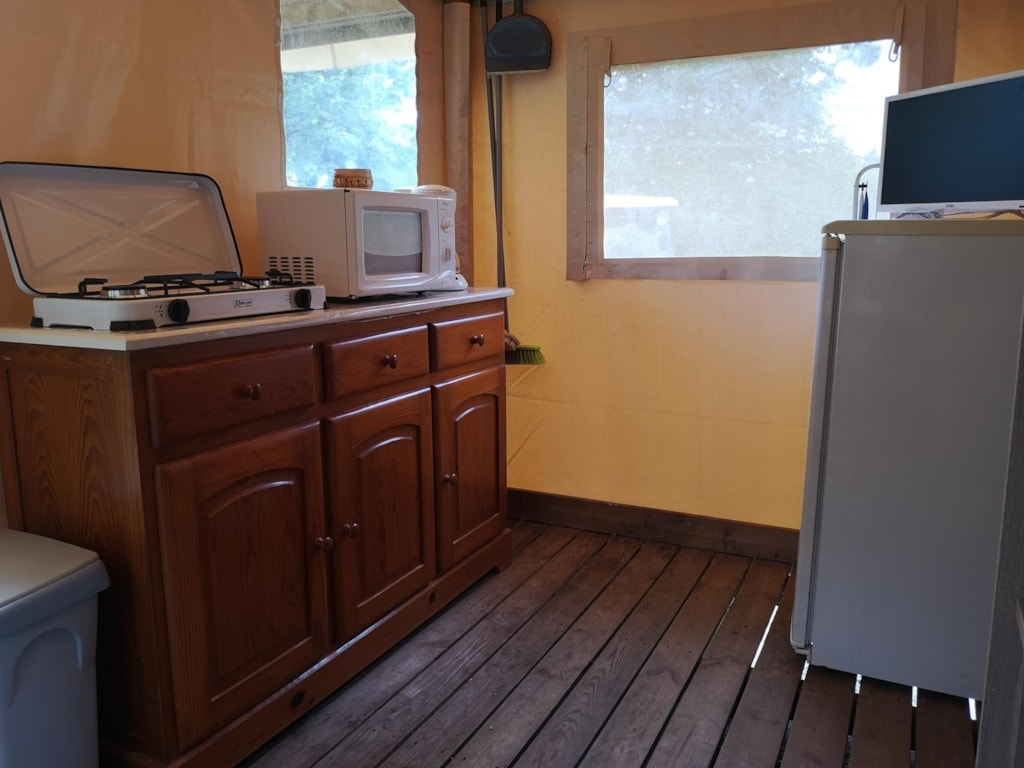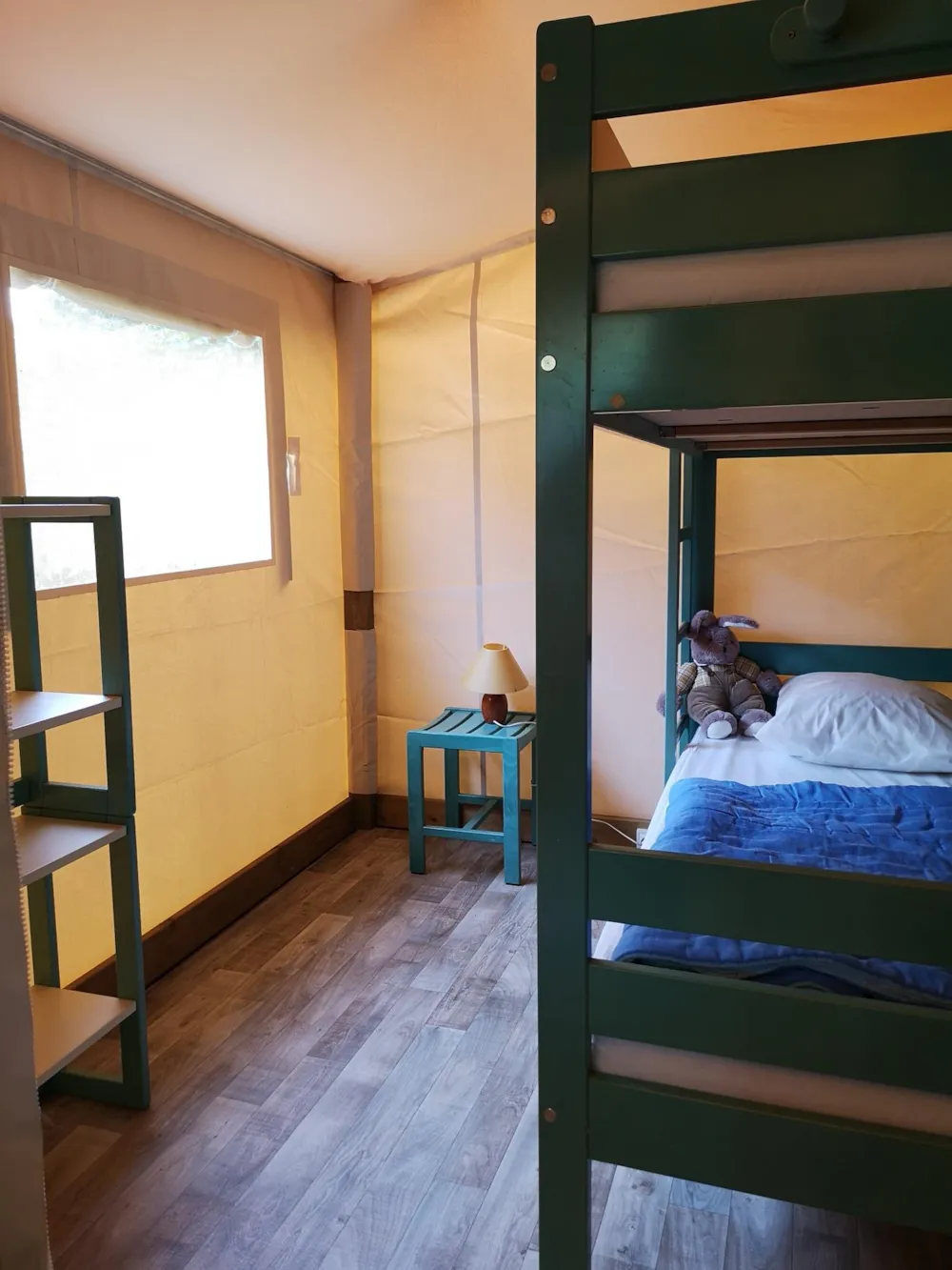 Cette Lodge toilée de 20 m² est l'hébergement le plus économique de notre gamme. Vous trouverez 1 chambre avec un lit double, 1 chambre avec lits superposés simples, une salle à manger avec télévison, réfrigérateur et kitchenette. Hébergement sans sanitaire mais fontaine et bloc sanitaire à proximité. Un porche couvert avec salon de jardin, barbecue à charbon et relax en prolongement de votre hébergement.