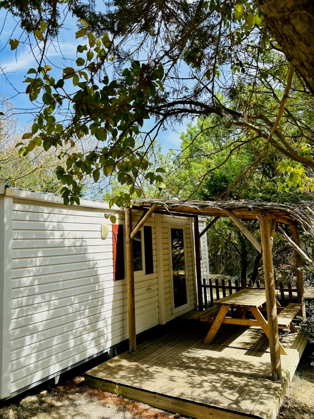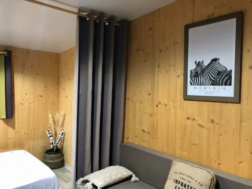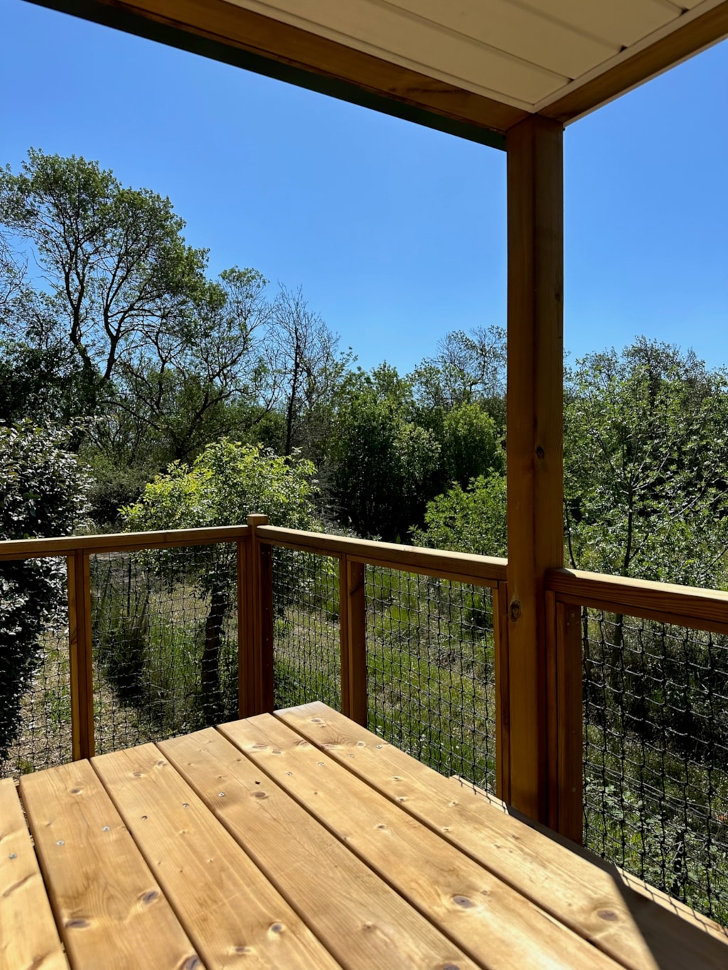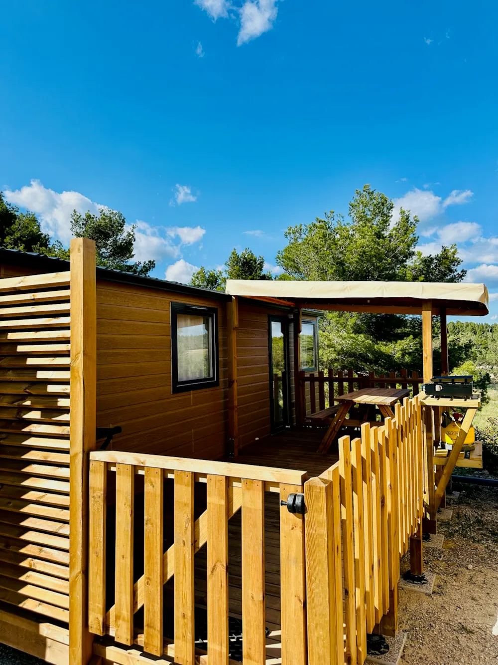 SIGNATURE BELVEO (2 Schlafzimmer) von 35 m², komplett ausgestattet + halbüberdachte Terrasse von 15 m², gesichert durch ein Tor + Gartentisch. Eine außergewöhnliche Unterkunft, geräumig und hell, hoch oben auf einer Felsformation gelegen, von wo aus Sie einen Teil des afrikanischen Reservats sehen können.
