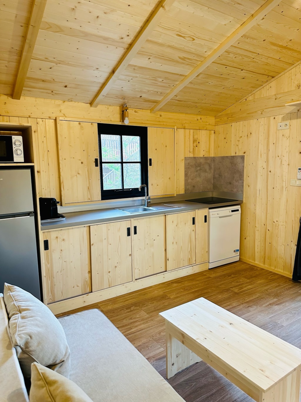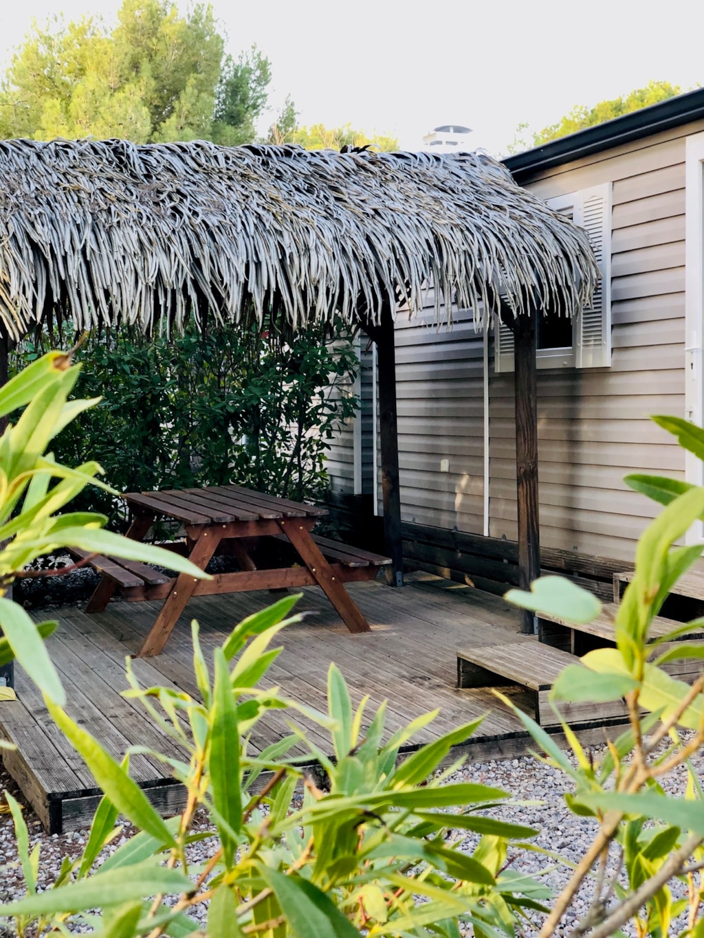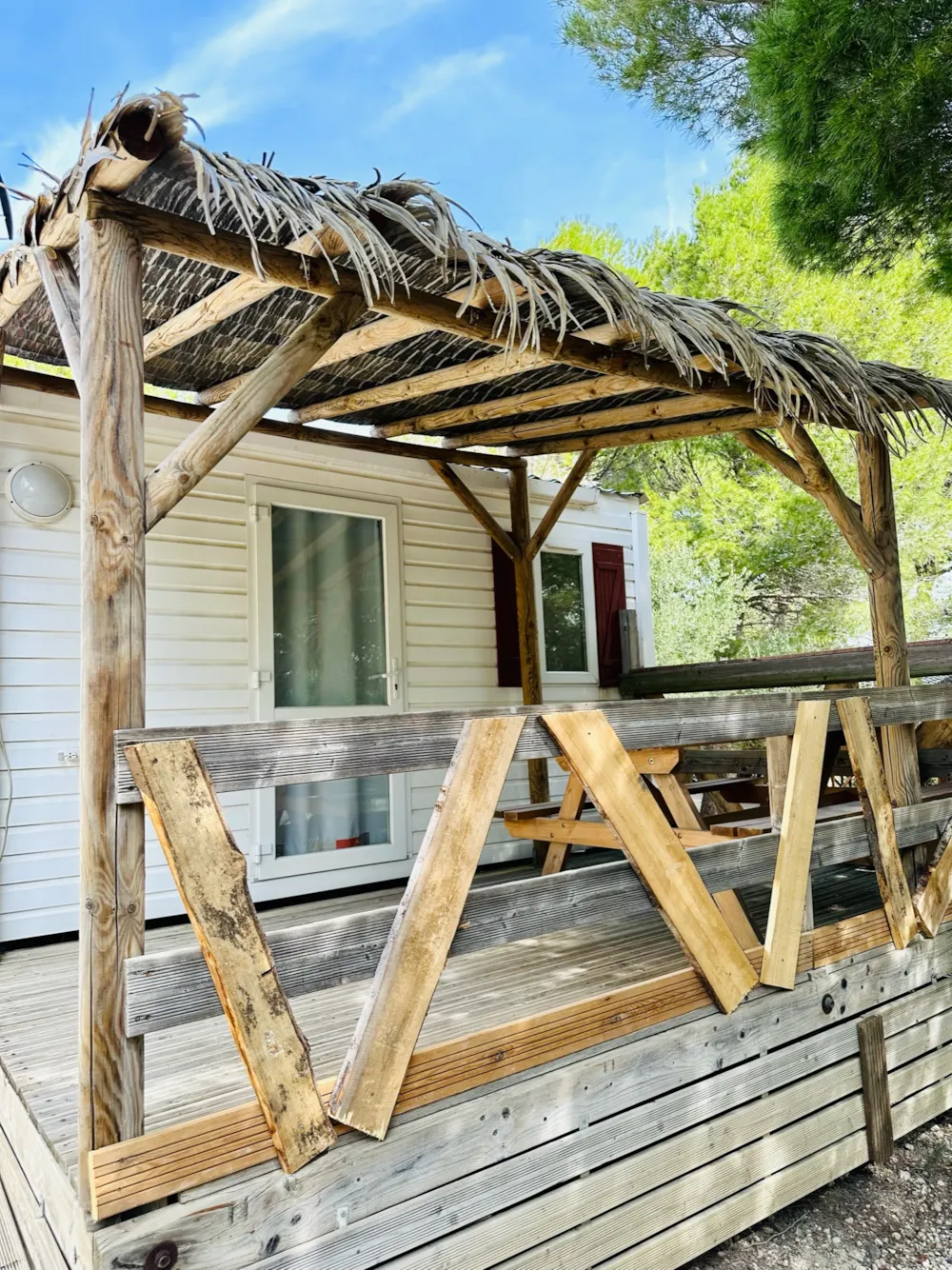 SIGNATURE BELVEO (2 Schlafzimmer) von 35 m², komplett ausgestattet + halbüberdachte Terrasse von 15 m², gesichert durch ein Tor + Gartentisch. Eine außergewöhnliche Unterkunft, geräumig und hell, hoch oben auf einer Felsformation gelegen, von wo aus Sie einen Teil des afrikanischen Reservats sehen können.