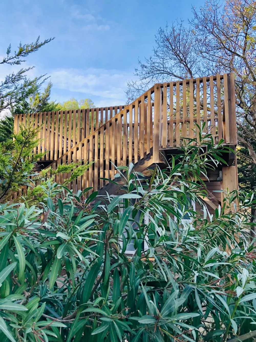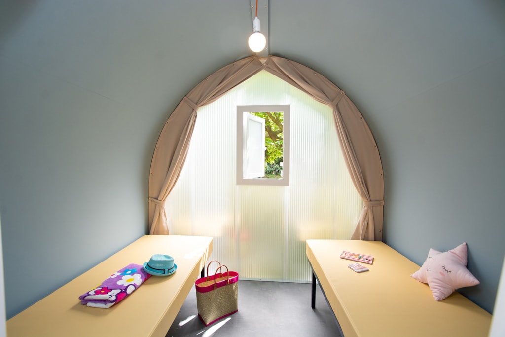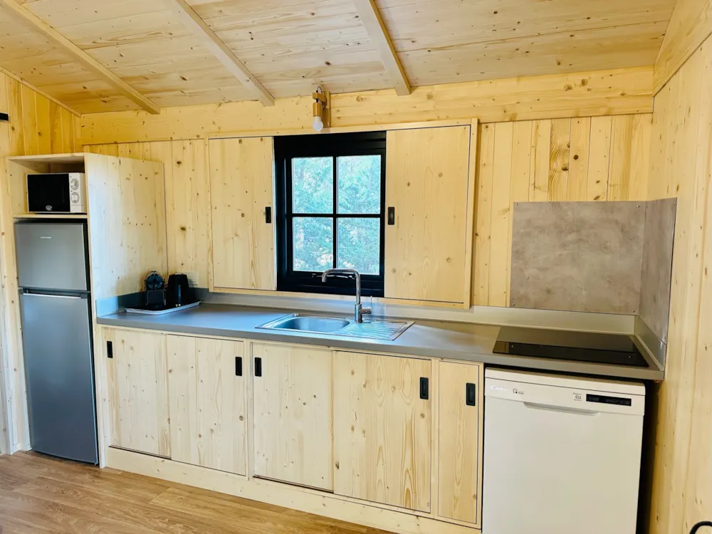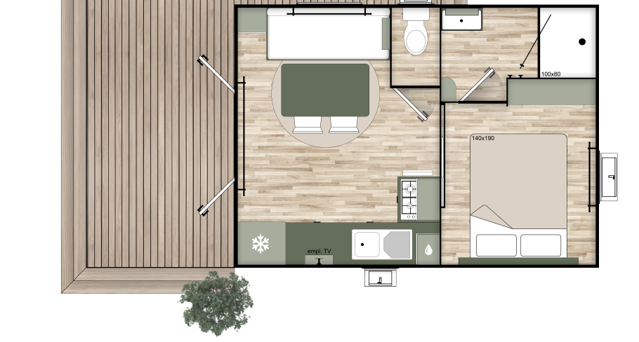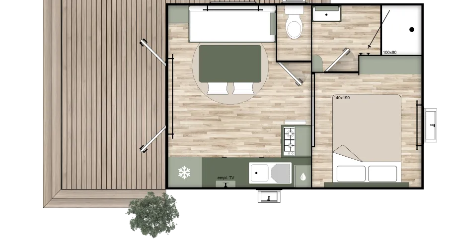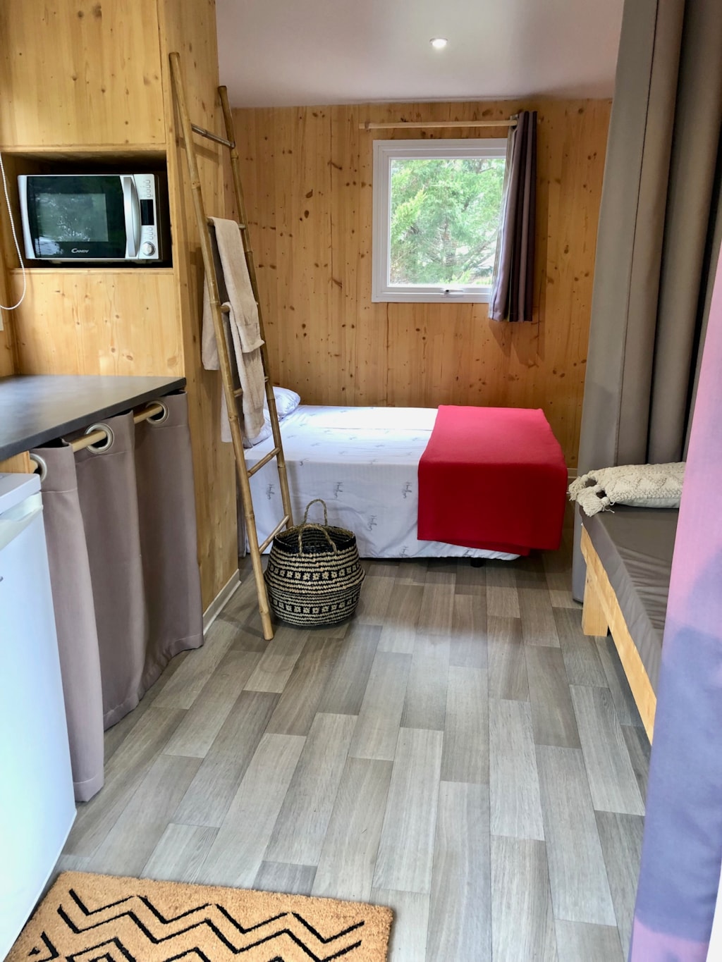 SIGNATURE BELVEO (2 Schlafzimmer) von 35 m², komplett ausgestattet + halbüberdachte Terrasse von 15 m², gesichert durch ein Tor + Gartentisch. Eine außergewöhnliche Unterkunft, geräumig und hell, hoch oben auf einer Felsformation gelegen, von wo aus Sie einen Teil des afrikanischen Reservats sehen können.