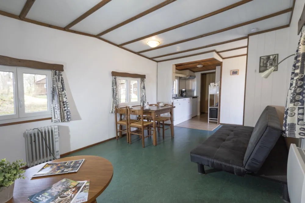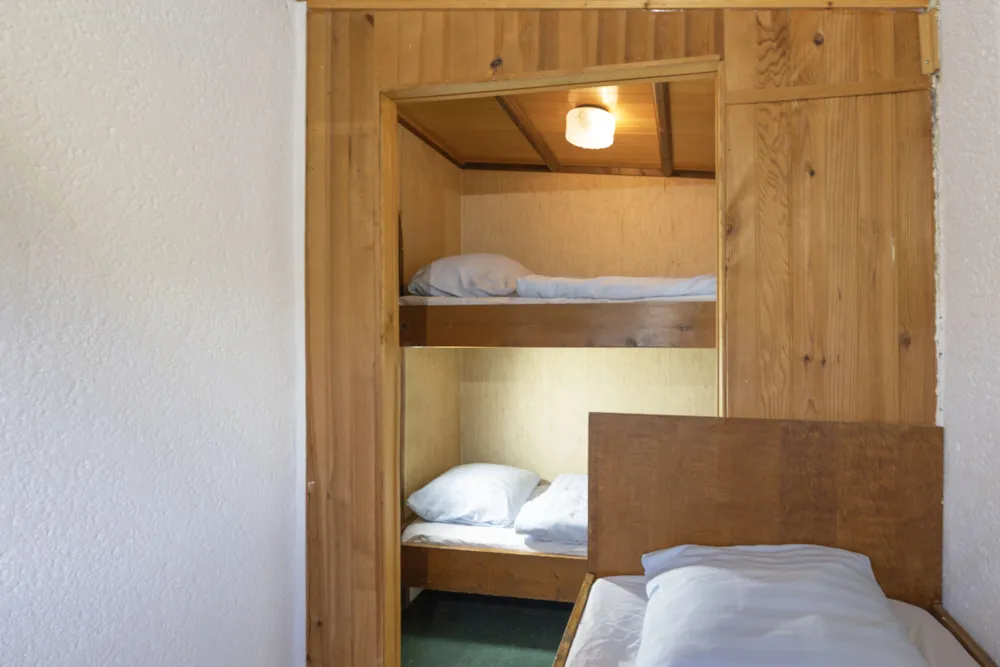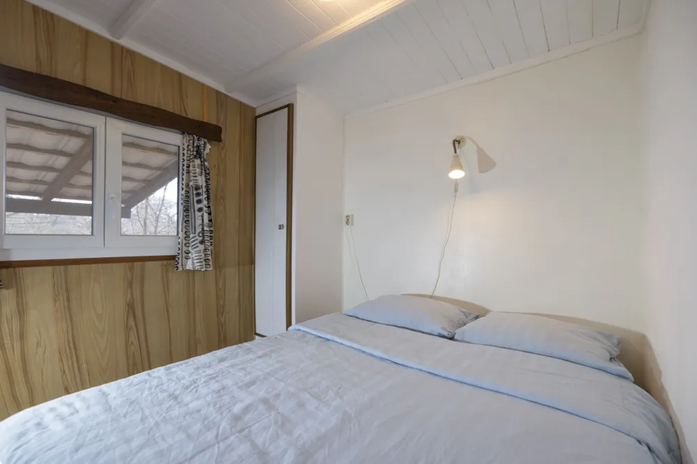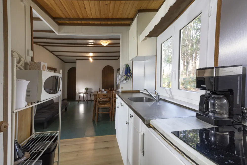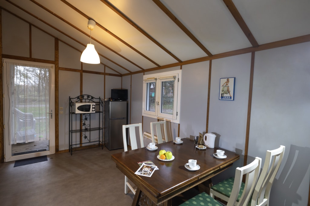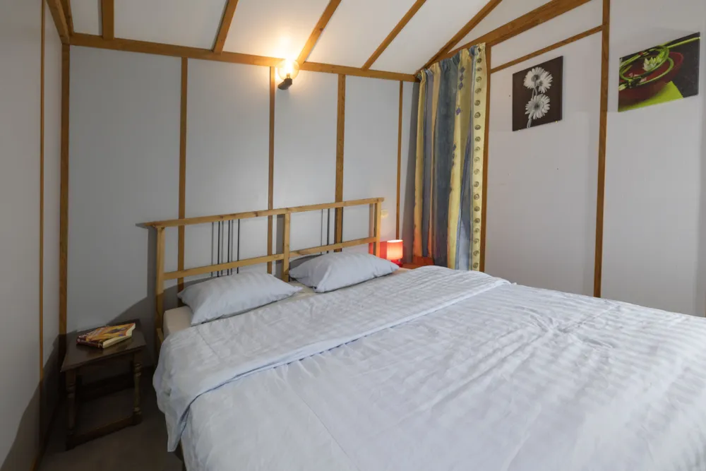 Chalet Etoilé style Campagnarde: N°8, max 4 people 36 m² + 12 m² covered terrace with barbecue and outdoor lounge, with a private garden of 80m². 1 bedroom with 1 double bed, 1 bedroom with 2 single beds, 1 living/dining room with 1 sofa bed, 1 fully-equipped kitchen: electric hob, extractor fan, fridge and coffee maker, 1 shower room/WC. Electric heating. Blankets and pillows provided.
