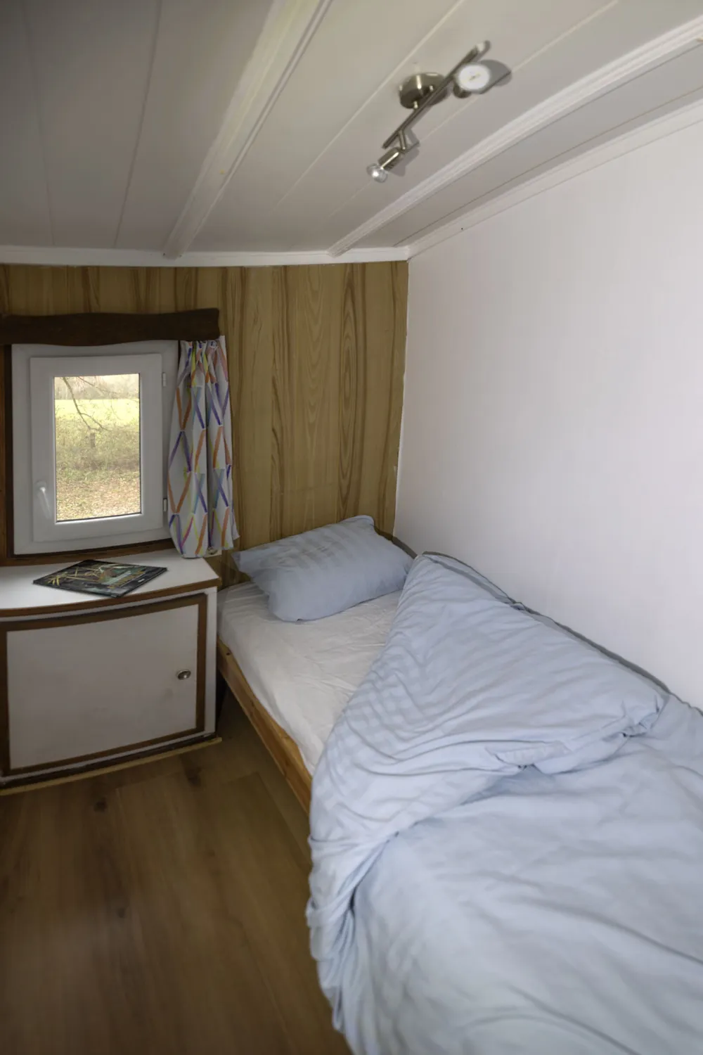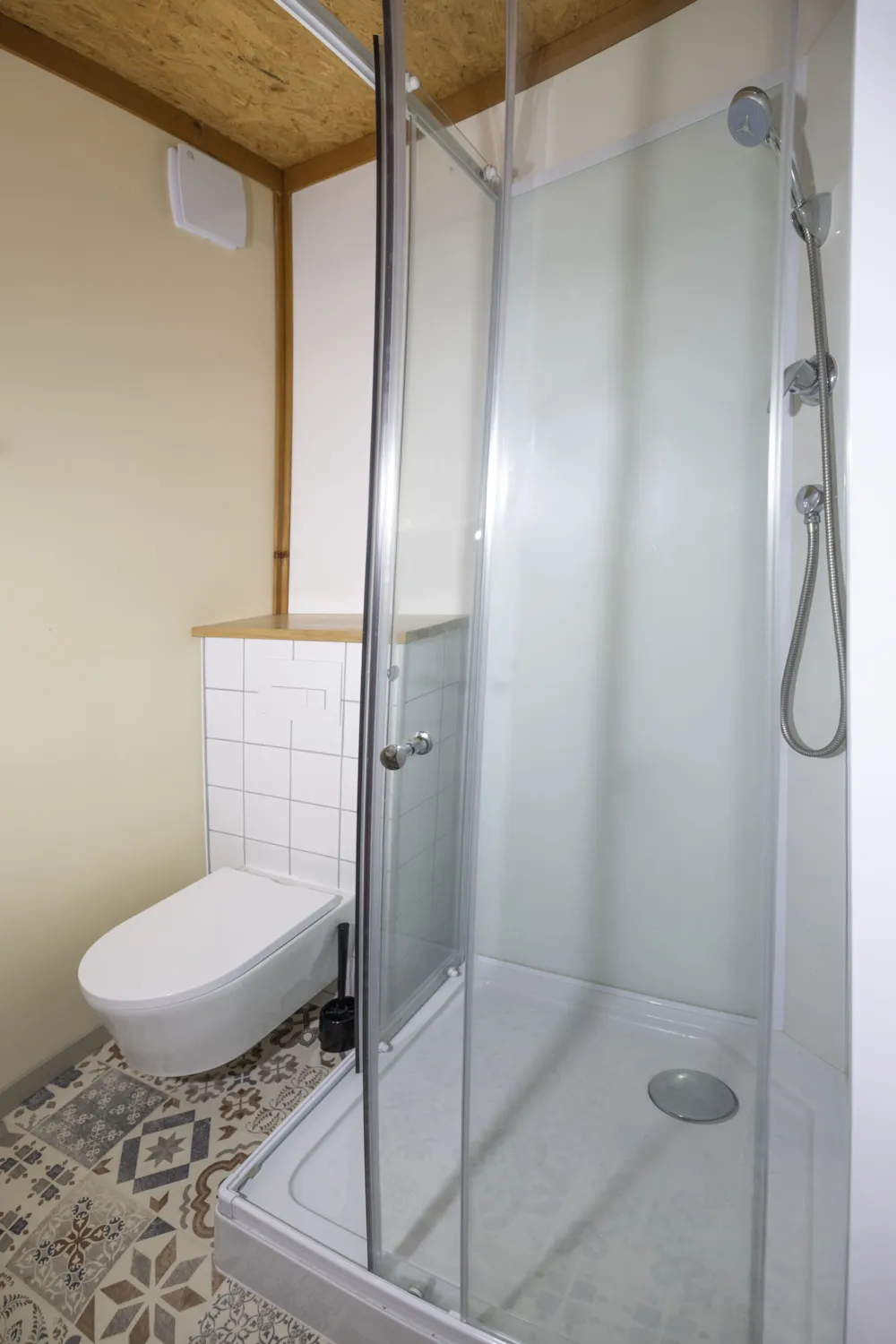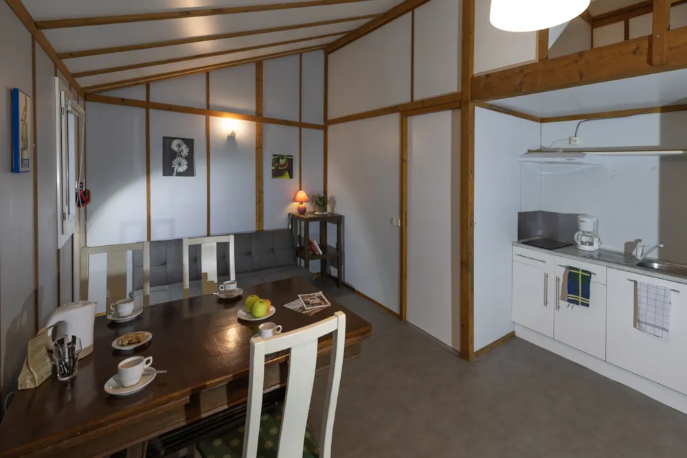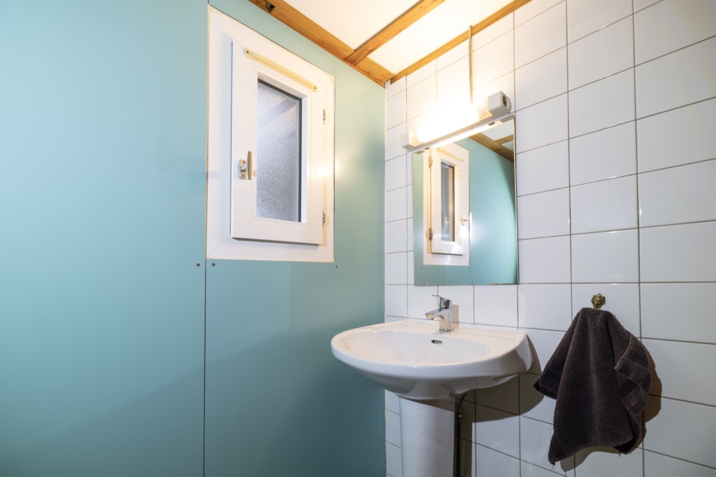 Chalet Etoilé style Campagnarde: N°8, max 4 people 36 m² + 12 m² covered terrace with barbecue and outdoor lounge, with a private garden of 80m². 1 bedroom with 1 double bed, 1 bedroom with 2 single beds, 1 living/dining room with 1 sofa bed, 1 fully-equipped kitchen: electric hob, extractor fan, fridge and coffee maker, 1 shower room/WC. Electric heating. Blankets and pillows provided.