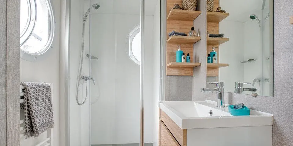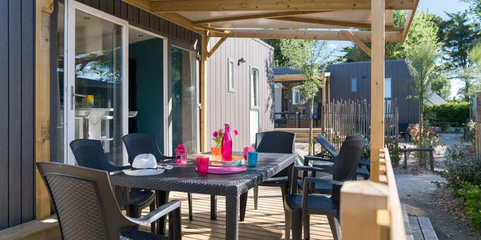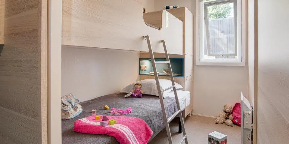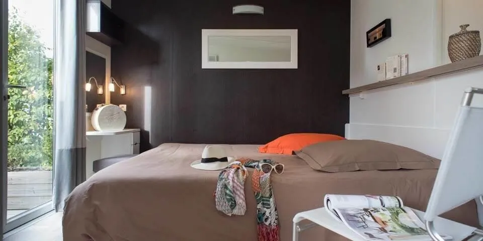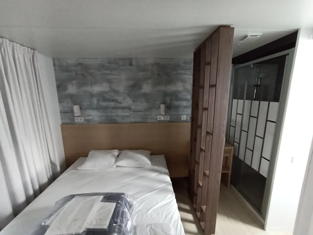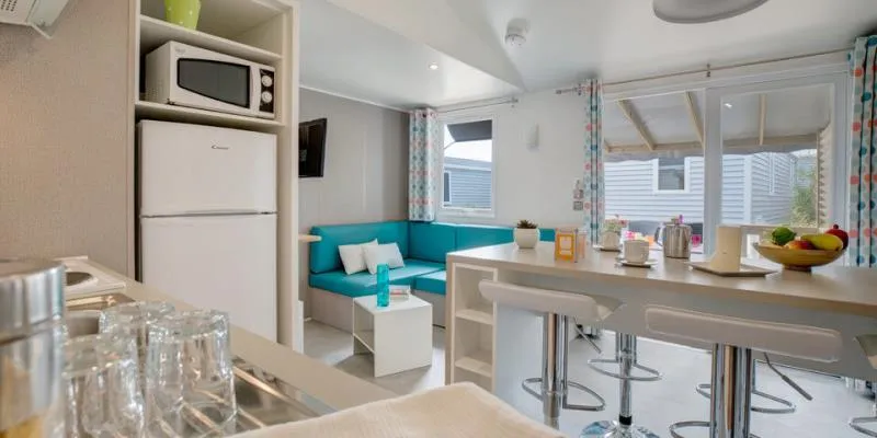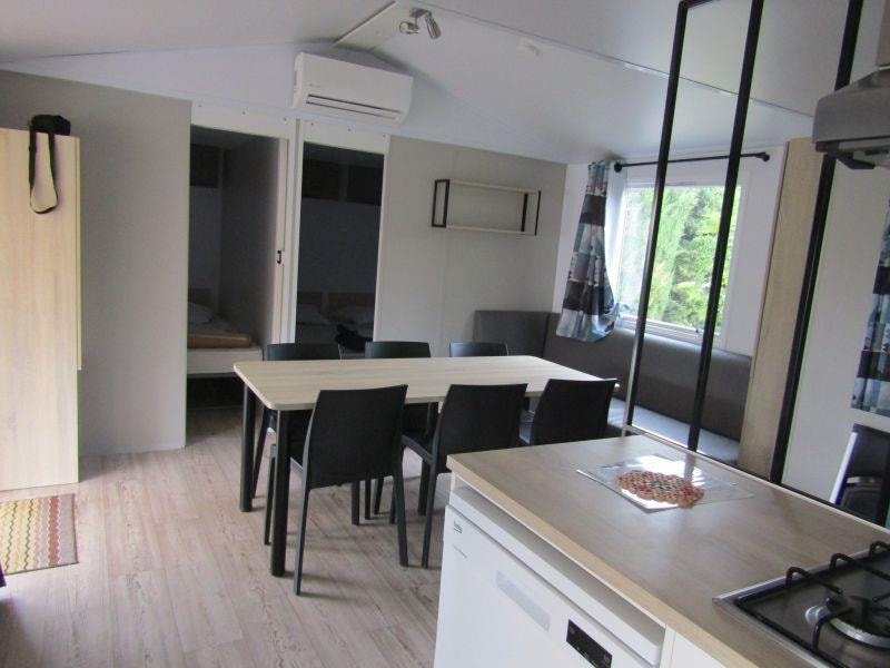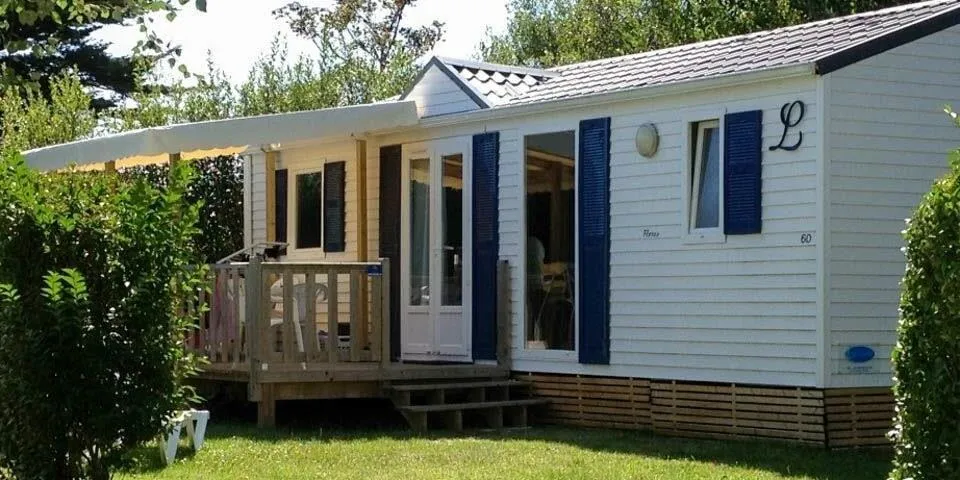 Le Mobil Home dispose de : 1 Chambre avec 1 lit double 160X190cm avec douche et lavabo. 1 Chambre avec 2 lits simples 80X190cm. 1 Chambre lits superposés 80X190cm. Une salle de bain avec douche, lavabo et WC. 1 Cuisine équipée d'un frigo, plaque de cuisson, micro-ondes, lave-vaisselle, grille pain, bouilloire, cafetière nespresso. Le salon dispose d'une table avec chaises, banquette et TV. La terrasse est en bois avec un salon de jardin, transats/chiliennes et plancha ou BBQ. Infos: Les draps sont fournis pour le séjour (changement facturé sur demande). Uniquement côté mer Photos non contractuelles