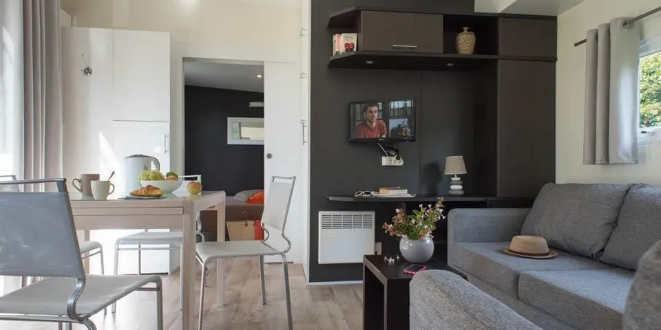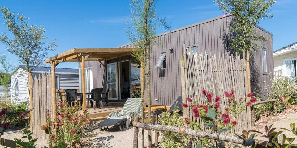 Le mobil-home Confort a un superficie à partir de 27m² avec 2 chambres (1 grand lit 140 x 190 , 2 lits simples 80 x 190), séjour avec banquette se transformant en lit double, chauffage électrique, cuisine équipée, gaz 4 feux, réfrigérateur, micro-ondes, cafetière électrique, WC et douche séparés. Terrasse, salon de jardin, 2 chiliennes. Les couvertures et oreillers sont fournis.