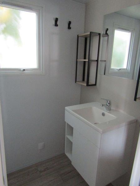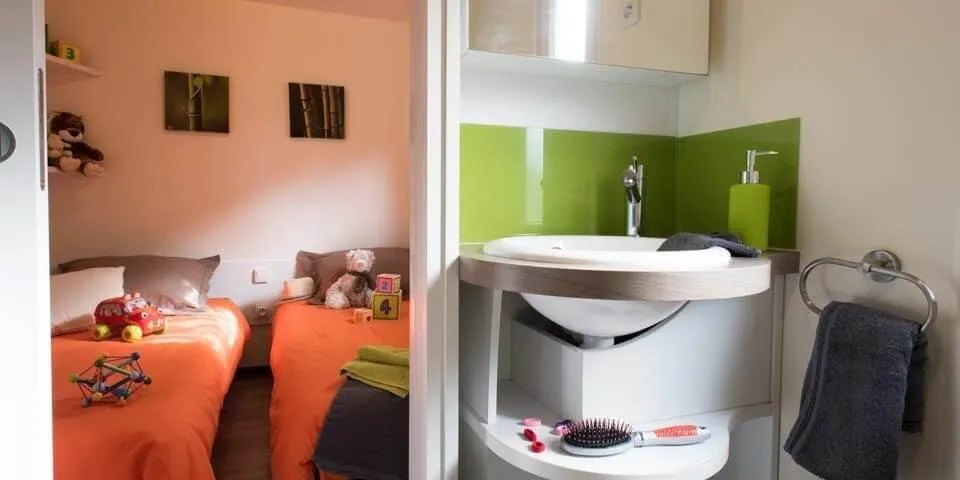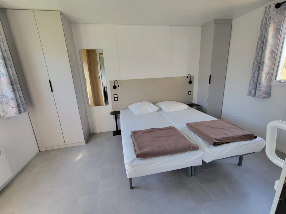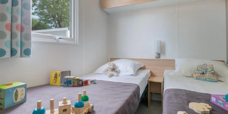 Mobil Home pour les PERSONNES A MOBILITE REDUITE (HANDICAP) Il dispose : 1 Chambre avec 2 lits de 80X190cm. 1 Chambre avec 1 lit simple 80X190cm + 1 lit en hauteur 80X190cm. 1 Salle de bain avec douche, lavabo, WC. 1 Cuisine équipée d'un frigo, gazinière 4 feux, micro-ondes, cafetière électrique. 1 Salon avec table, chaises et banquette. 1 Terrasse en bois, avec un salon de jardin, transats/chieliennes. Infos : Les couvertures ou couettes et oreillers sont fournis. Le inge de lit, le linge de toilette et les produits d'entretiens ne sont pas fournis. Photos non contractuelles