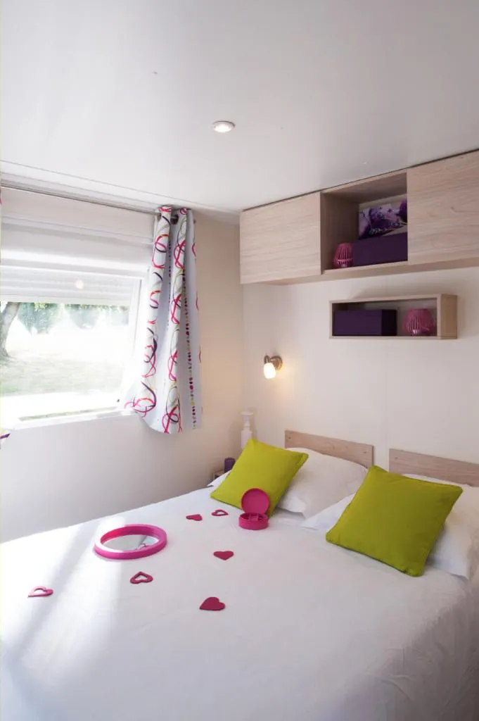 Le Mobil Home dispose de : 1 Chambre avec 1 lit double 140X190cm. 1 Chambre avec 2 lits simples 80X190cm. Une salle de bain avec douche, lavabo et WC. 1 Cuisine équipée d'un frigo, gazinière 4 feux, micro-ondes, cafetière électrique. Le salon dispose d'une table avec chaises et banquette. La terrasse est en bois avec un salon de jardin, transats/chiliennes. Infos: Les couvertures ou couettes et oreillers sont fournis. Cependant, le linge de lit ( en location), le linge de toilette et produits d'entretien ne sont pas fournis. Parasol à disposition si la terrasse est non couverte Uniquement côté parc Photos non contractuelles
