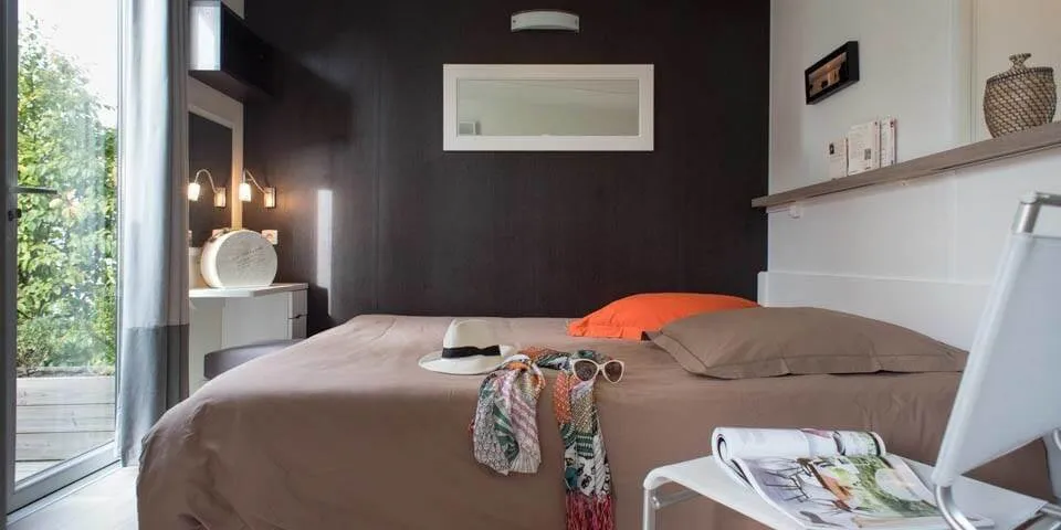 Le Mobil Home dispose de : 1 Chambre avec 1 lit double 140X190cm. Une salle de bain avec douche, lavabo et WC. 1 Cuisine équipée d'un frigo, gazinière 4 feux, micro-ondes, cafetière électrique. Le salon dispose d'une table avec banquette convertible 2 personnes. La terrasse est en bois avec un salon de jardin, et transats/chiliennes. Infos: Les couvertures ou couettes et oreillers sont fournis. Cependant, le linge de lit ( en location), le linge de toilette et produits d'entretien ne sont pas fournis. Parasol à disposition si la terrasse est non couverte Photos non contractuelles