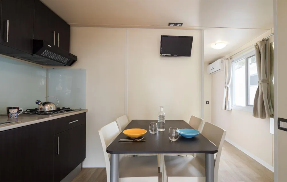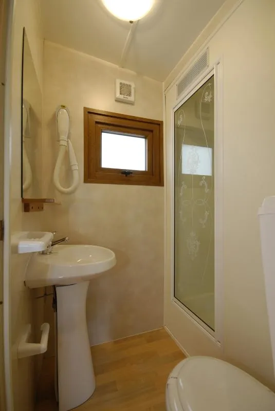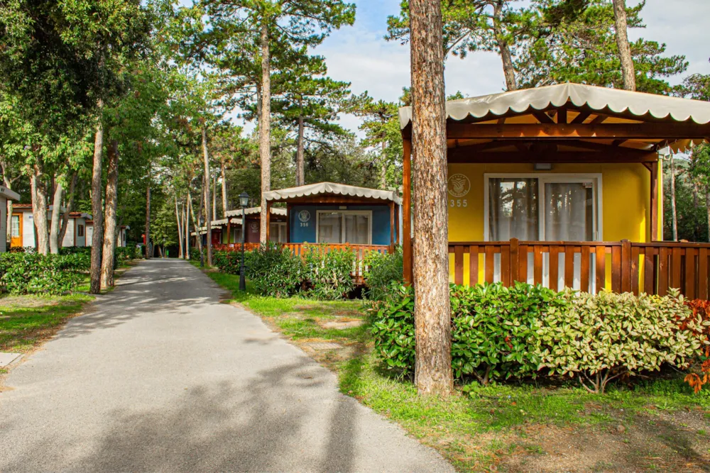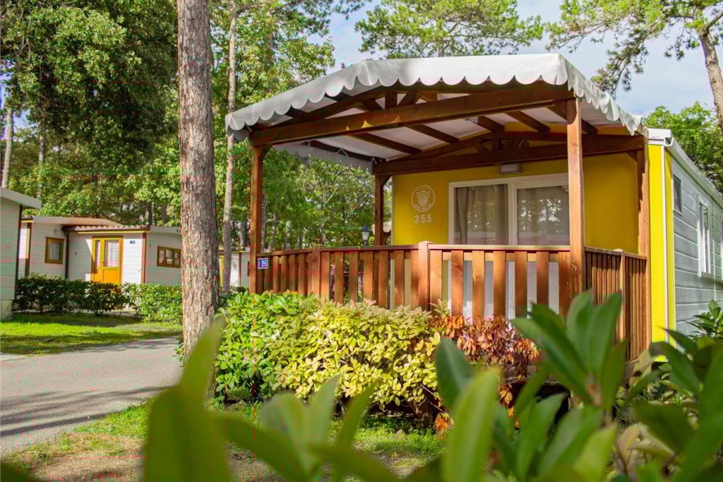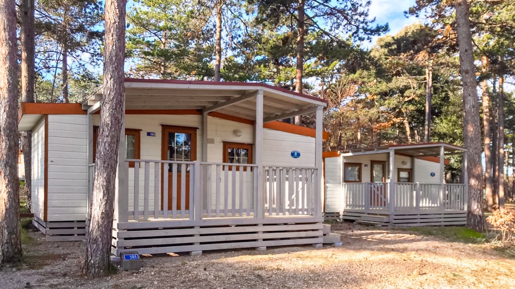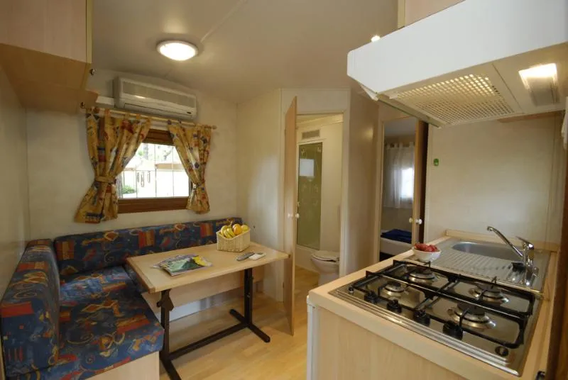 It has an area of about 31 sq.m. and can hold up to maximum of 4 adults. It is composed of a living room with table, chairs and a small sofabed, a kitchenette equipped with a column fridge with freezer, a 4-burner gas cooker, a sink, pots and pans and dishes. The sleeping area consists of 2 bedrooms, one with a double bed and a spacious bedroom with 2 single beds, which can be joined together on request. The accommodation has 1 spacious bathroom with WC, shower, bidet and washbasin. Outside, a wodden terrace with table and chairs where you can enjoy moments of relax.