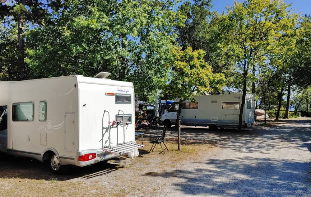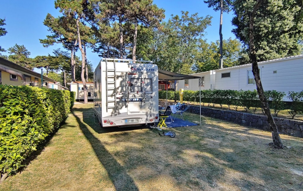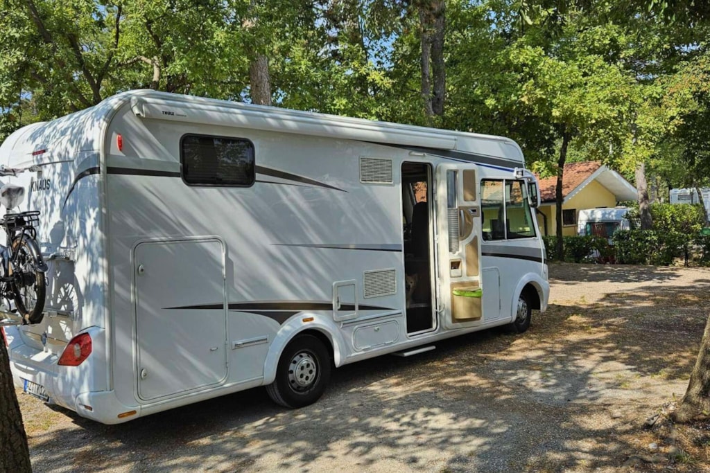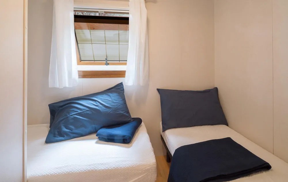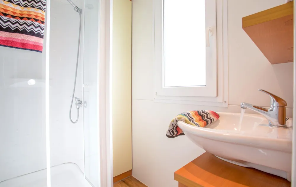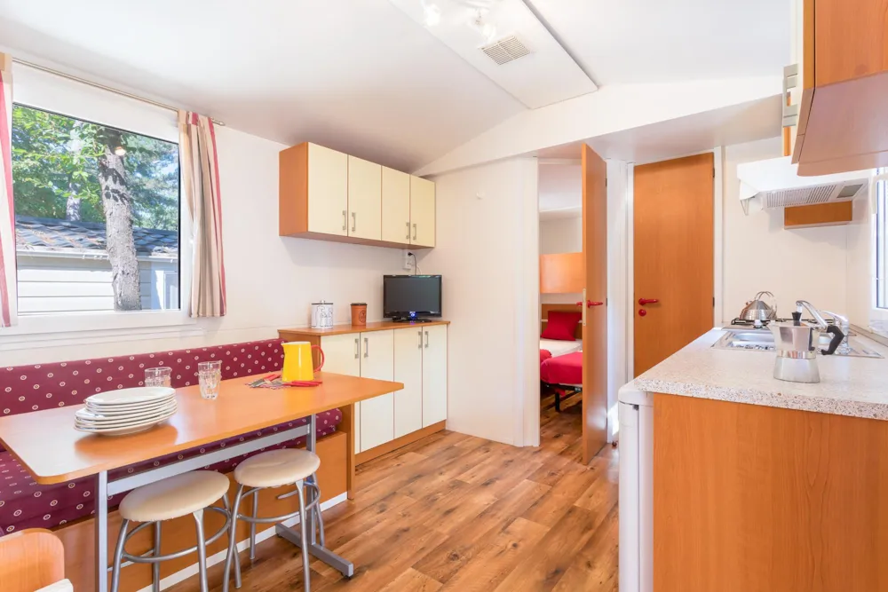 It has an area of about 31 sq.m. and can hold up to maximum of 4 adults. It is composed of a living room with table, chairs and a small sofabed, a kitchenette equipped with a column fridge with freezer, a 4-burner gas cooker, a sink, pots and pans and dishes. The sleeping area consists of 2 bedrooms, one with a double bed and a spacious bedroom with 2 single beds, which can be joined together on request. The accommodation has 1 spacious bathroom with WC, shower, bidet and washbasin. Outside, a wodden terrace with table and chairs where you can enjoy moments of relax.