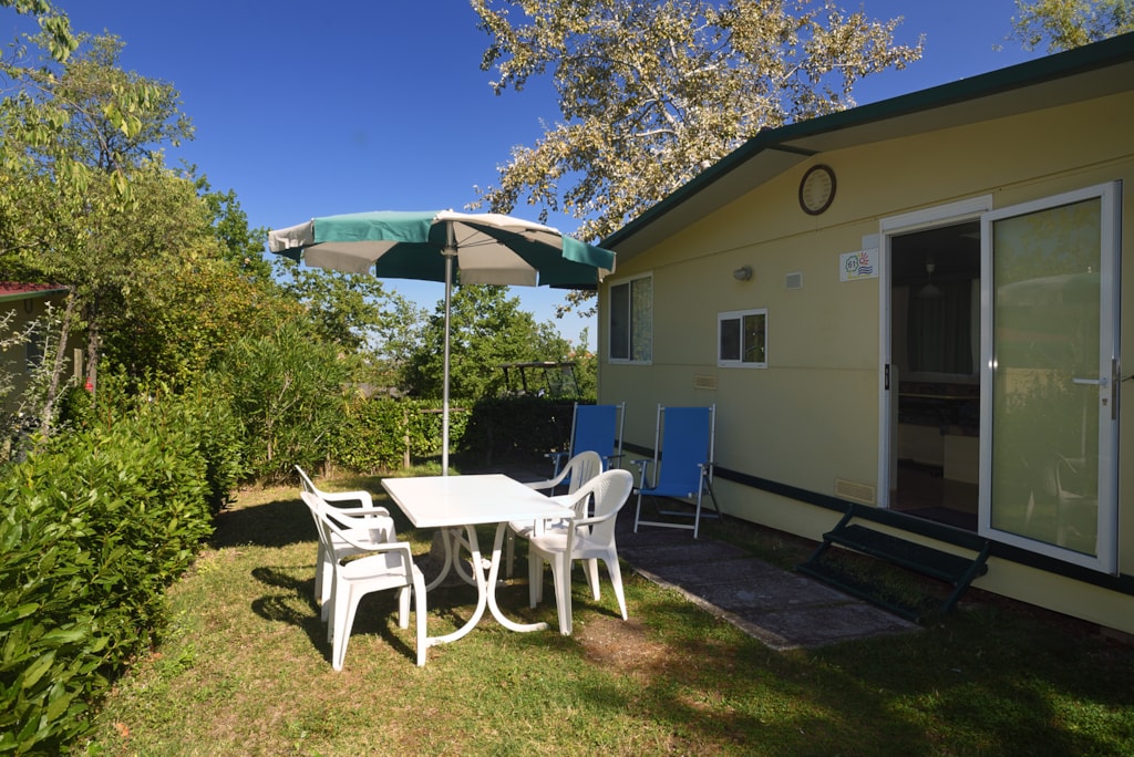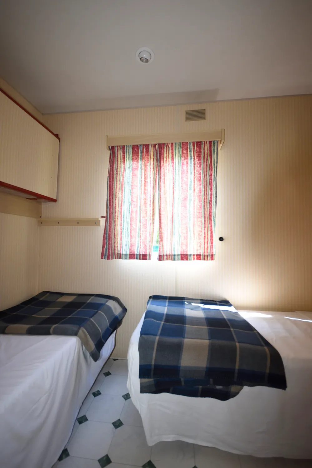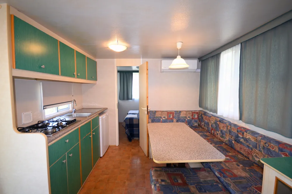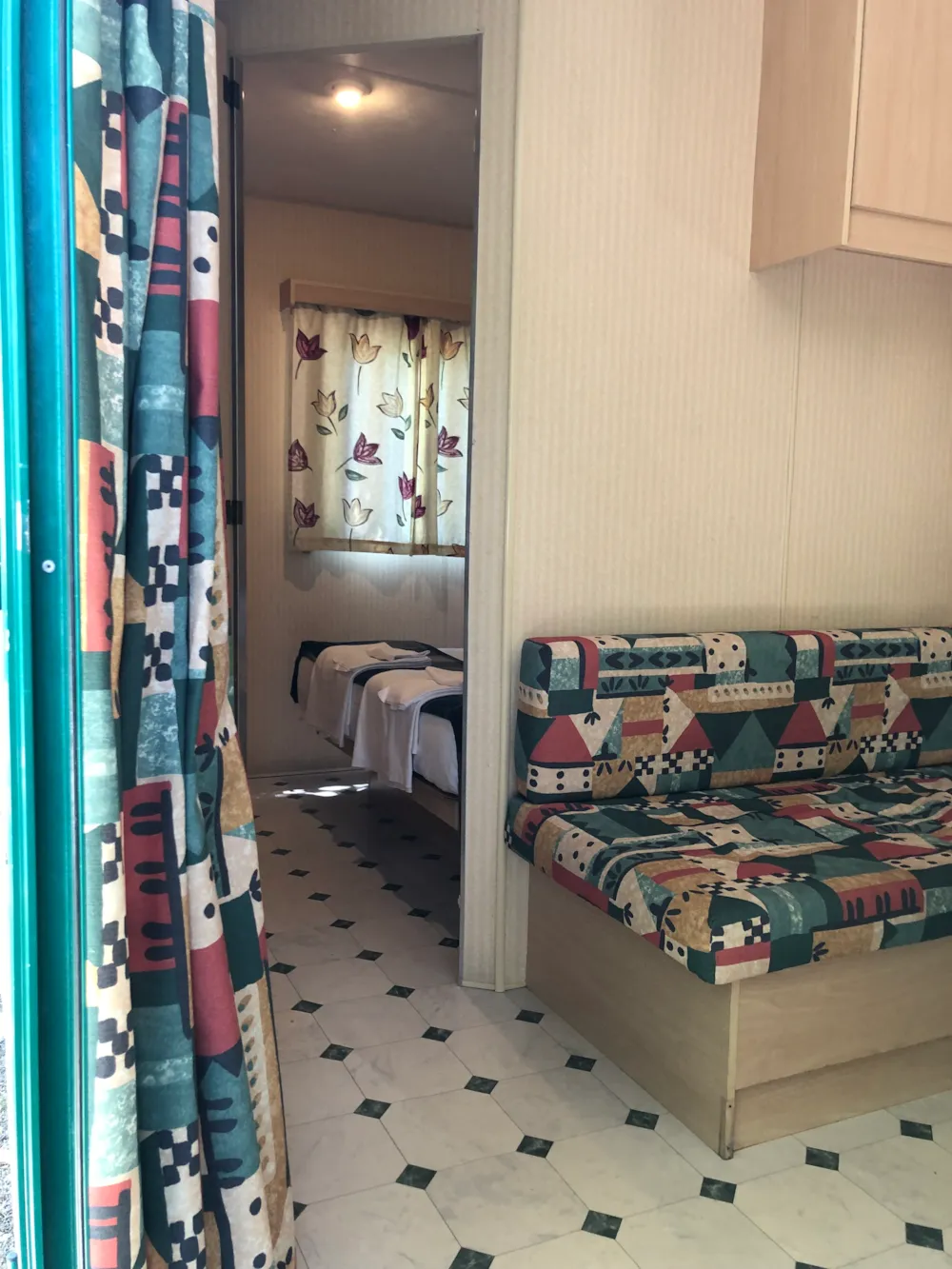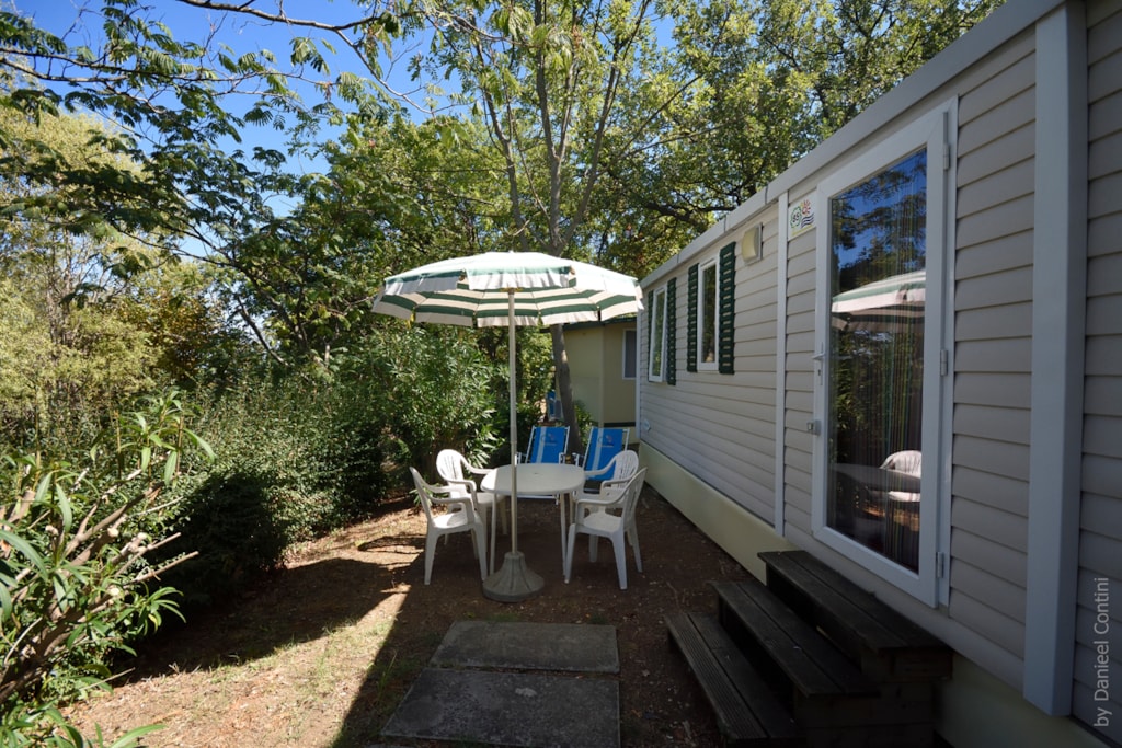 Mobile home vintage avec son petit espace jardin, équipement du camping satisfaisant